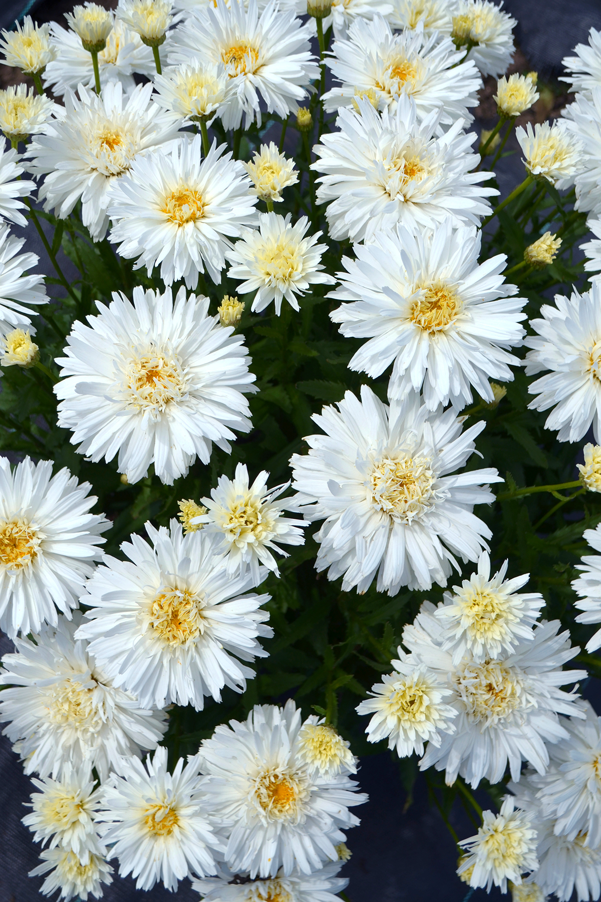 Large, double flowers composed of ice crystal-like petals. 'Mount Hood' has a perfect mounding habit and an enormous number of flowers throughout the season. Strong rebloom and overall great vigor. Each layer of flowers covers the previous bloom cycle. Multiple layers of blooms extend the season. Good foliage cover too! This Shasta daisy is destined to become a garden classic.