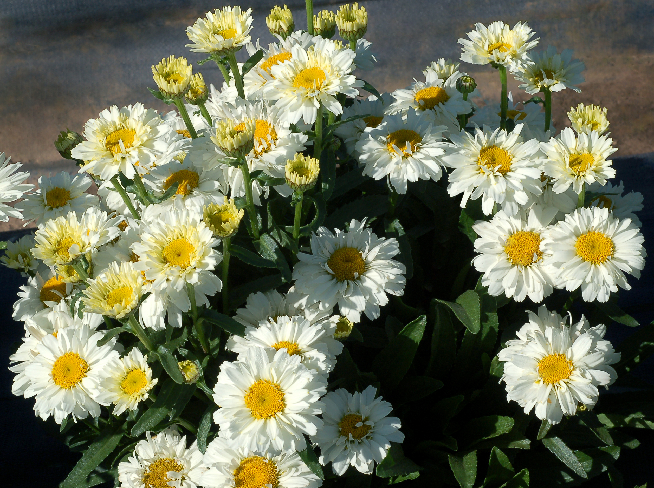 This Leucanthemum couldn't get any sweeter! The abundant multi-layered pure white flowers completely cover the foliage. Low to the ground but tight, heavy branching creates an extended bloom time with successive flowers opening on top of previous blooms. Wide base but petite habit lends itself well to sunny borders, up front and center in beds, or great for mixed containers.