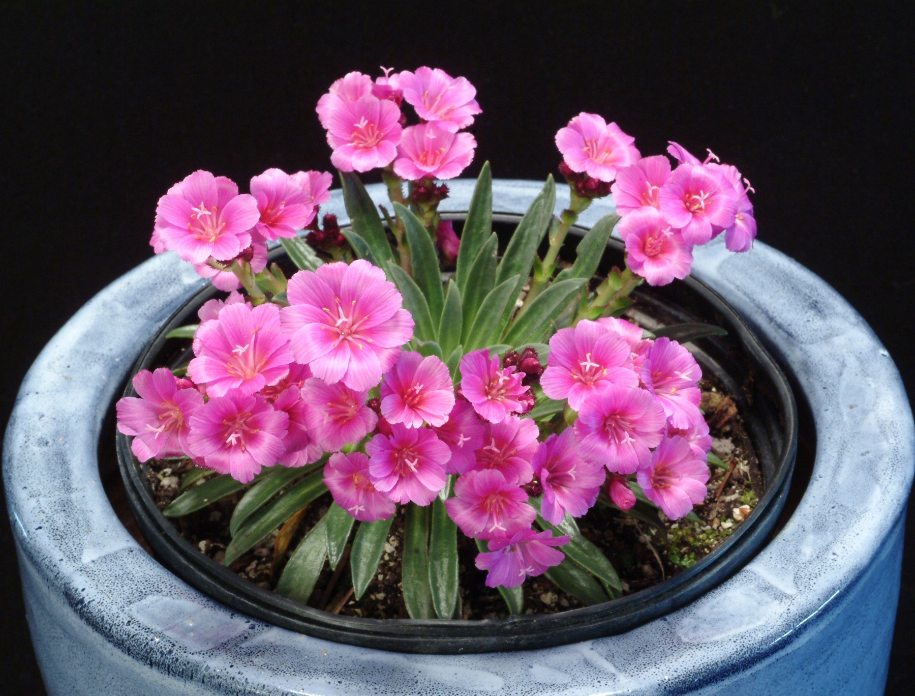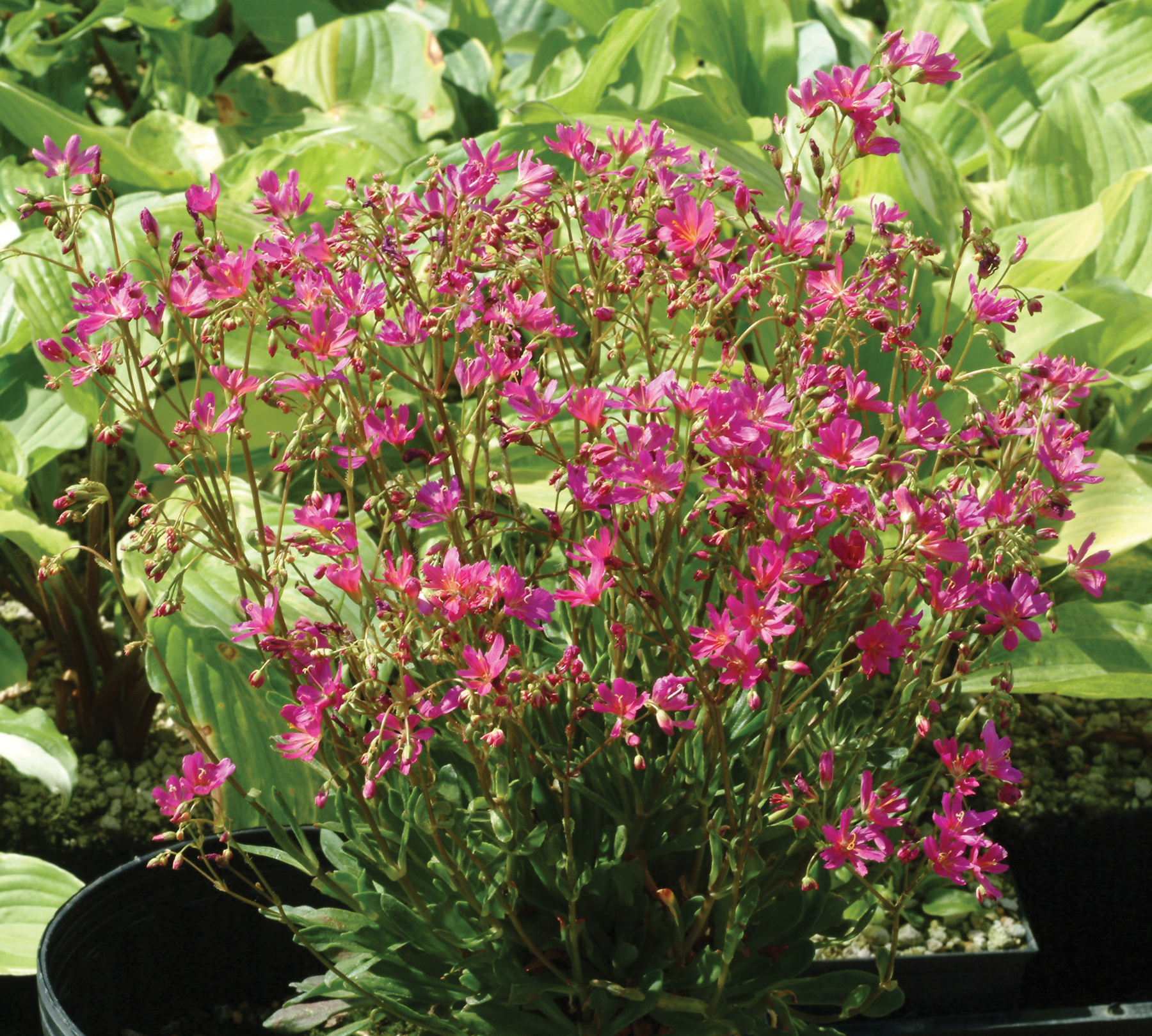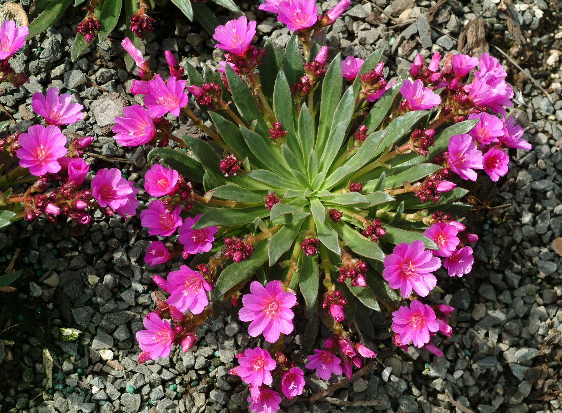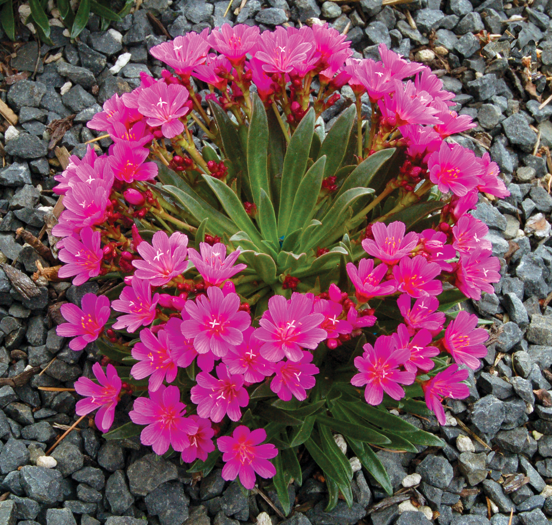 This succulent perennial, which forms compact rosettes with short panicles of large, rose pink flowers, will also rebloom. This hybrid is more tolerant of container growing than Lewisia species.