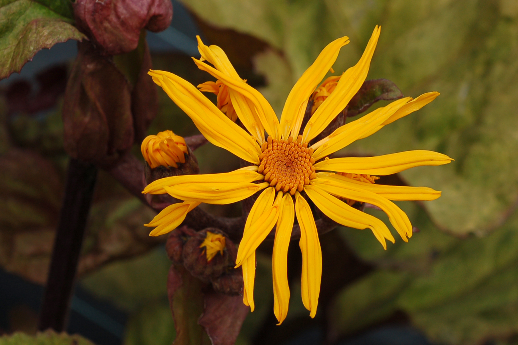 The dramatic, leathery leaves are 12″ across and deeply cut like a snowflake or the wings of a mythical creature. Yellow summer flowers in slender, dense racemes. The leaves and flower spikes have dark purple stems that add to the drama. Clumping habit. Best if protected from the hottest sun and kept evenly moist.