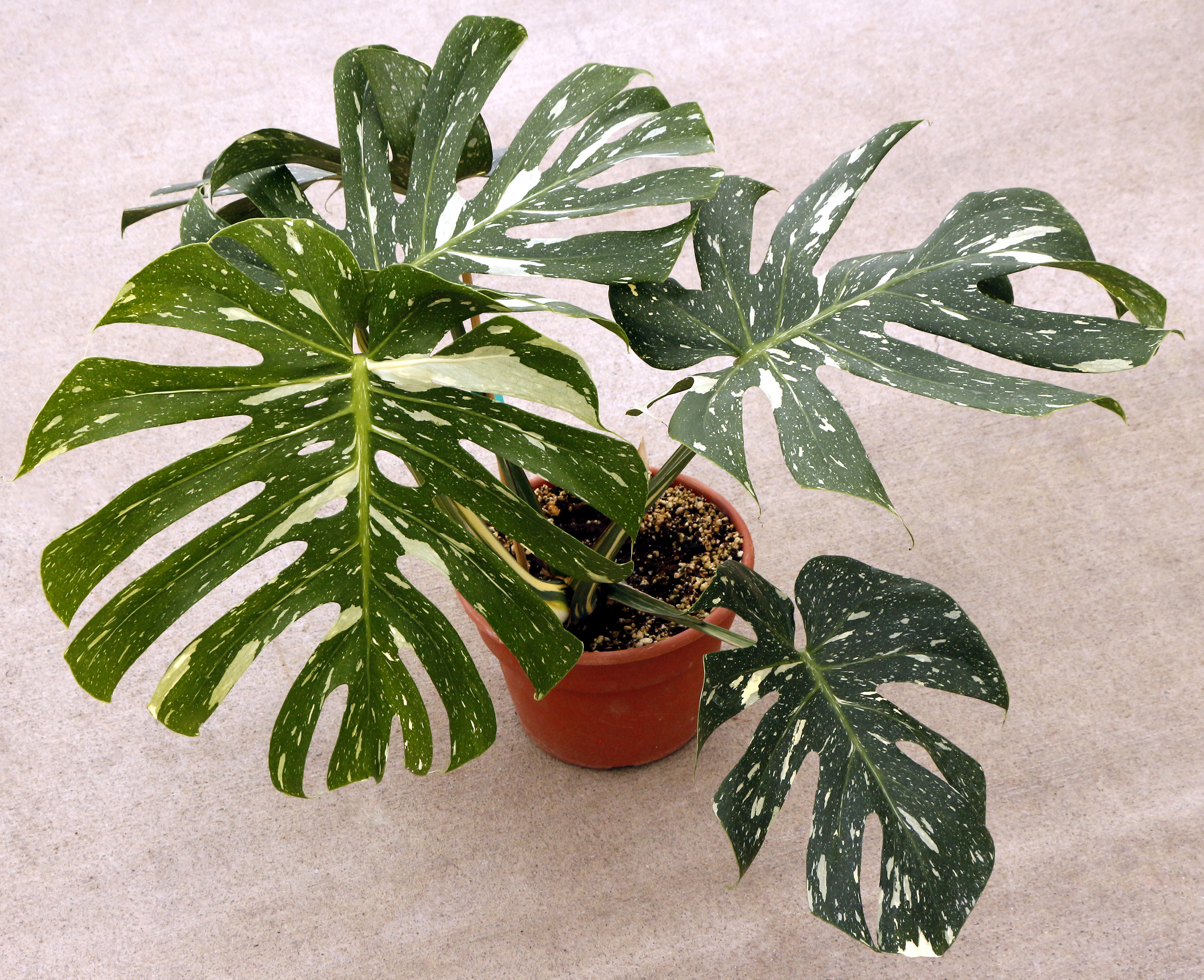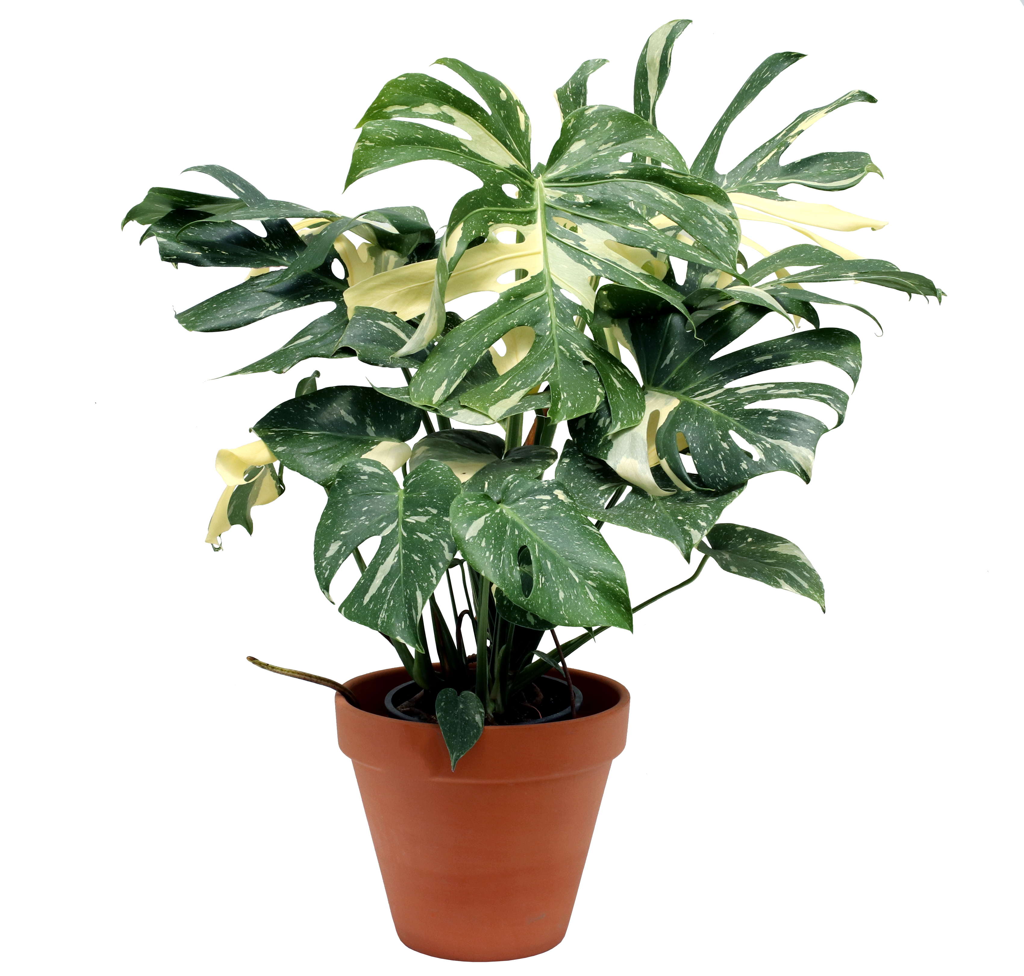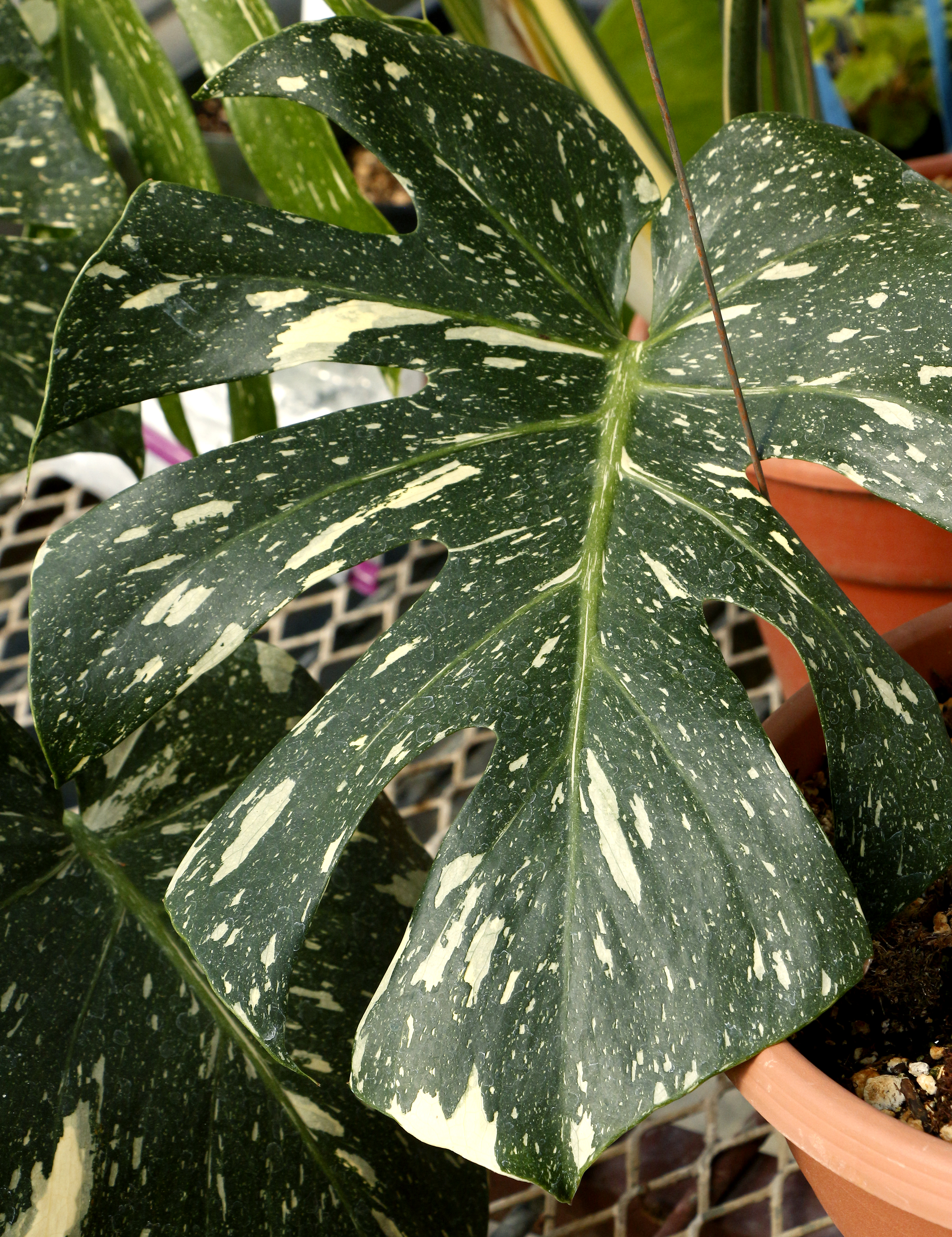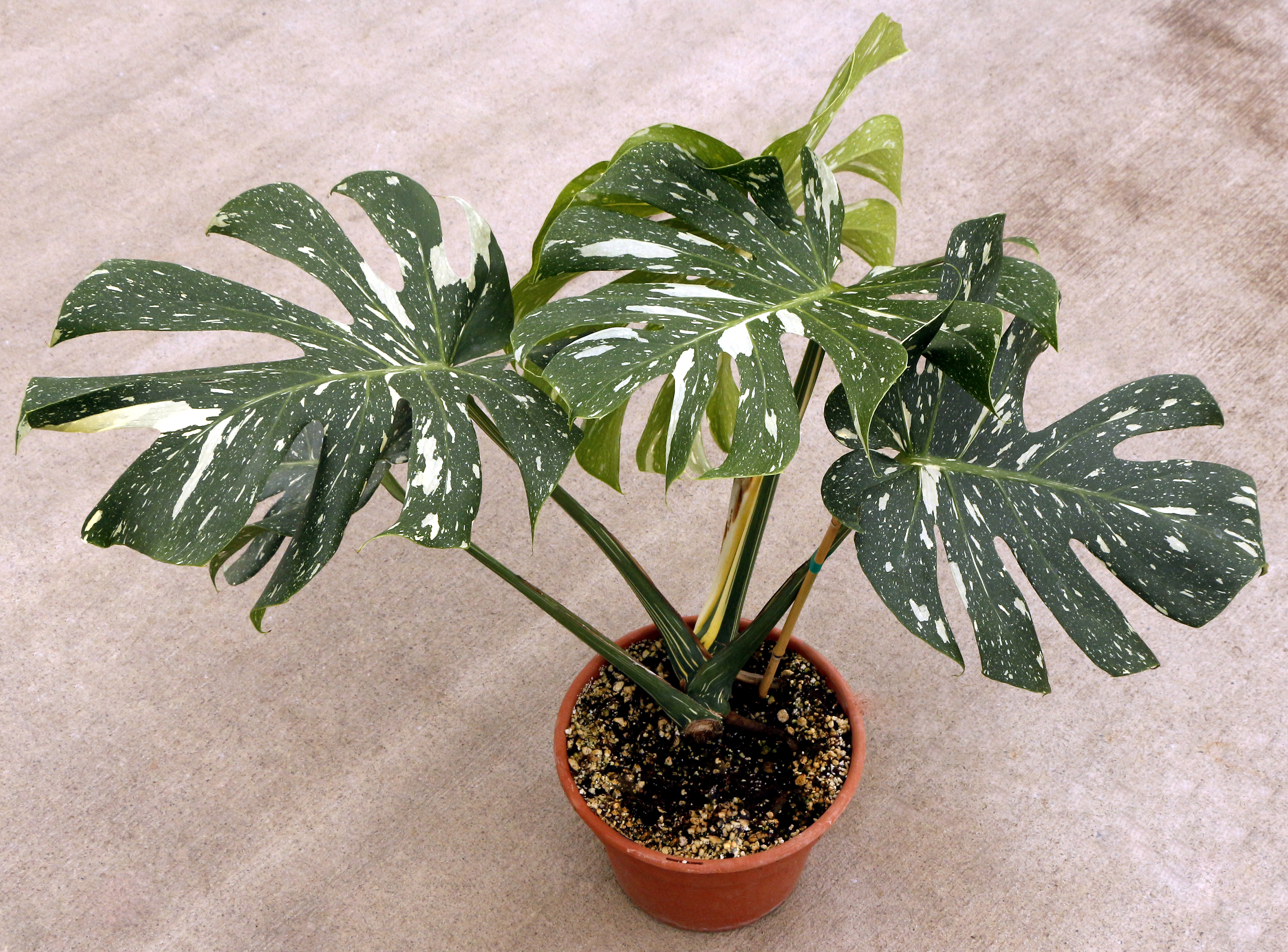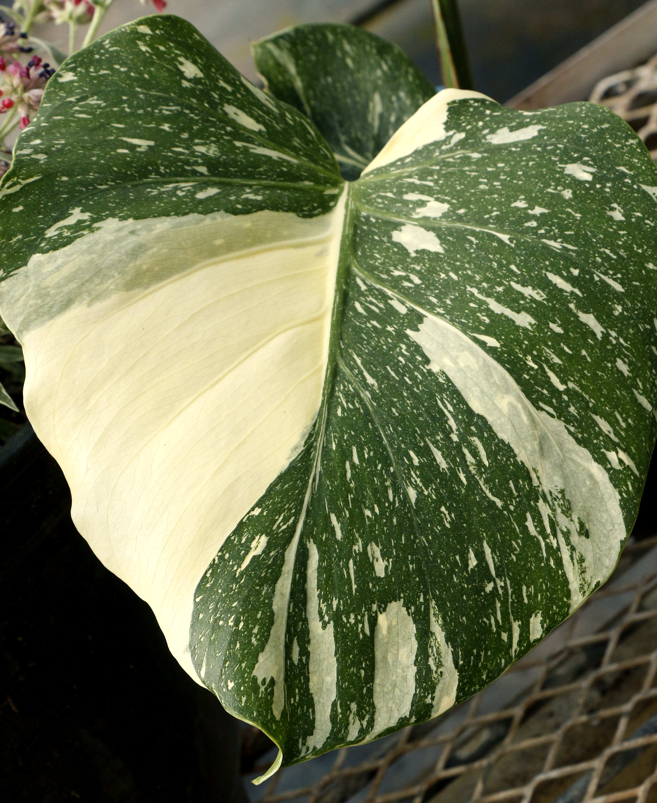 Rare mutation of green Monstera deliciosa. Famous for its fenestrated leaves and stable variegation of creamy flecking and surprising swaths of solid bright cream. This plant has been the “it plant” for years. The unfurling of each leaf is an exciting event, with ever-evolving fenestrations and variegation patterns. Easy to grow and a must-have for any houseplant enthusiast. Stable variegation and quite vigorous. Leaves get 2 feet in length and almost as wide.