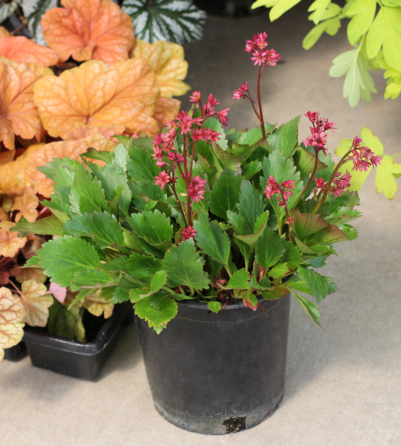 This hybrid is an amazing combination of dark pink flowers from its Bergenia heritage and jagged leaf-edges and great fall color from Mukdenia 'Crimson Fans'. A cool and lovely intergeneric cross. The thick, leathery leaves last longer than Mukdenia in the fall before they go down for the winter. Long-lived and good in containers.