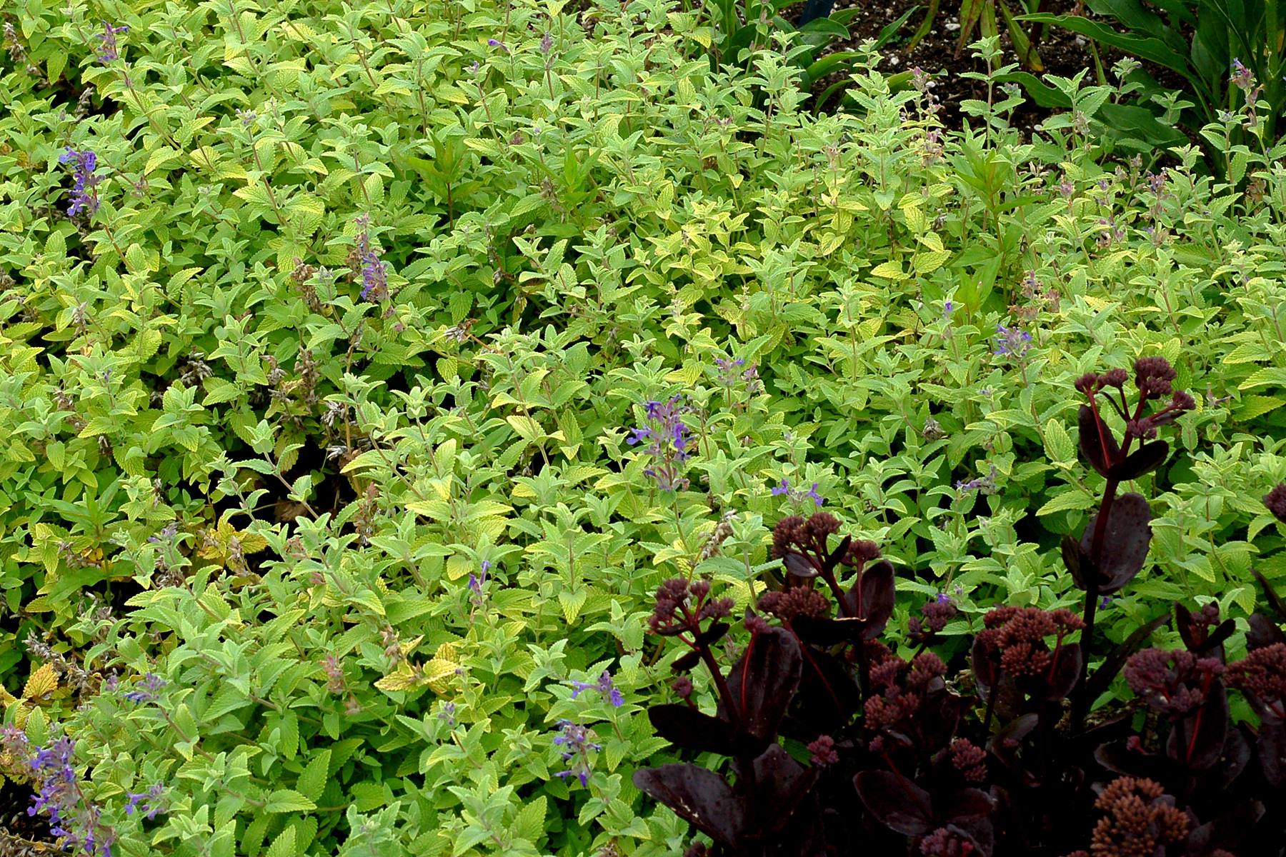 A splendid look for a catmint: icy lime-green foliage sprinkled with blue flowers all summer long. Extremely low habit makes this plant a natural choice for borders or along garden paths. Very easy to grow if given sun and good drainage. Drought tolerant and deer-resistant.