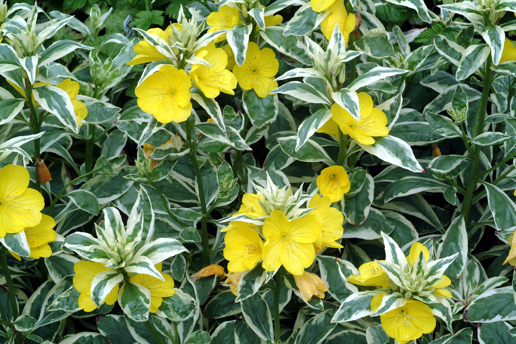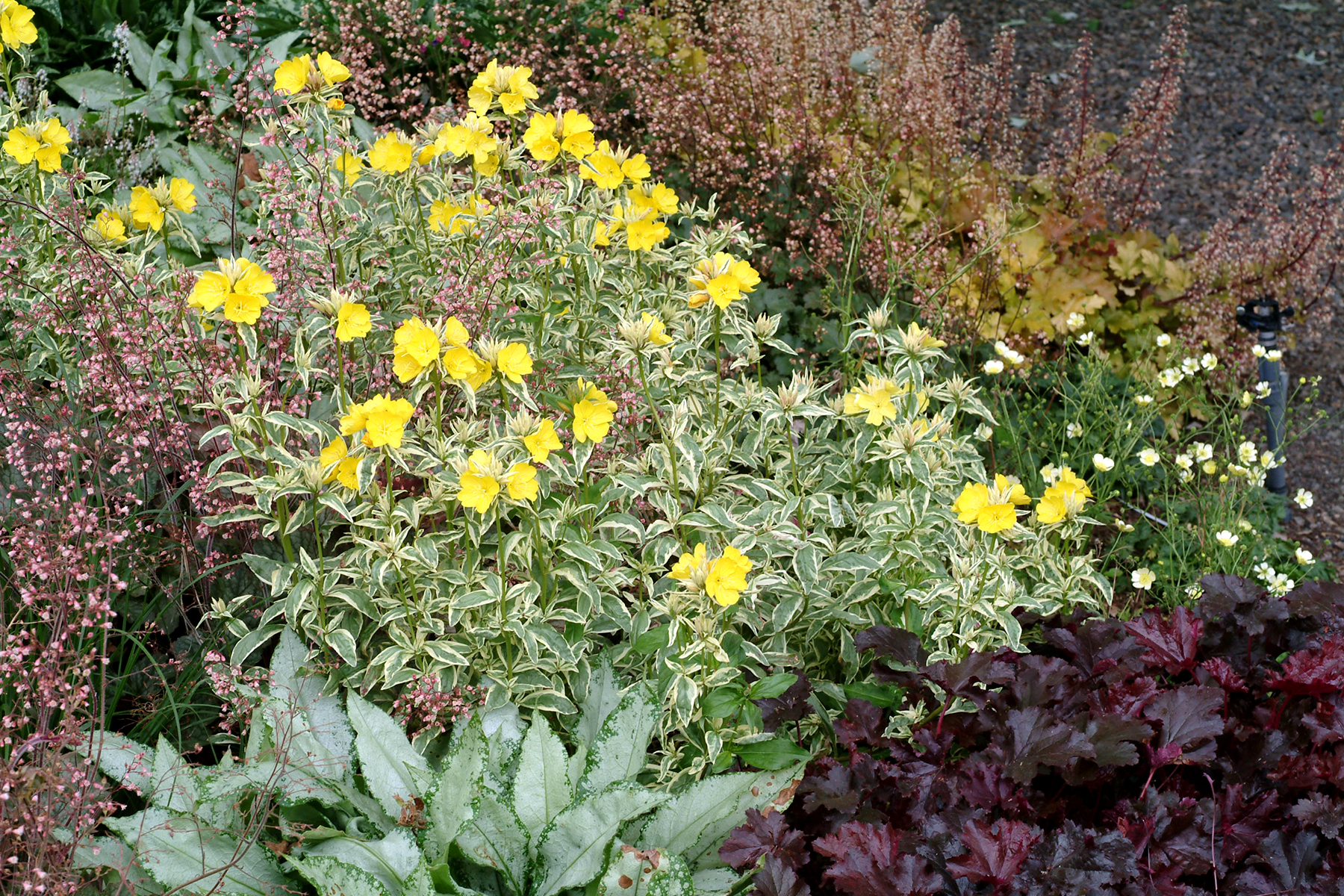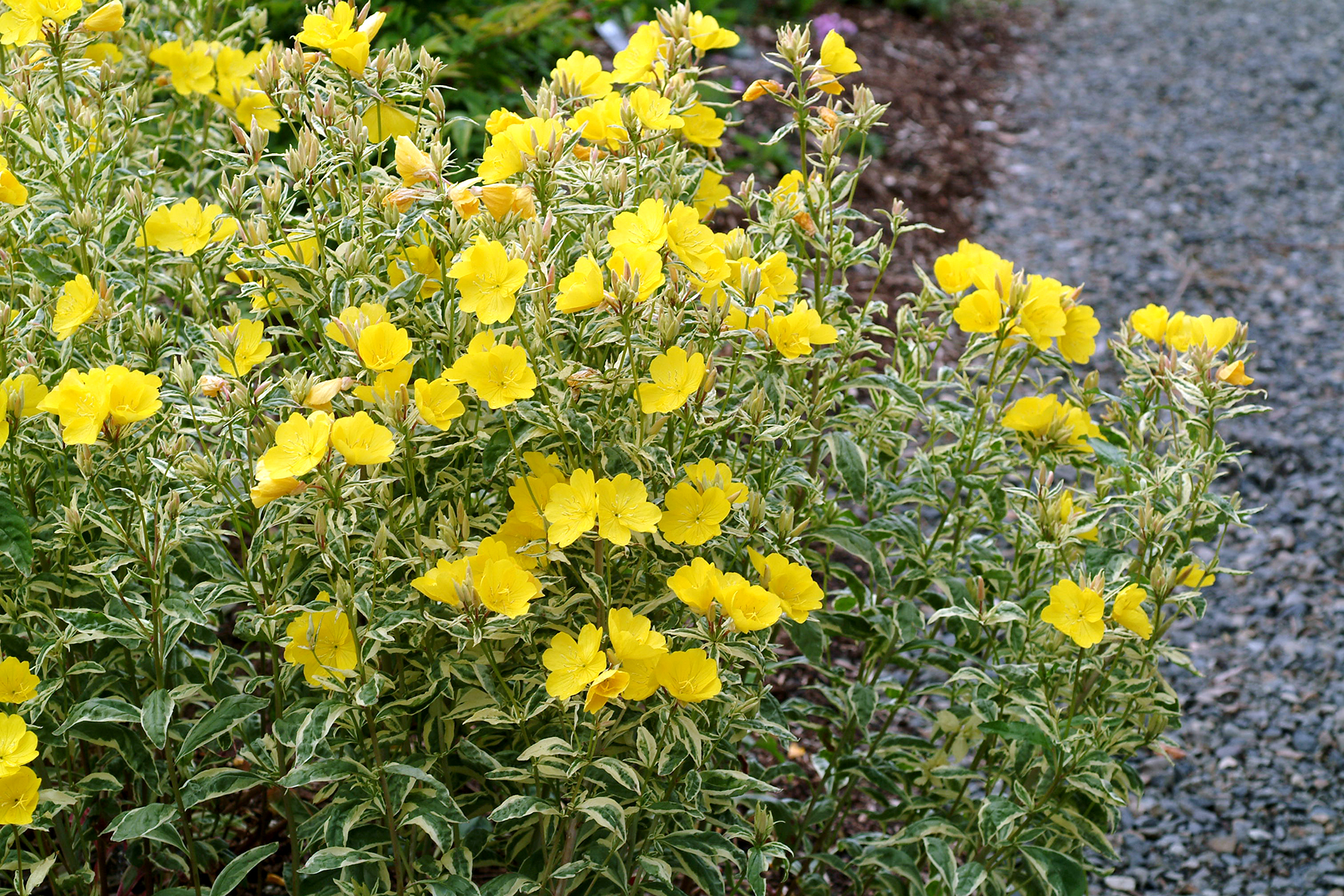 A stunning Evening Primrose that gives seasons of color. Spring foliage breaks ground pink and white then moves on to summer foliage is green and white. In early summer, large night fragrant yellow blooms appear.