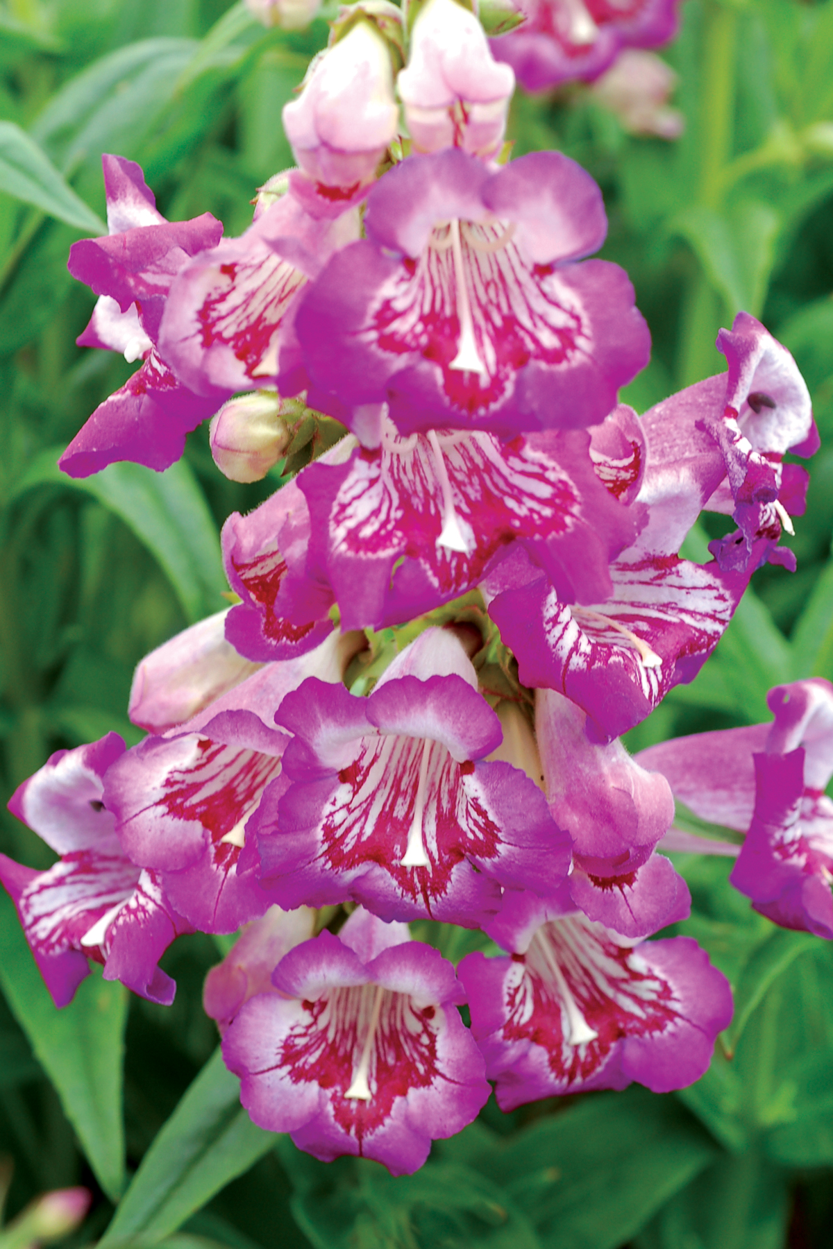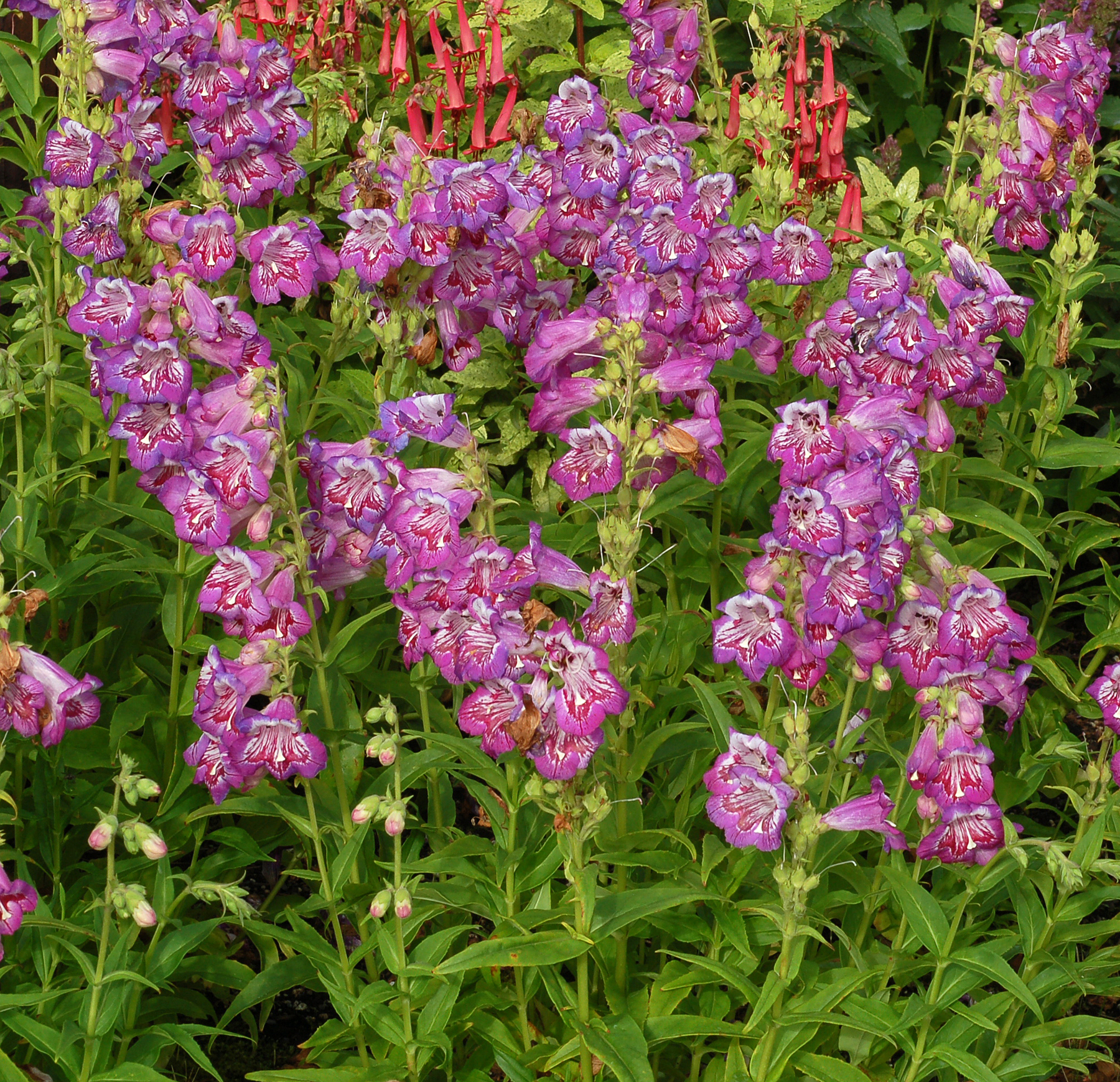 Strong spikes of immense, wide, light purple flowers. Each flower is laced with red purple guidelines. Hummingbirds fell in love with this plant in our garden. Important forage plant for bees.