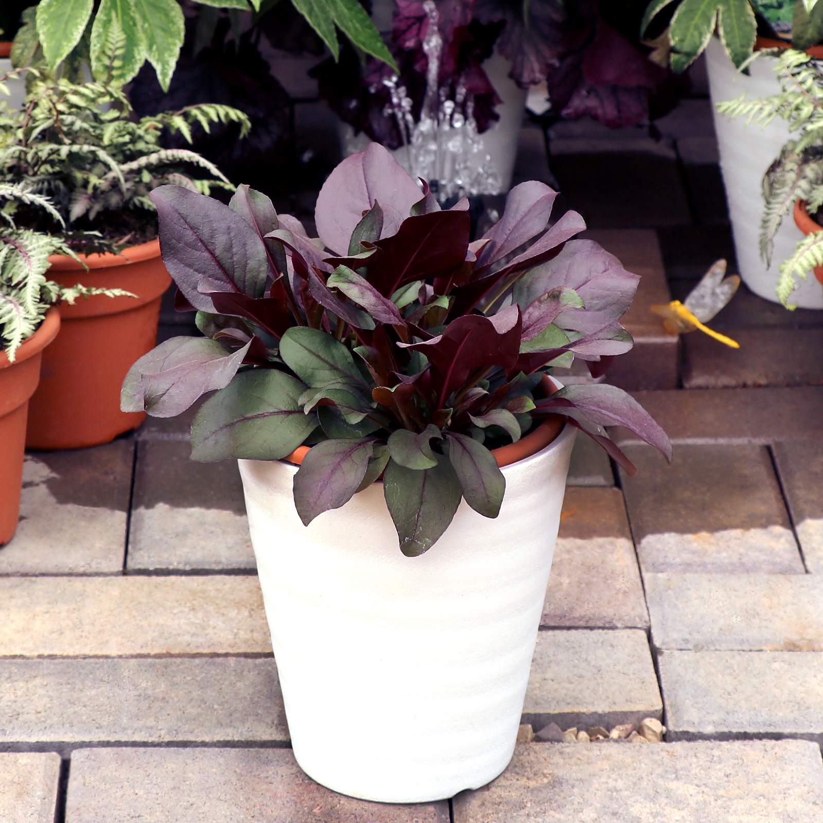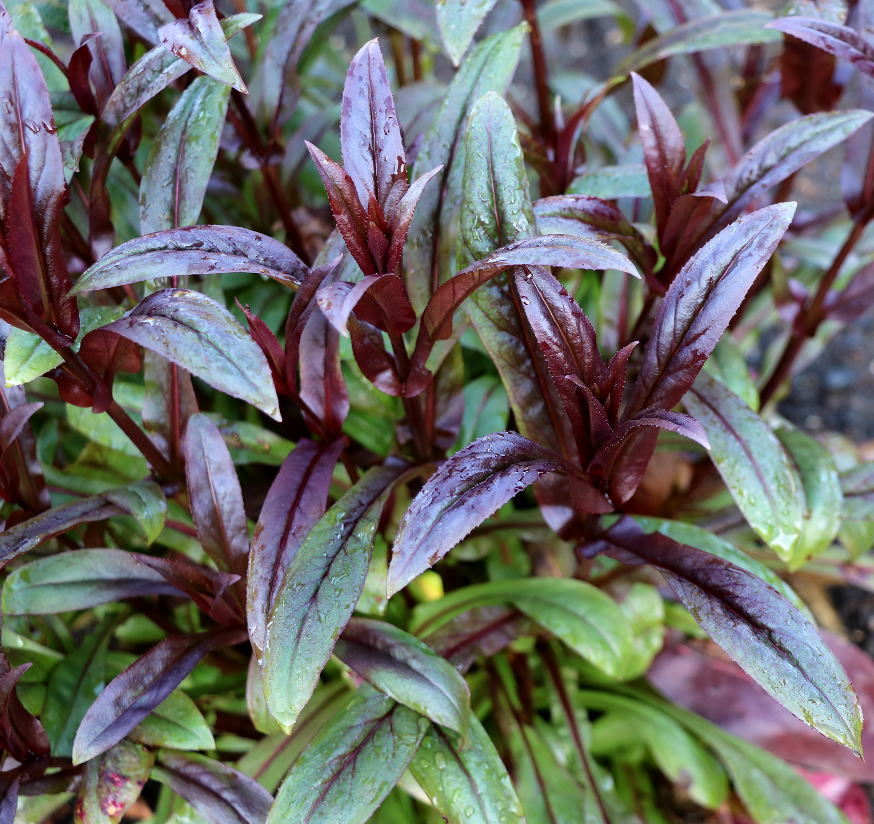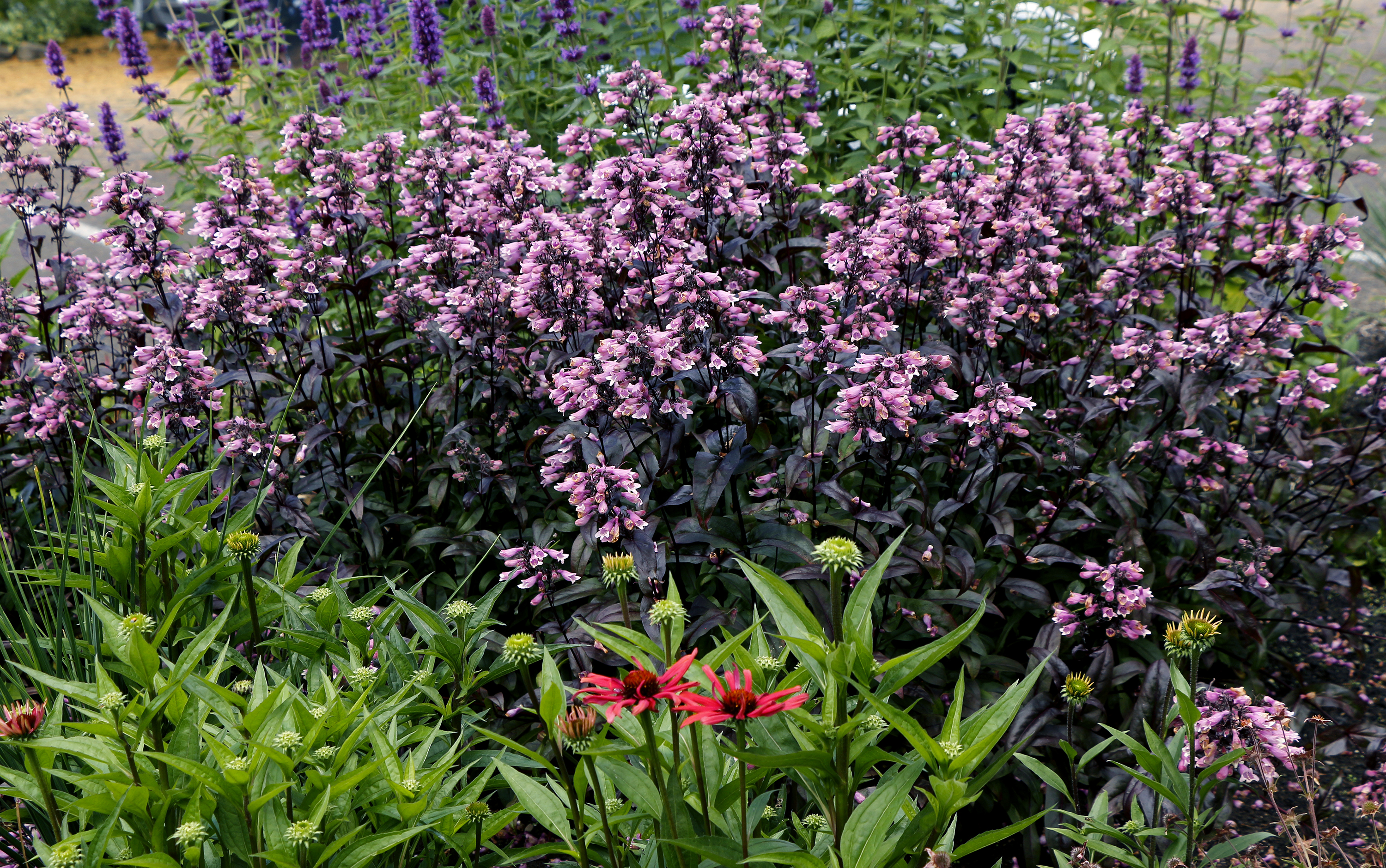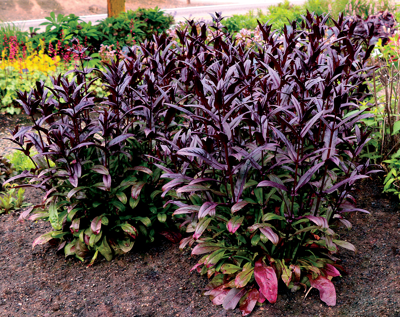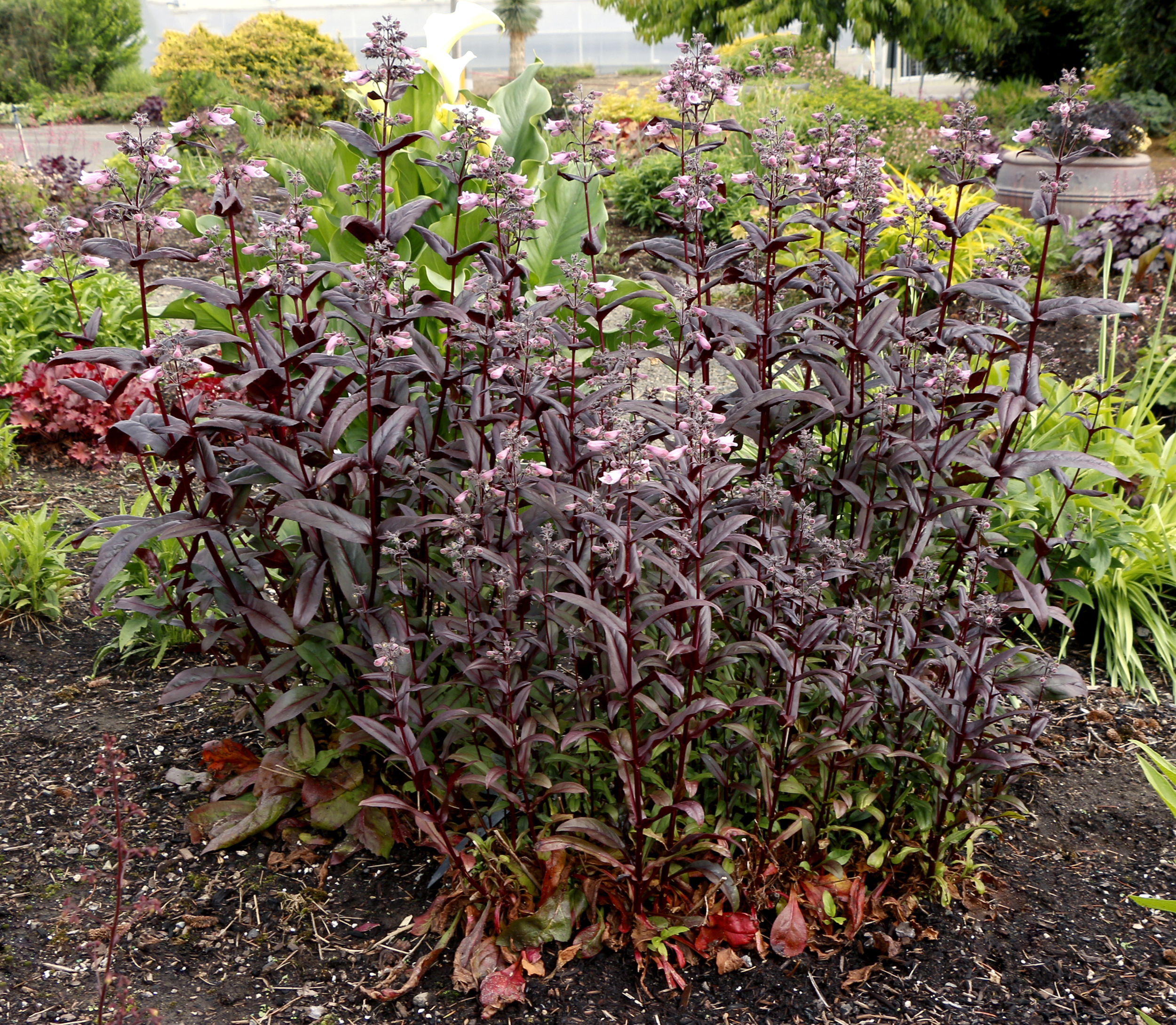 Glossy, purple black leaves on a very hardy perennial. Lovely lavender to violet flowers in June, which are loved by hummingbirds. Shorter and more compact than 'Dark Towers' or 'Mystica'. Tough and long lived. Showy dark seed heads in fall make great cut “flowers”.