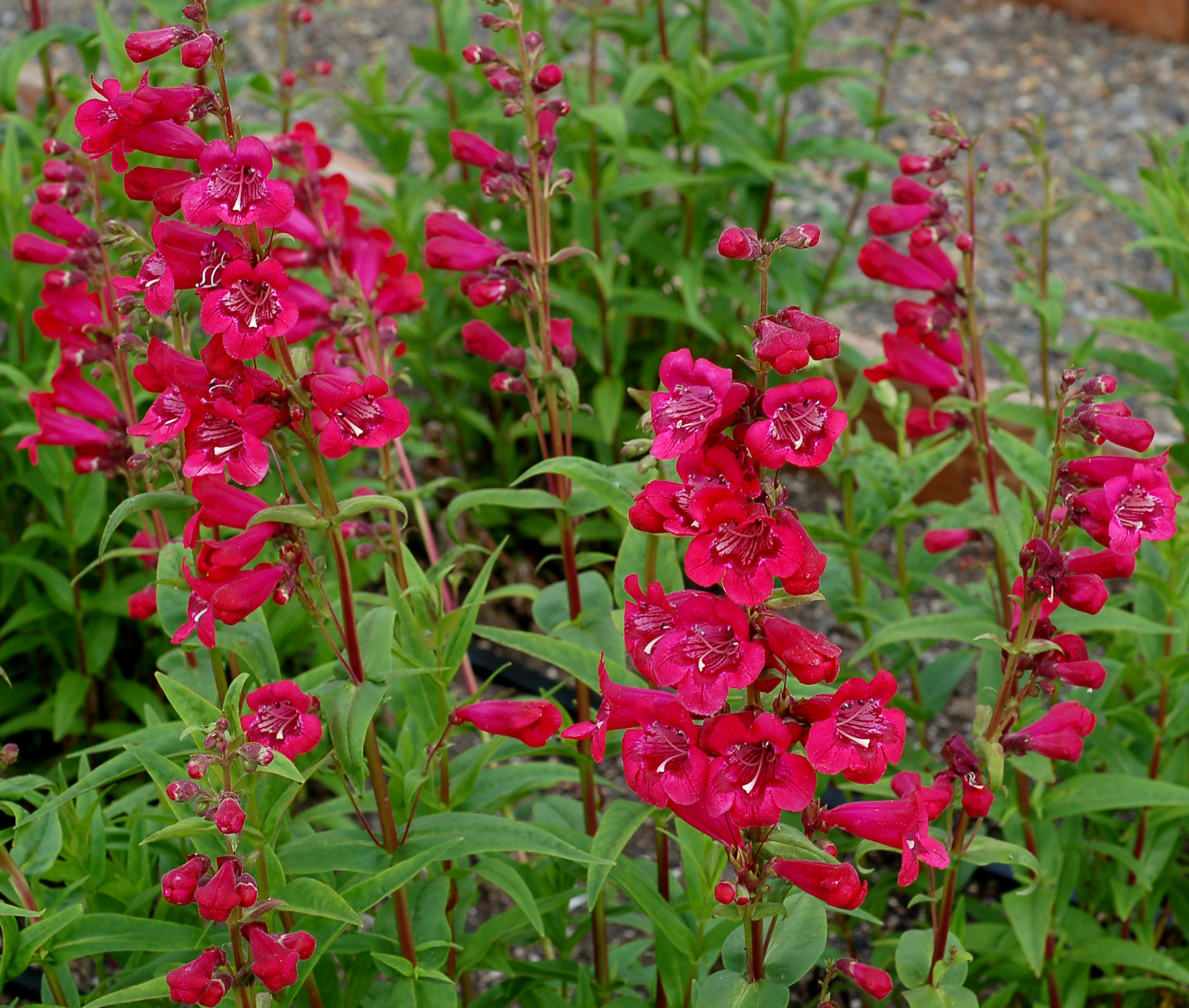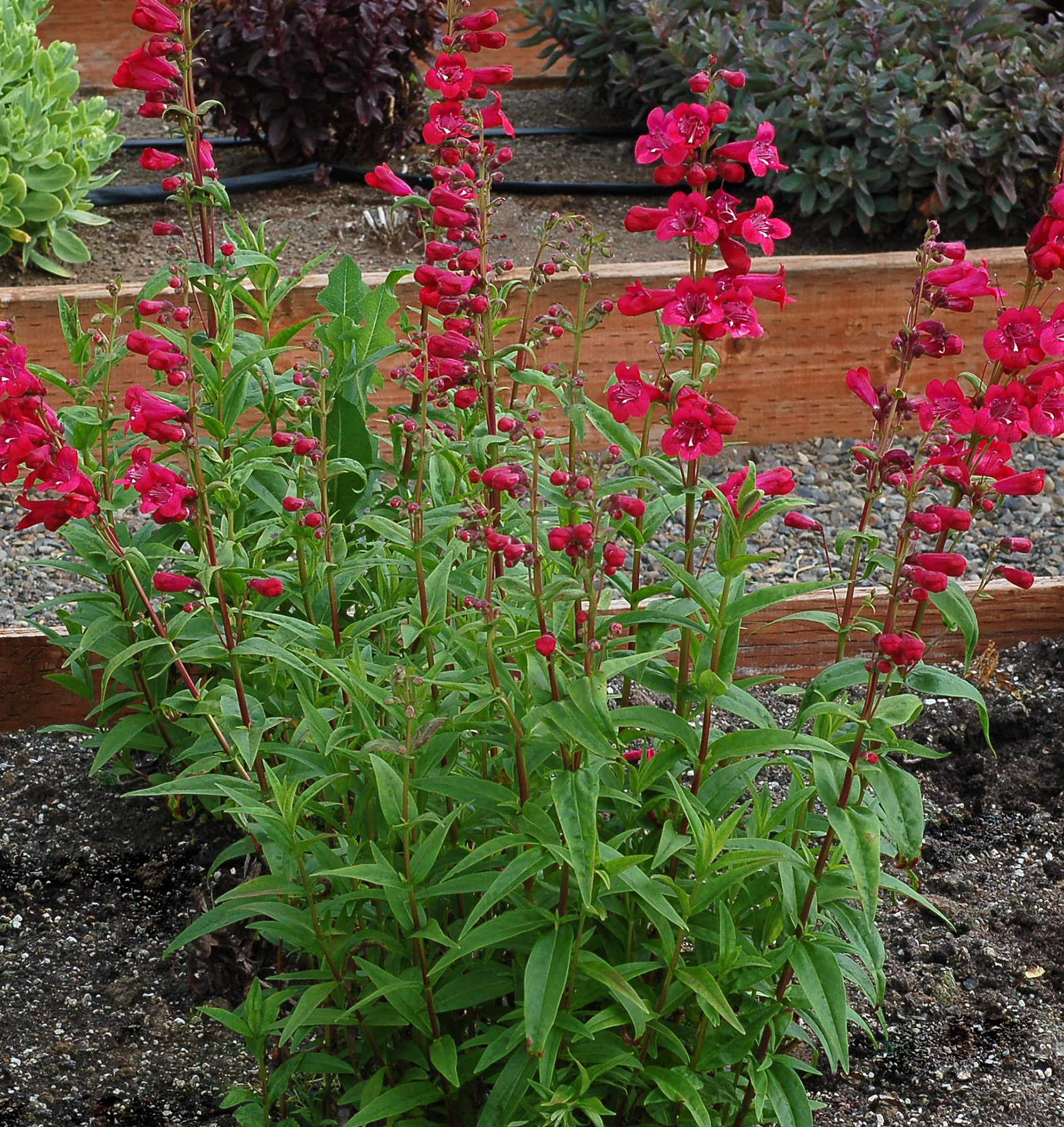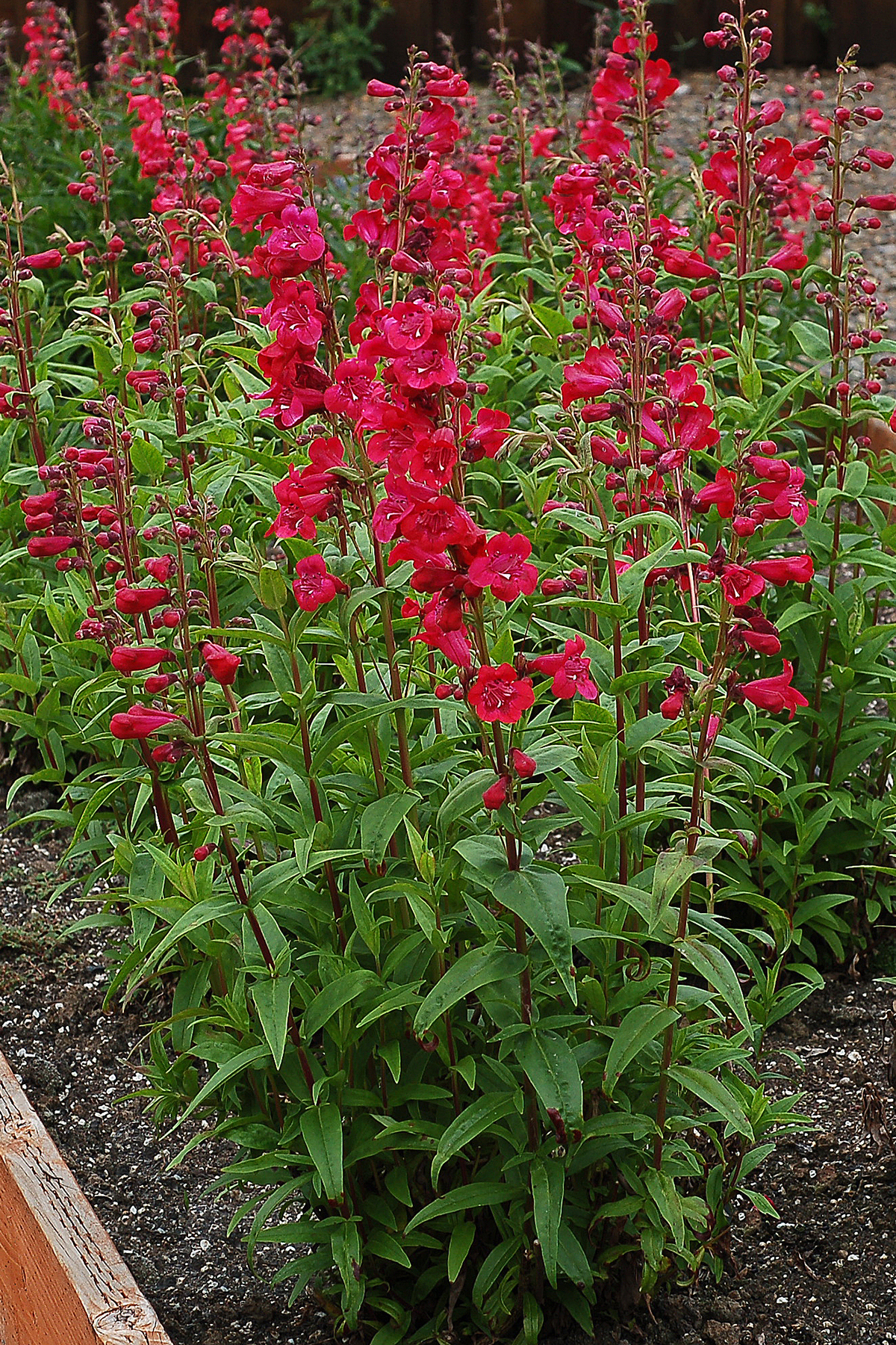 Red, re-blooming flower spikes and an upright habit make this Penstemon worth growing. Re-blooms all summer into fall. Glossy green leaves look healthy all season. Use in the mid border for a great color accent. Loved by hummingbirds and bees.