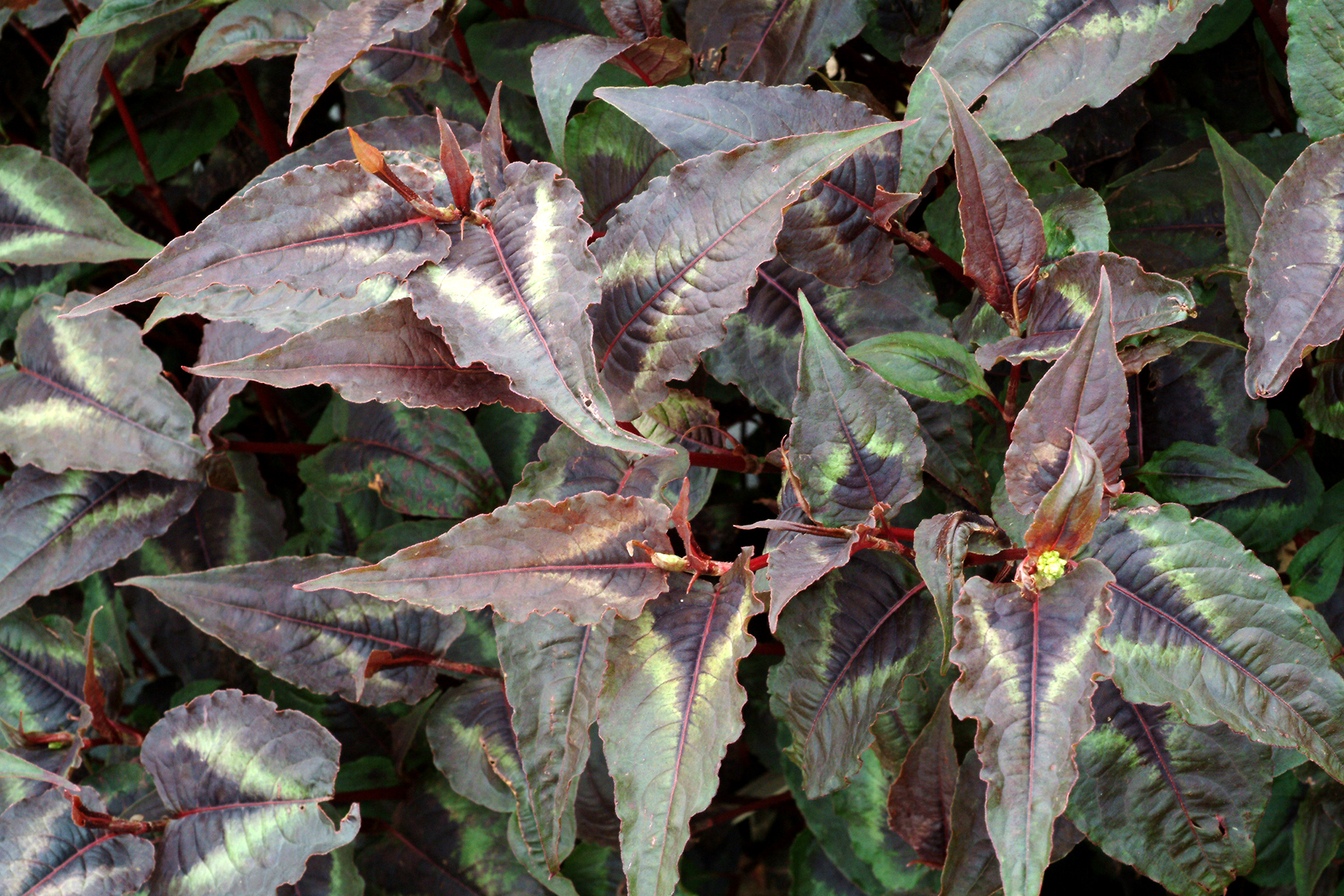 Very deep brown maroon foliage with striking markings on large leaves. Thick, stiff maroon stems. Striking foliage plant for mixed beds and in back of the border.
