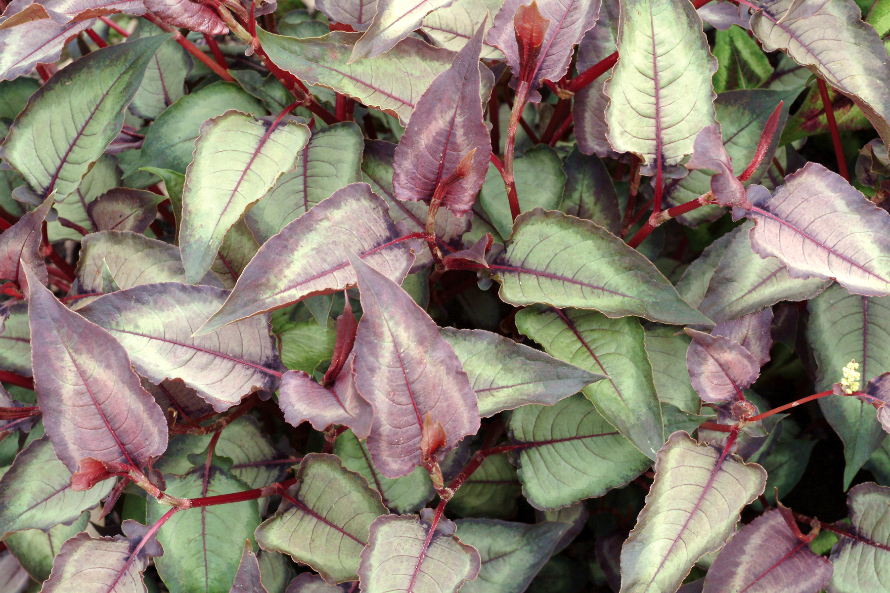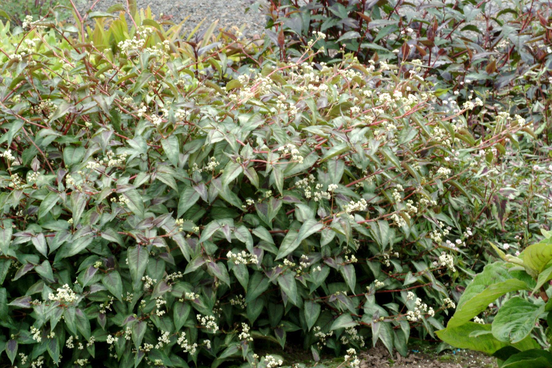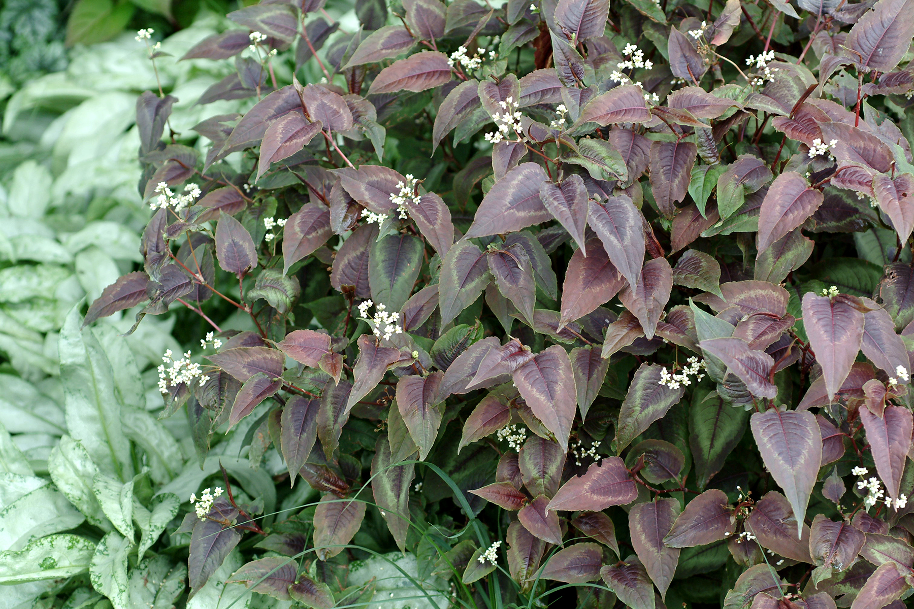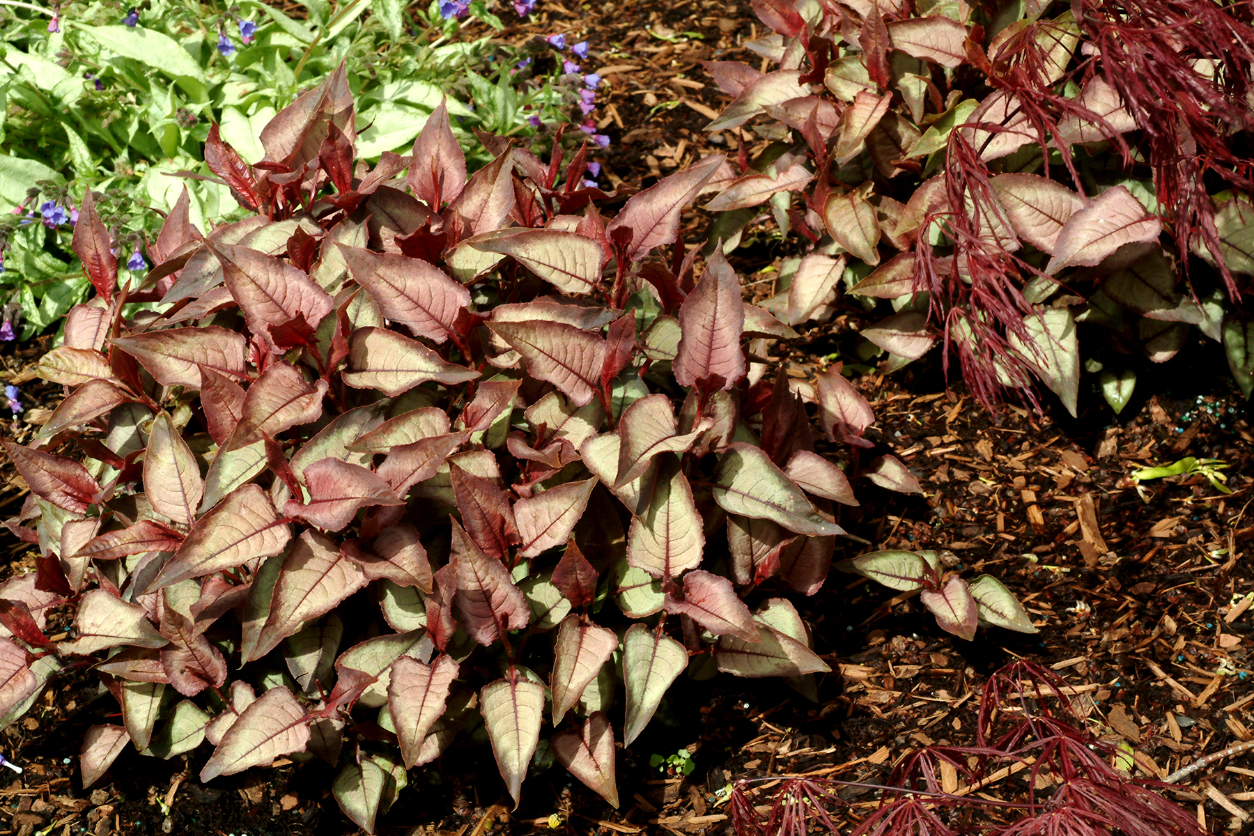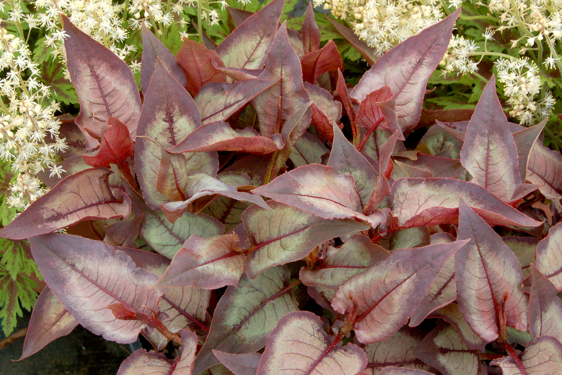 This plant is a standout with exciting silvered leaves with a reddish edge. 'Silver Dragon' is a non-running variety and can be used alone or in mass. Small white flowers in late summer.