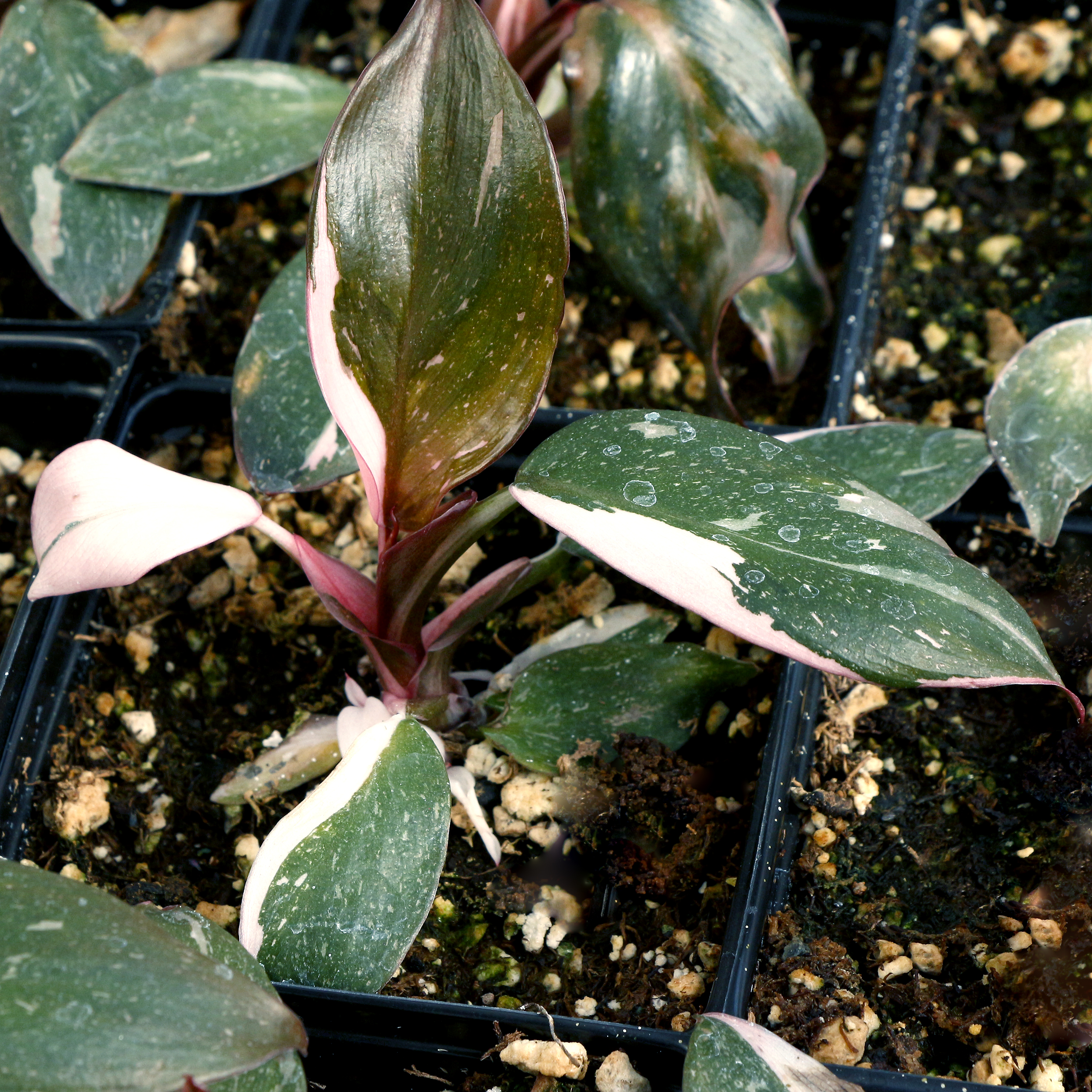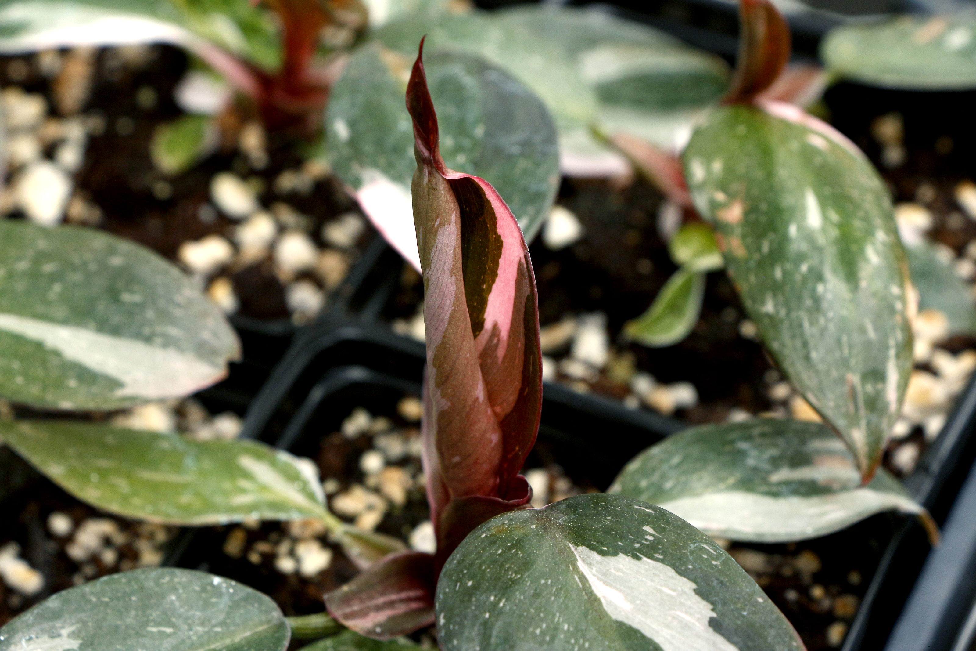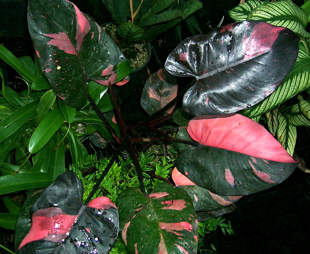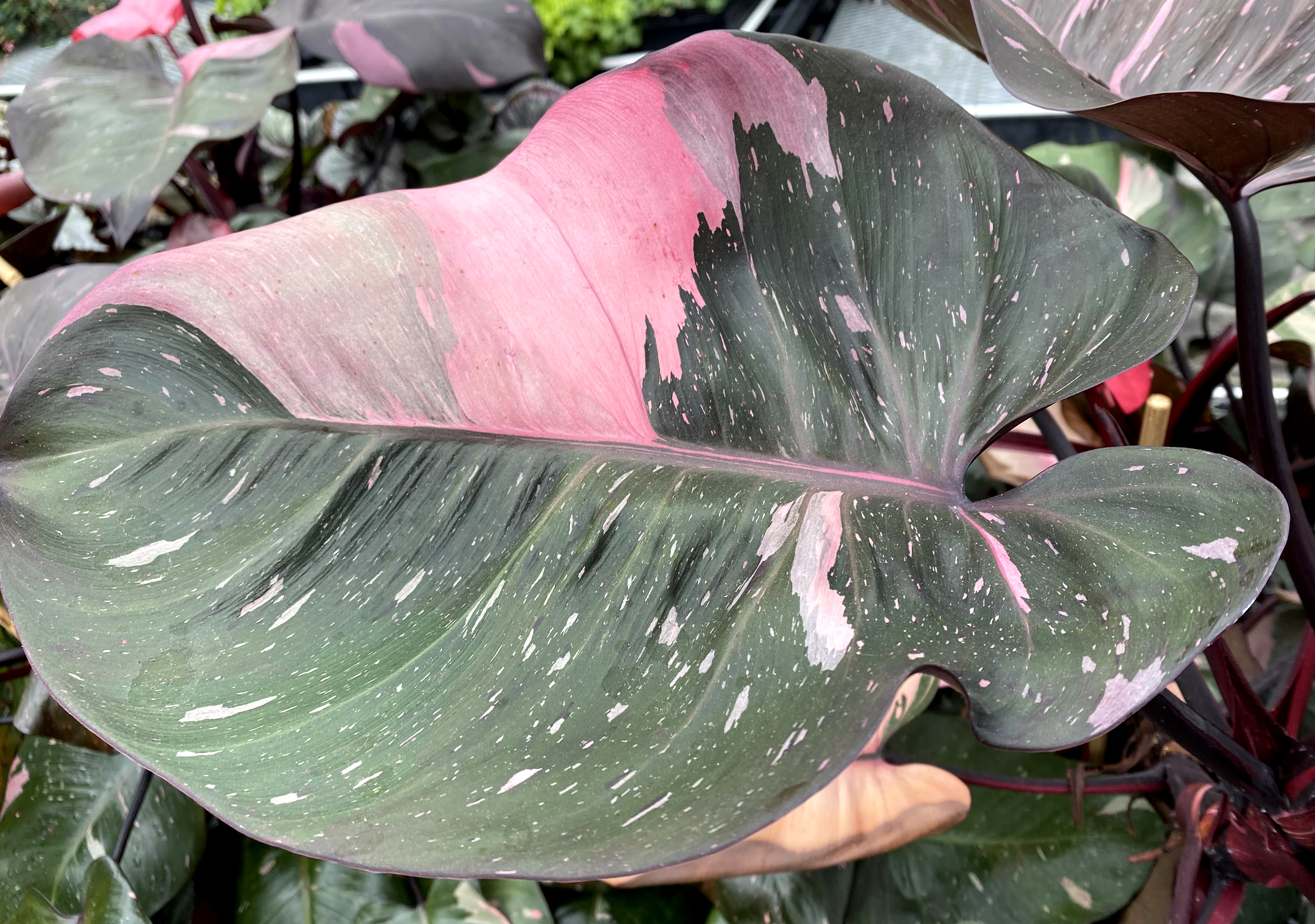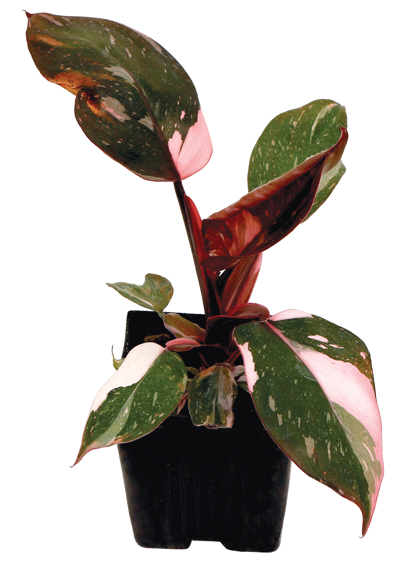 An unusual black leaf Philodendron with hot pink variegation! We believe this wonderful foliage plant is an Australian hybrid. Good light is needed for the maximum variegation and pink shades. No special care is needed, except for moderate light and home conditions.