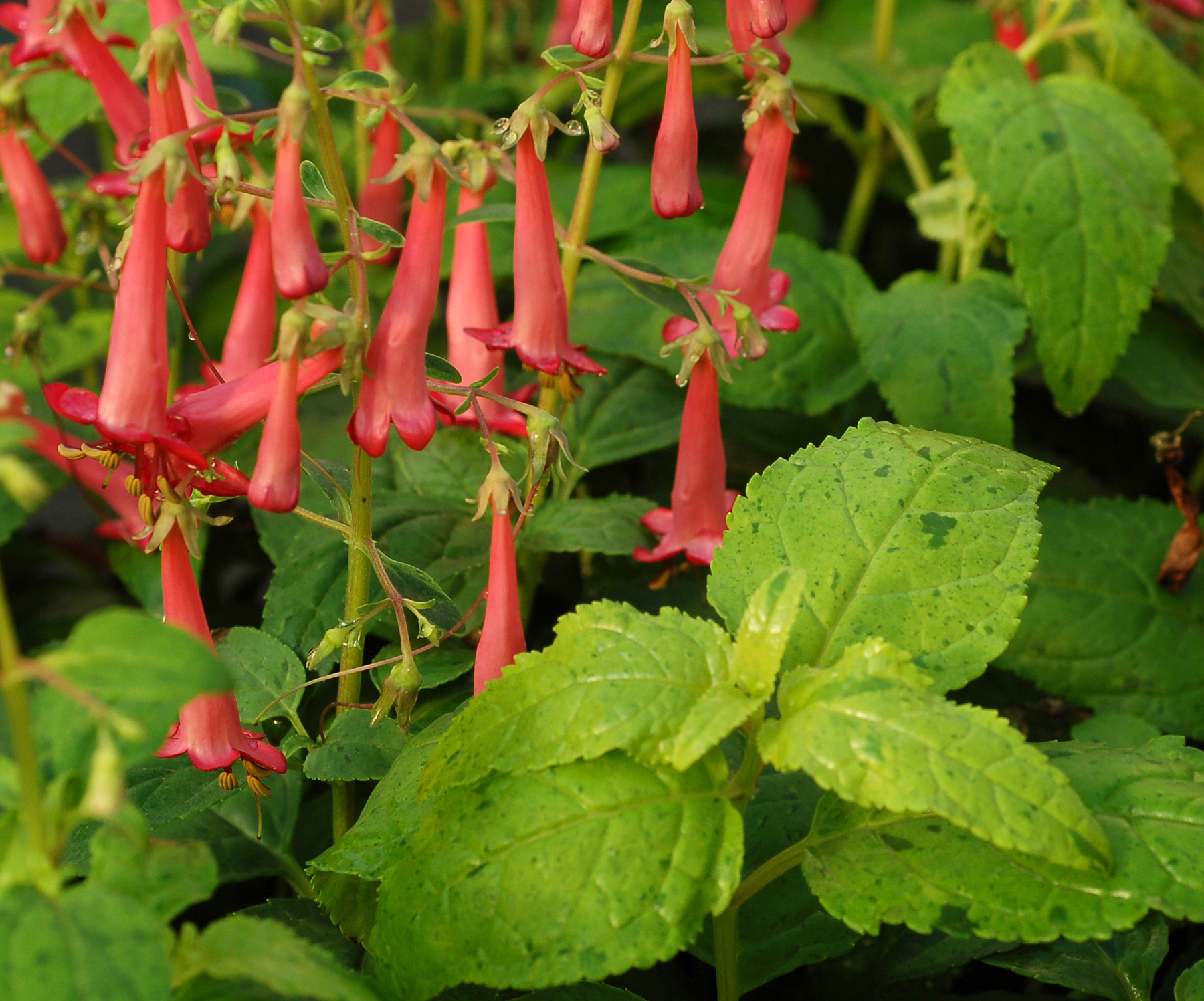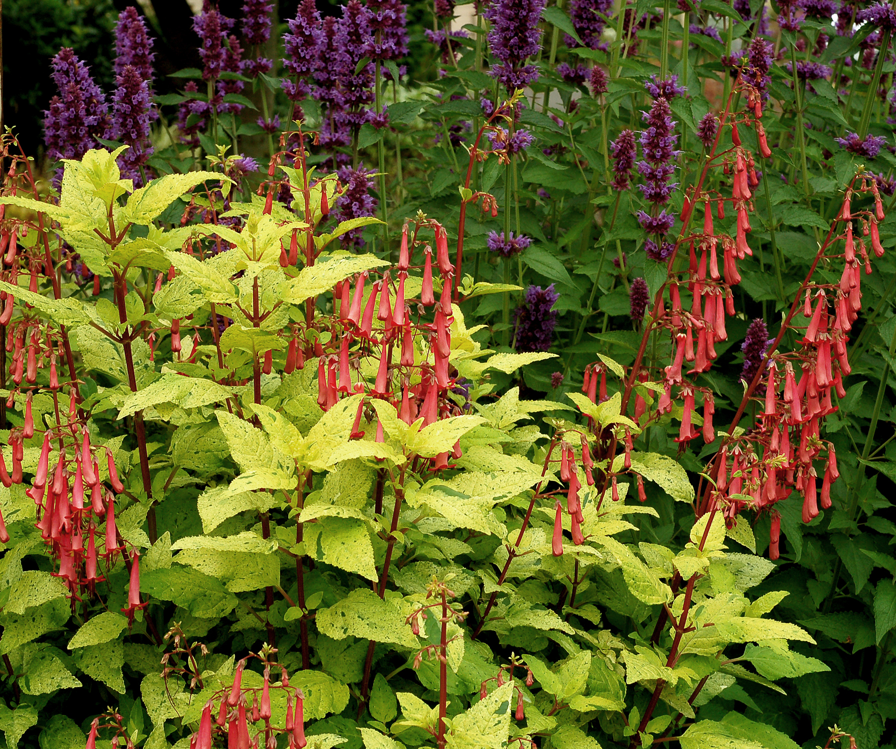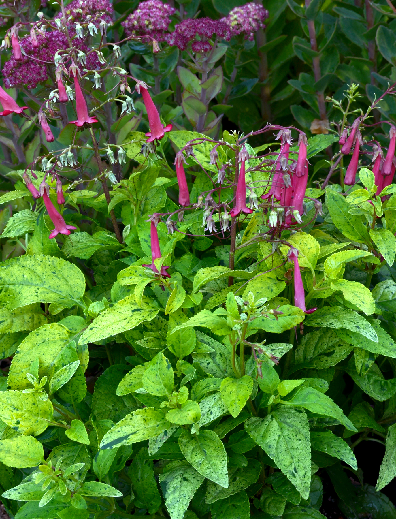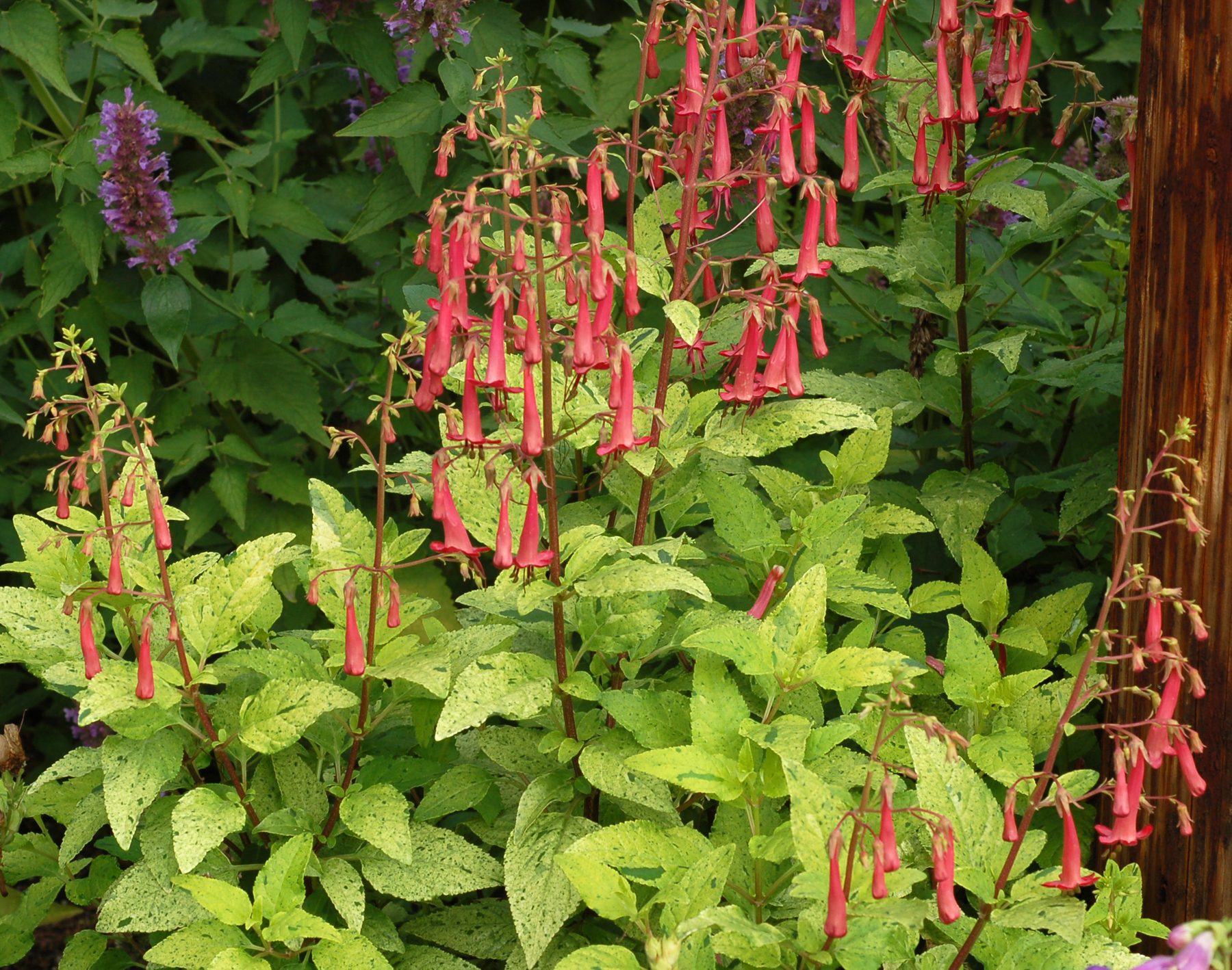 The first variegated Phygelius on the market! Lemon yellow leaves are dotted an splashed with bits of lime and pine green. Sometimes they are accented with a dollop of cream. This plant is so pretty, it doesn't need to flower, but when it does, it really all comes together! Coral orange trumpets call out to hummingbirds and bees. The excellent vigor of this plant will make it a super container, garden and border plant.