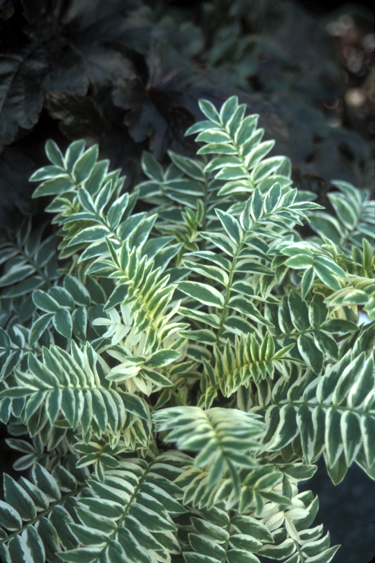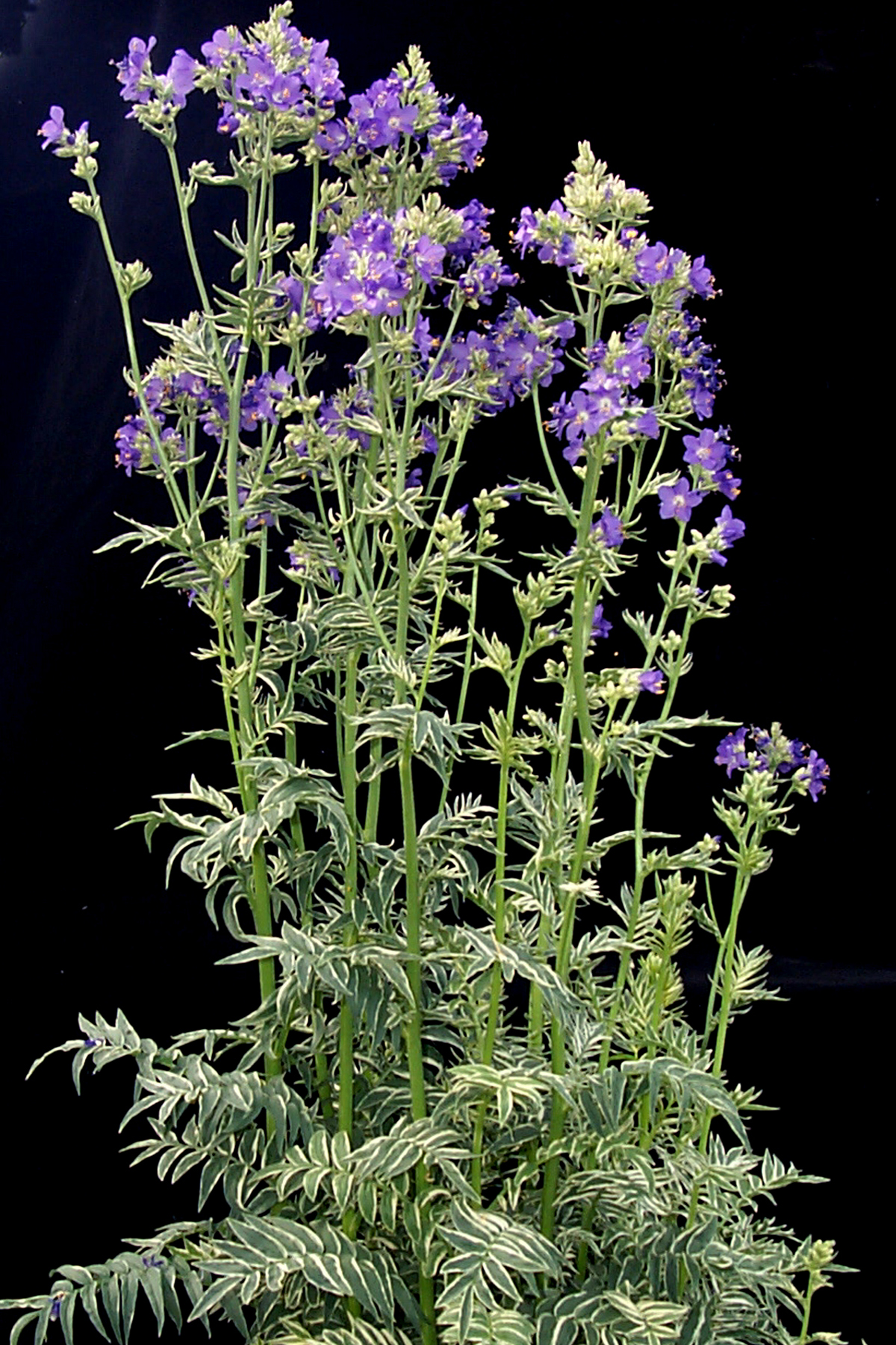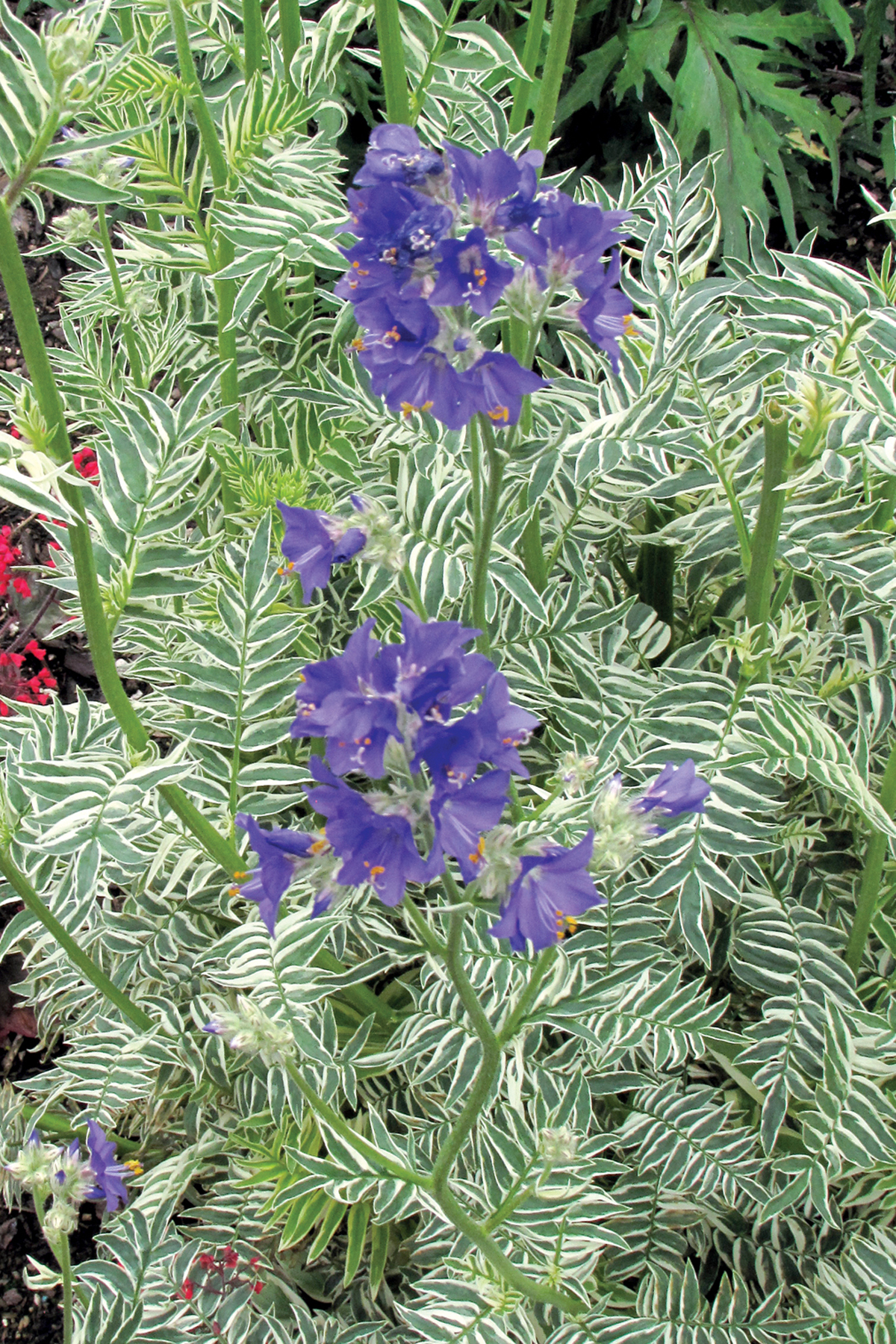Clean white variegation surrounds the larger fern-like leaflets. The mounding foliage has lovely, fragrant, sky-blue flowers. Deadheading can encourage rebloom.