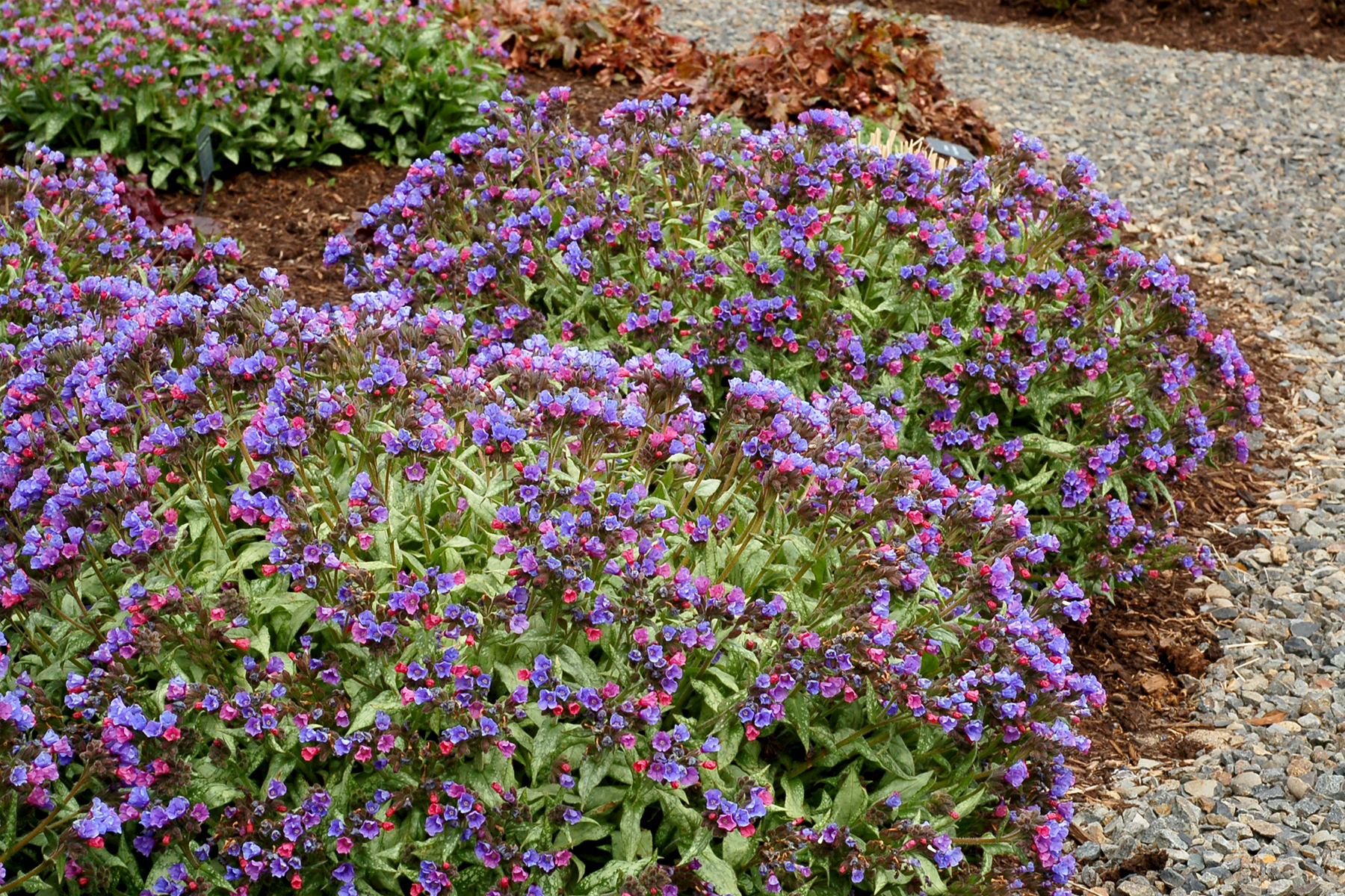 This long-blooming English introduction has attractive leaves that are entirely silvered. We looked at 'Majeste' and 'Cotton Cool' in our trials and of the two, 'Cotton Cool' never mildewed. Nice clusters of small blue flowers appear in April. A cool addition to shady areas but will take morning sun.