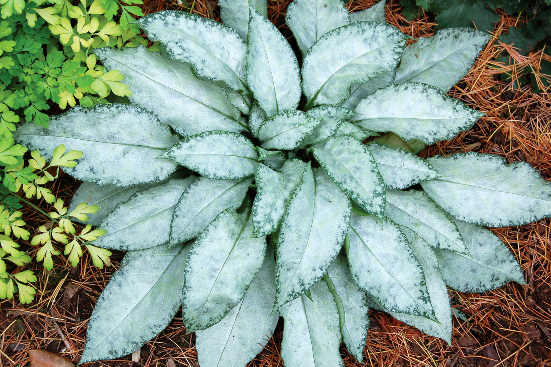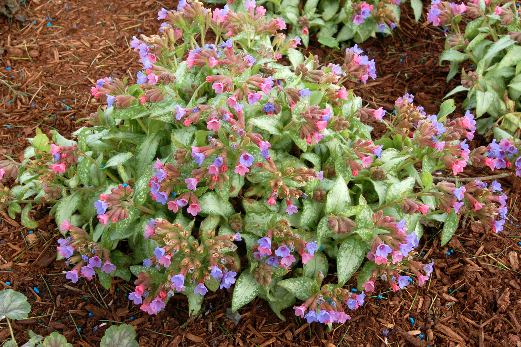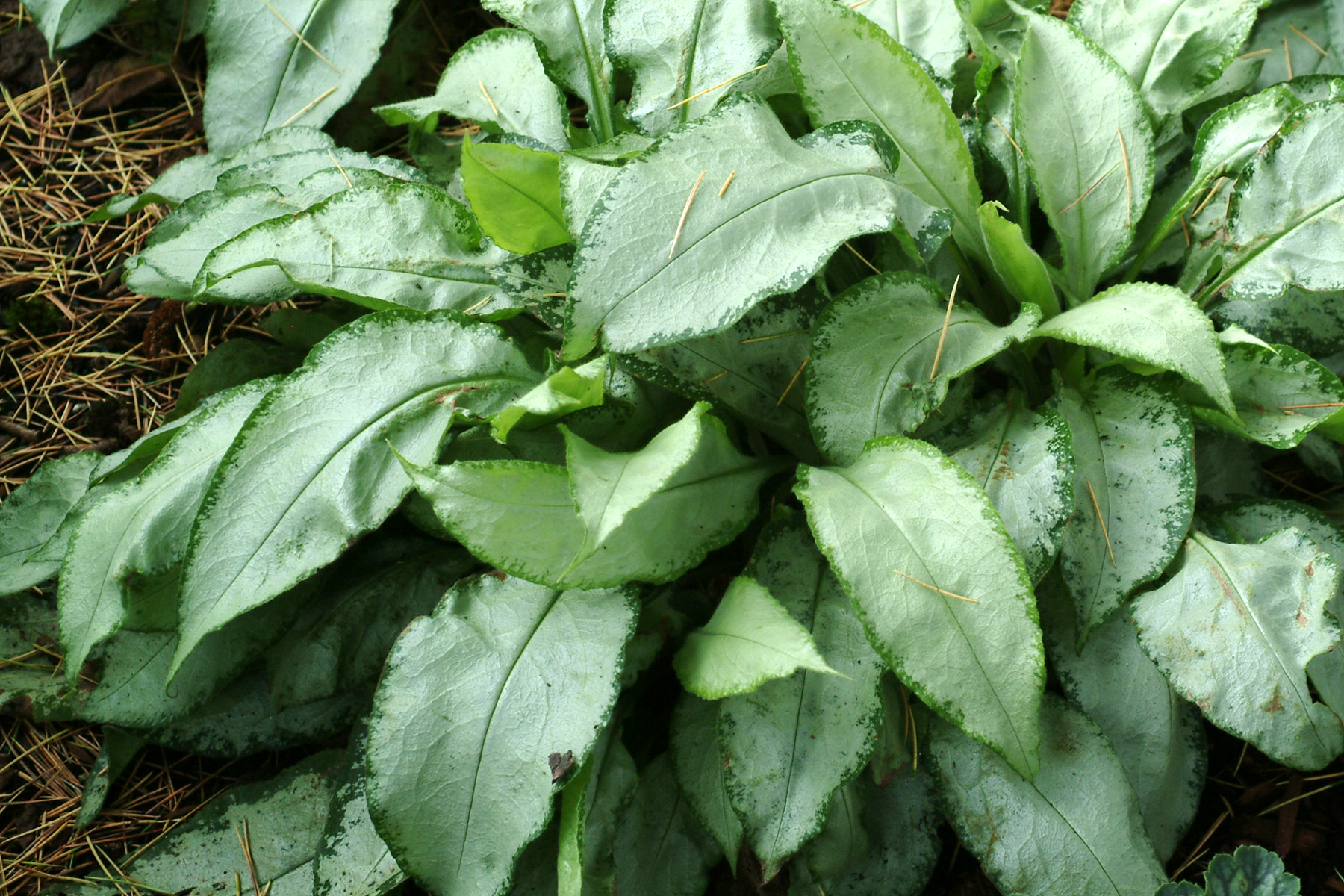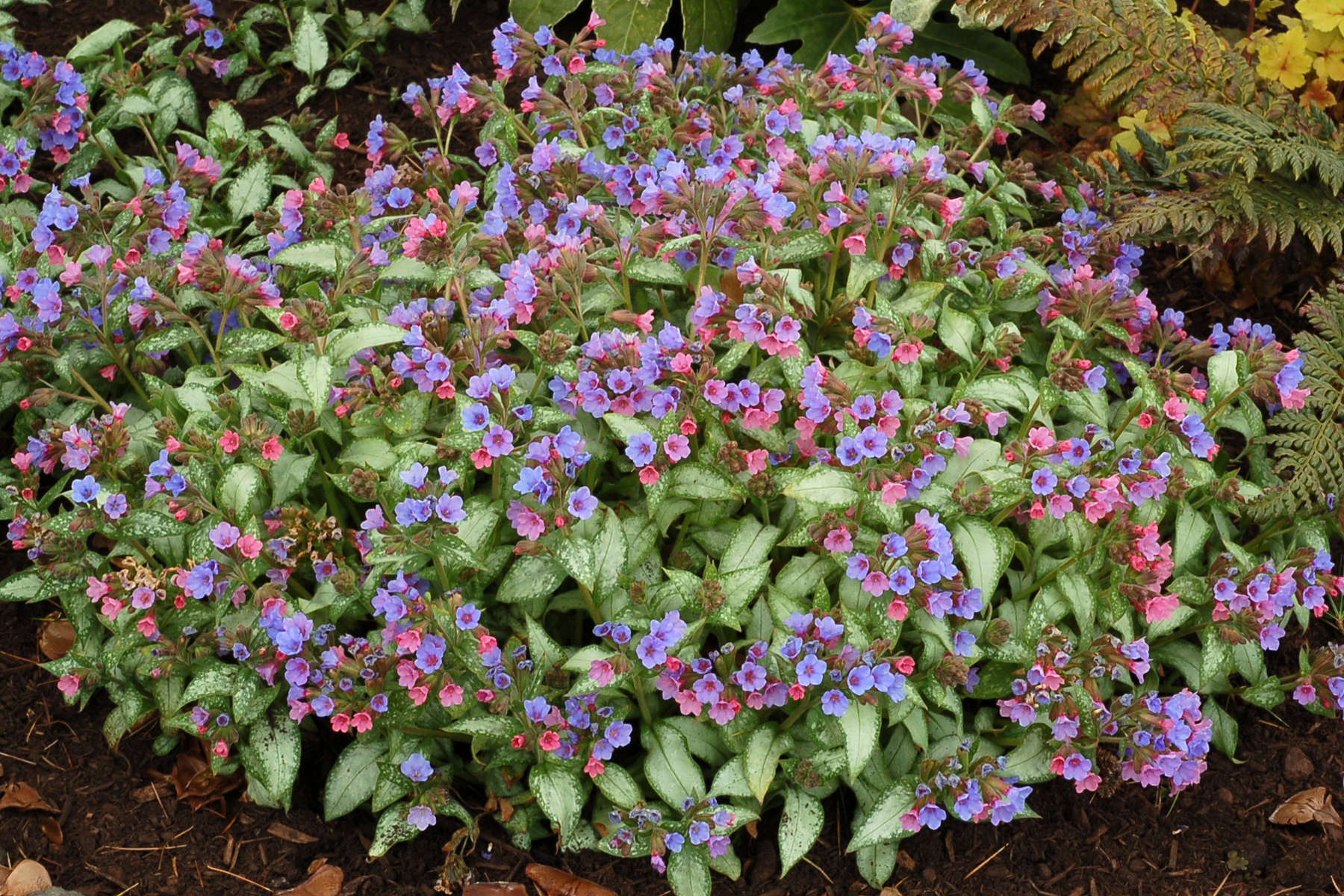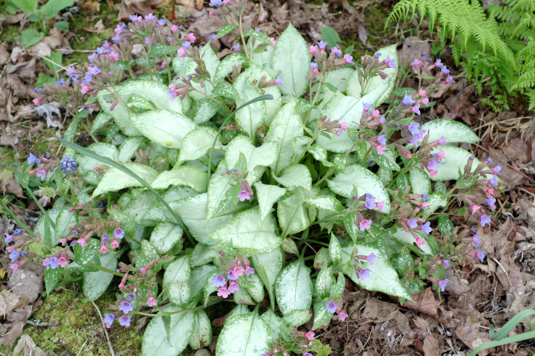 Shiny silver leaves edged in dark green give rise to spring masses of purplish-blue flowers held tightly against the foliage in spring. Extremely mildew resistant. A great shade & woodland garden plant with a proven track record.