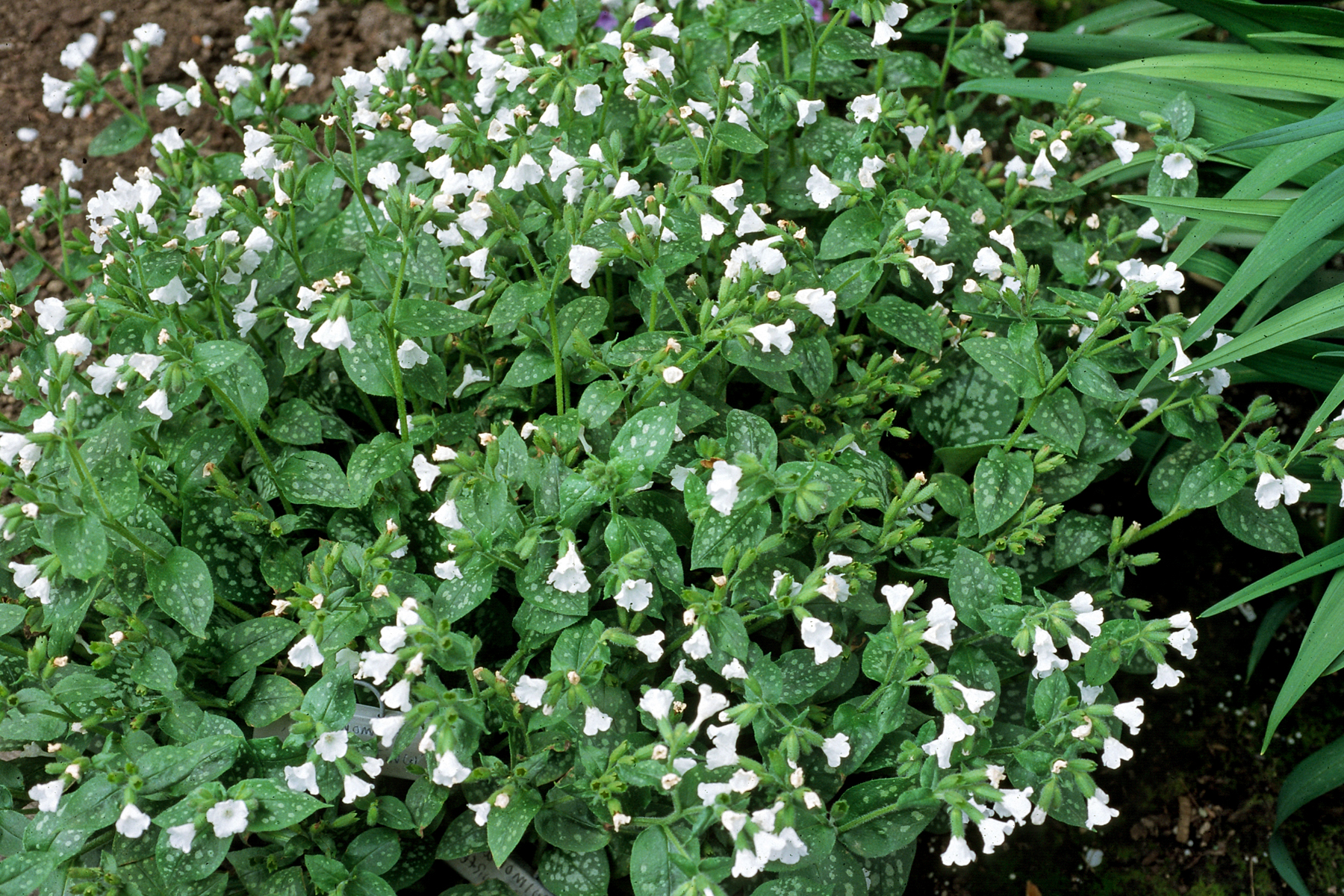 White speckled green leaves and white flowers. This lovely Pulmonaria will brighten the shade part of your garden with its very early spring bloom.