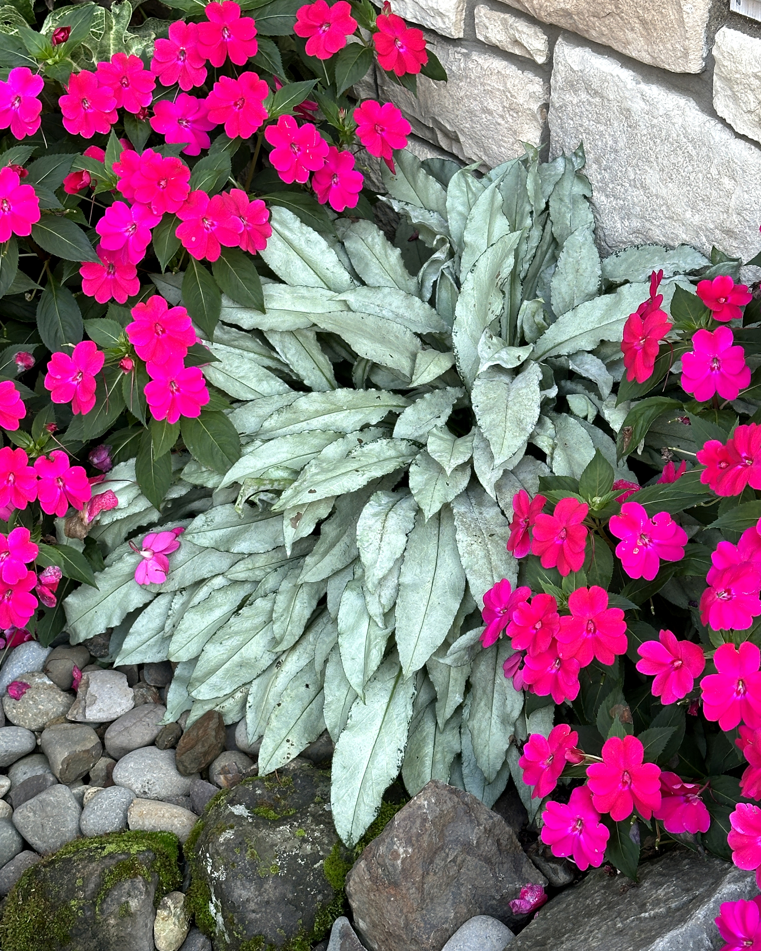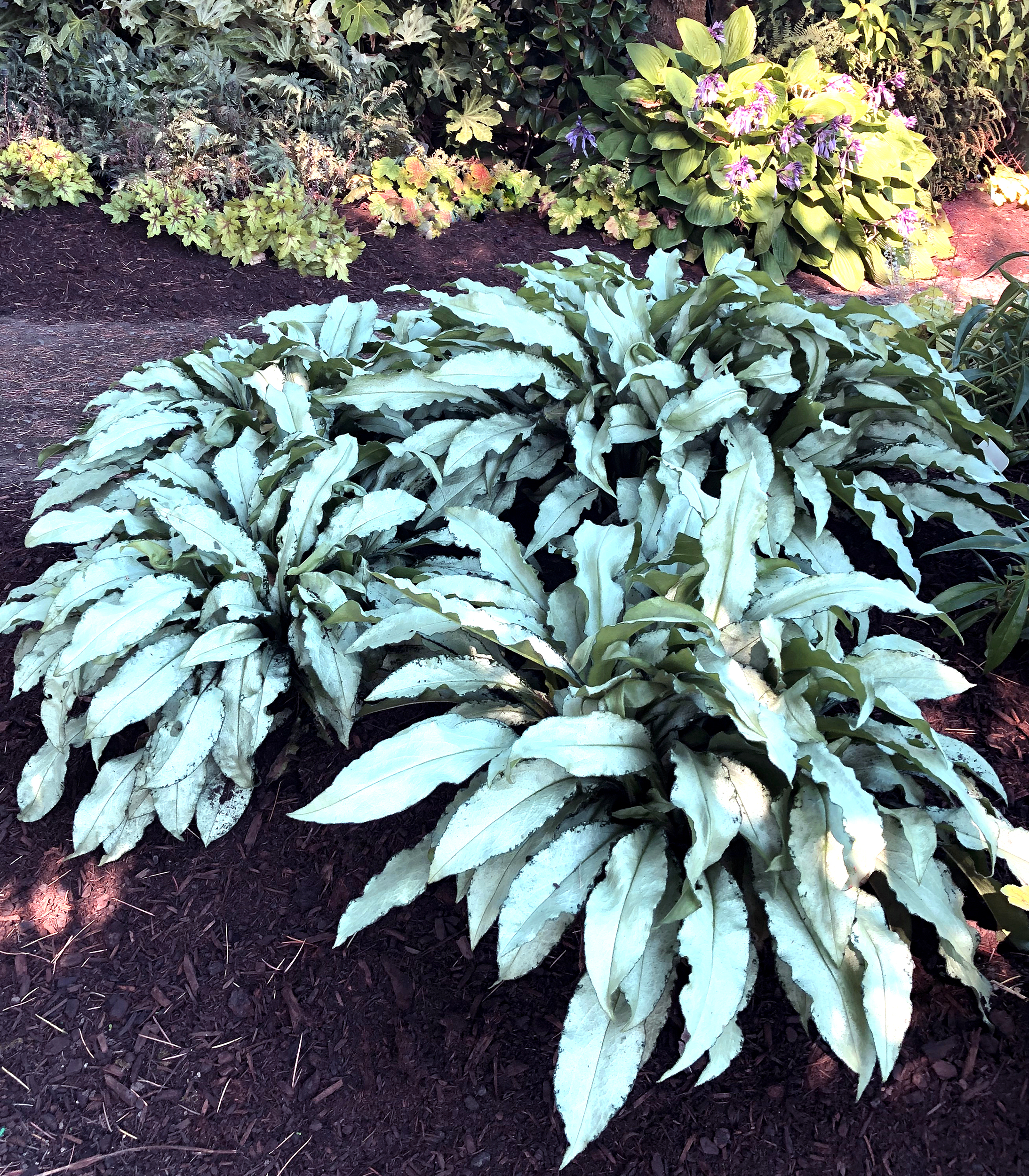 Large arching silver green foliage with wavy edged strap like foliage. Full landscape sized plant, vigorous and fast, 'Silver Scimitar' has a stately presence. Emerges each spring in a tight mound covered in bicolor pink and purple flowers, an early season hummingbird favorite. Performs well in both shade and full sun, perfect for borders and edges.