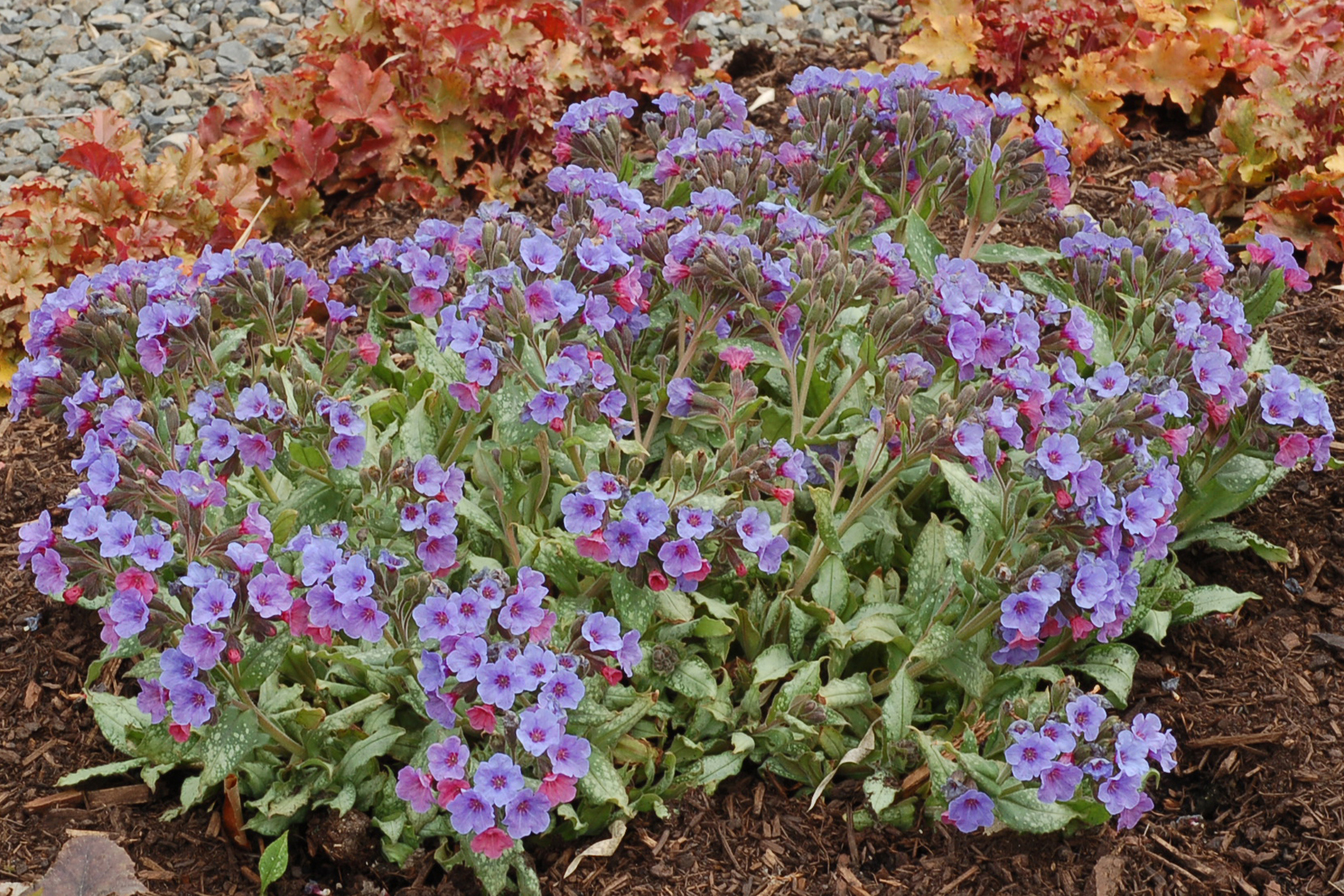 This Pulmonaria has large, and undulating silvered leaves on a low plant. Steel-blue flowers are some of the largest of any cultivar we carry. Mildew resistant.