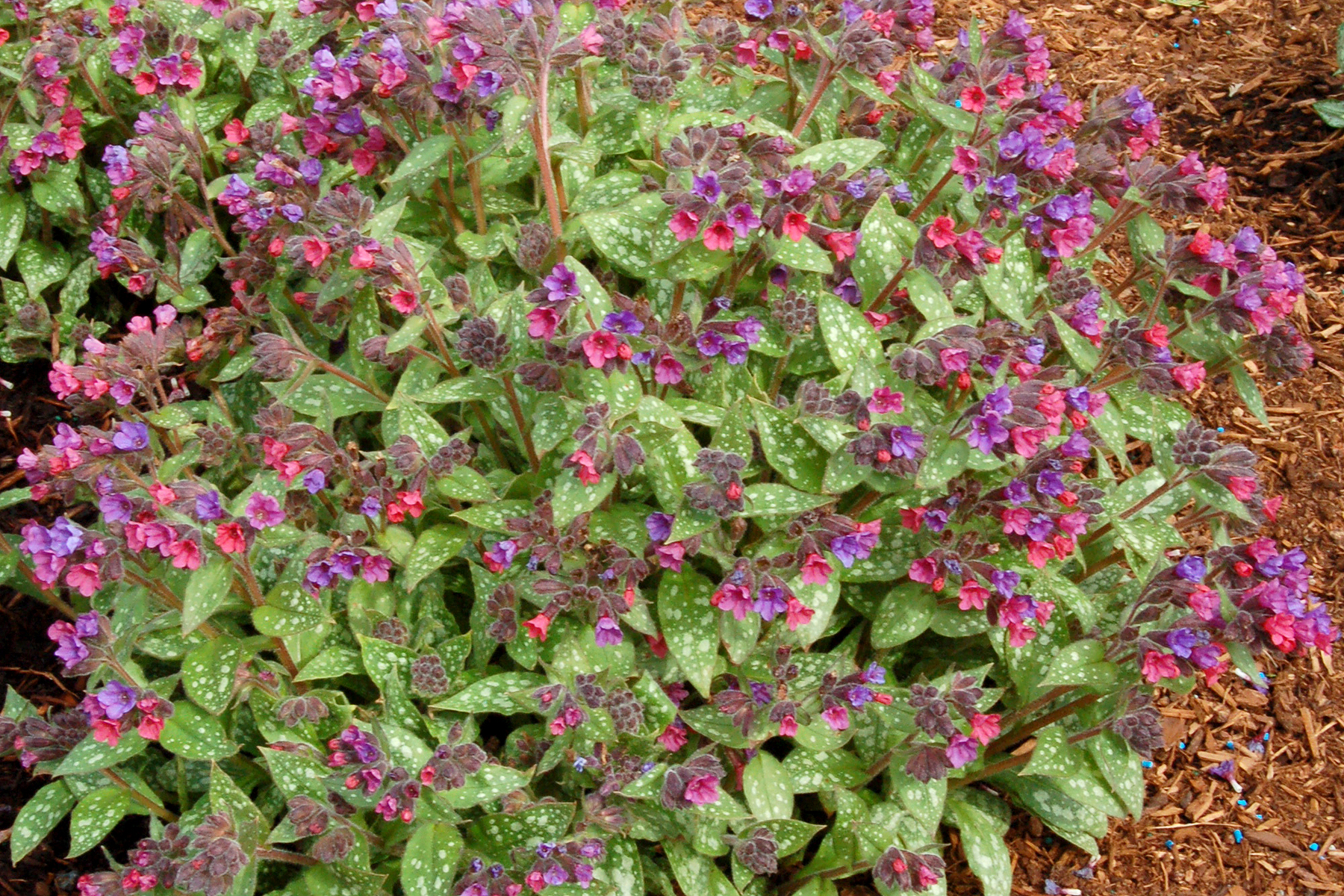 One of the longest blooming of all Pulmonaria with masses of outfacing magenta coral flowers that pop against the attractive, long, silver-spotted foliage. 'Victorian Brooch' bloomed for over 10 weeks in our Oregon garden. Mildew resistant.
