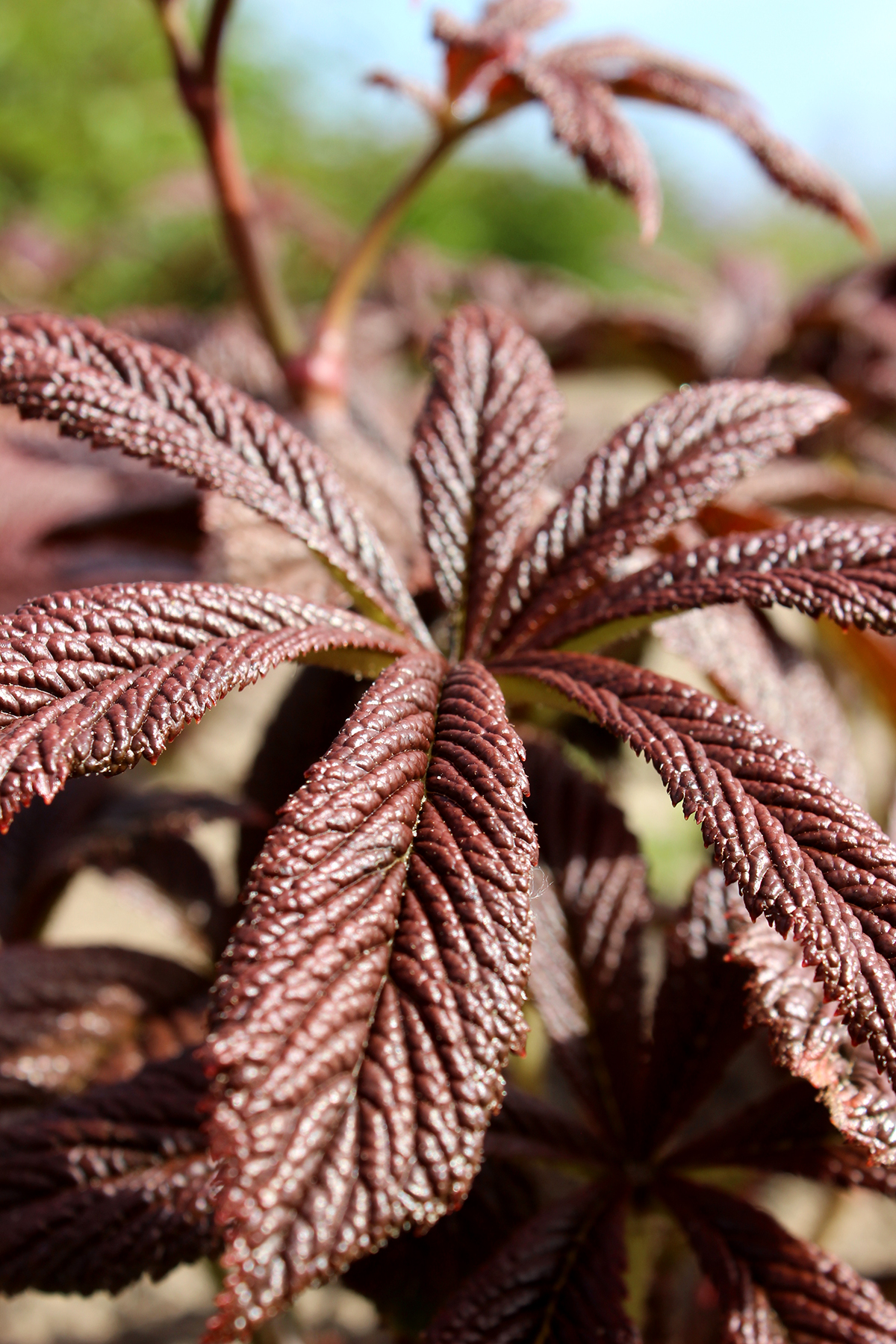 A shiny, bronzy beauty! The darkest foliage of any Rodgersia. The leaves are thick, glossy, indented and make a great sculptural addition to your woodland garden. Pink flowers emerge in late spring above the mound. In spring, the huge bronze leaves emerge like a peacock's tail!