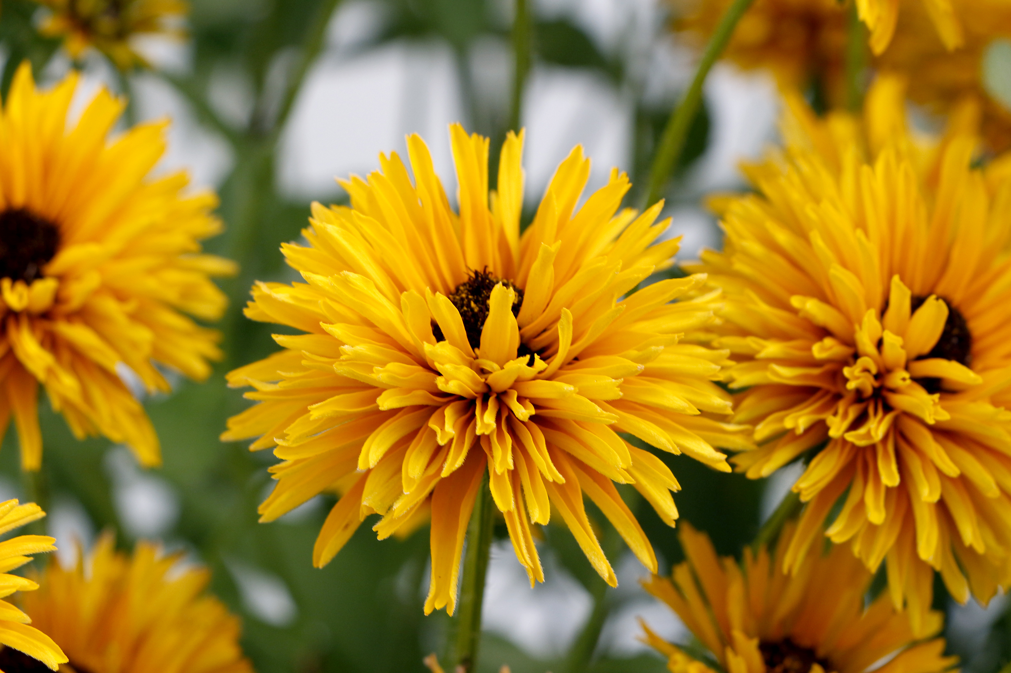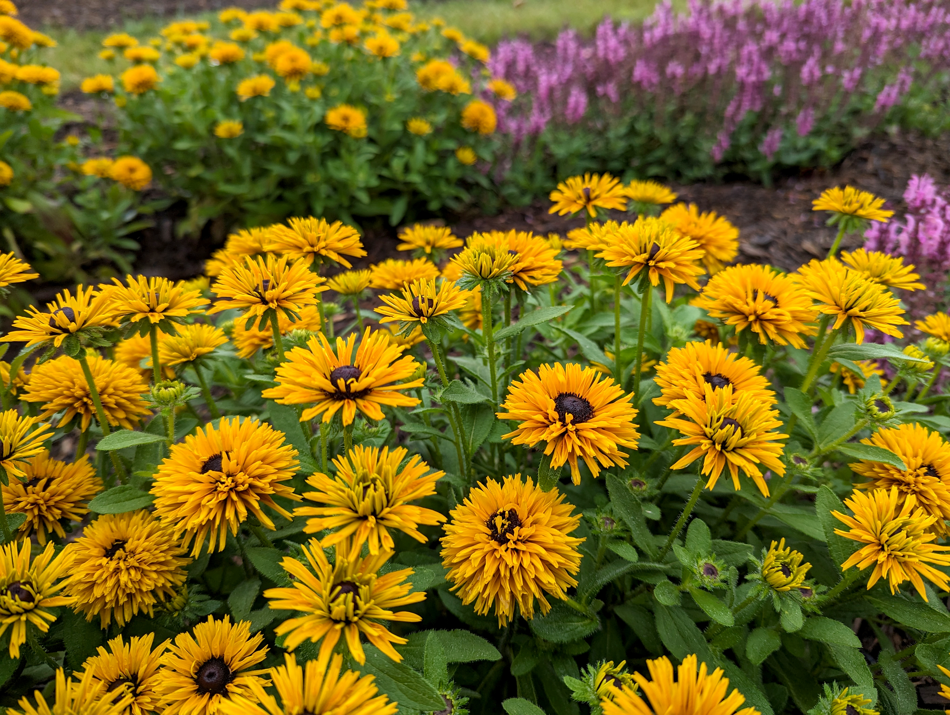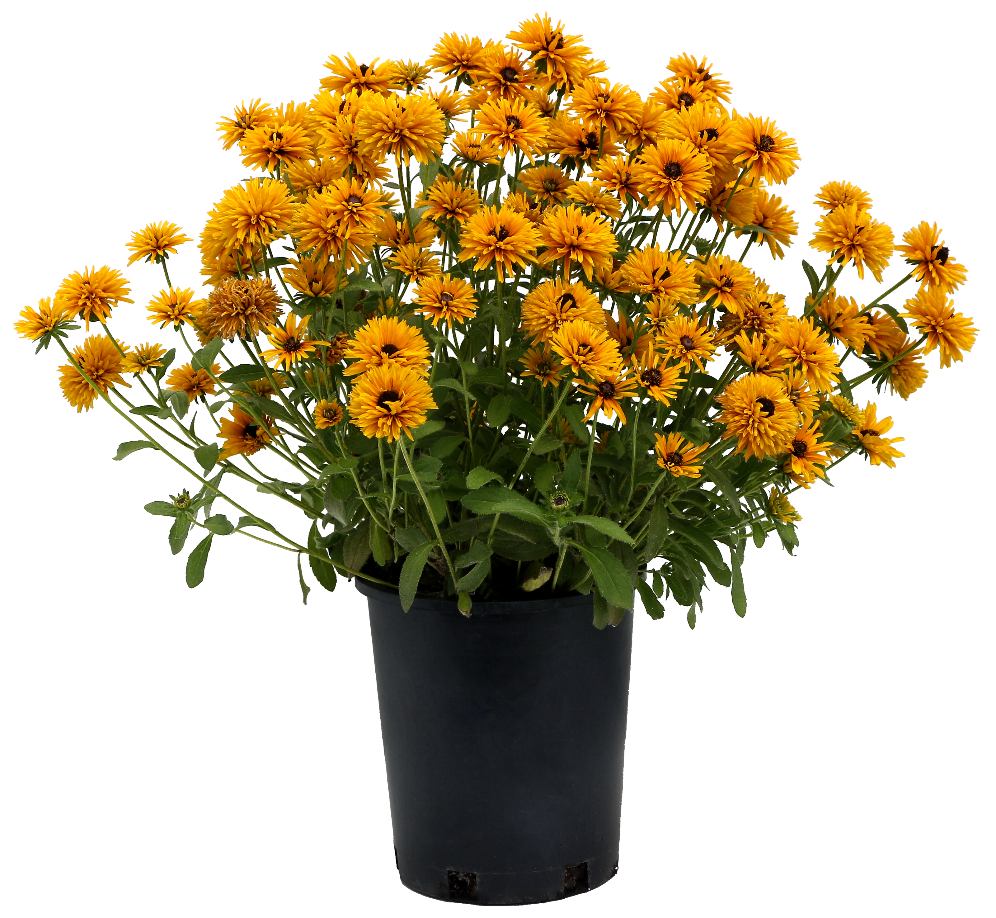 We think this unique little Rudbeckia will wow you with its cuteness and longevity. Naturally forms a tight mound of emerald green foliage topped by pom pom perfect golden yellow flowers centered with a dark chocolate eye. Each flower is covered with a sunburst of strap thin petals, which do not brown or fade, but develop a contrasting red edge with age. Bloomed June through October, both in the ground and in the greenhouse. Fast and vigorous, a favorite of every visitor. Great commercial sales potential; ideal for summer through fall containers, annual bedding and displays. Retailers’ Choice Award Winner at Cultivate 2024.