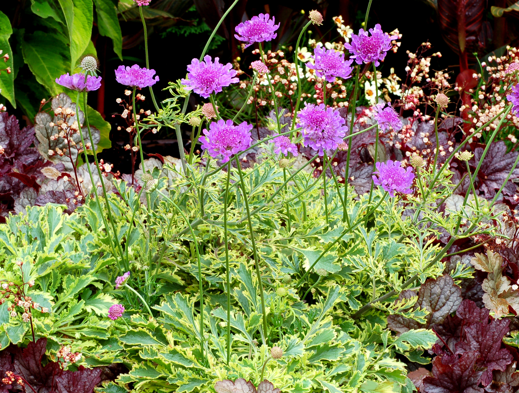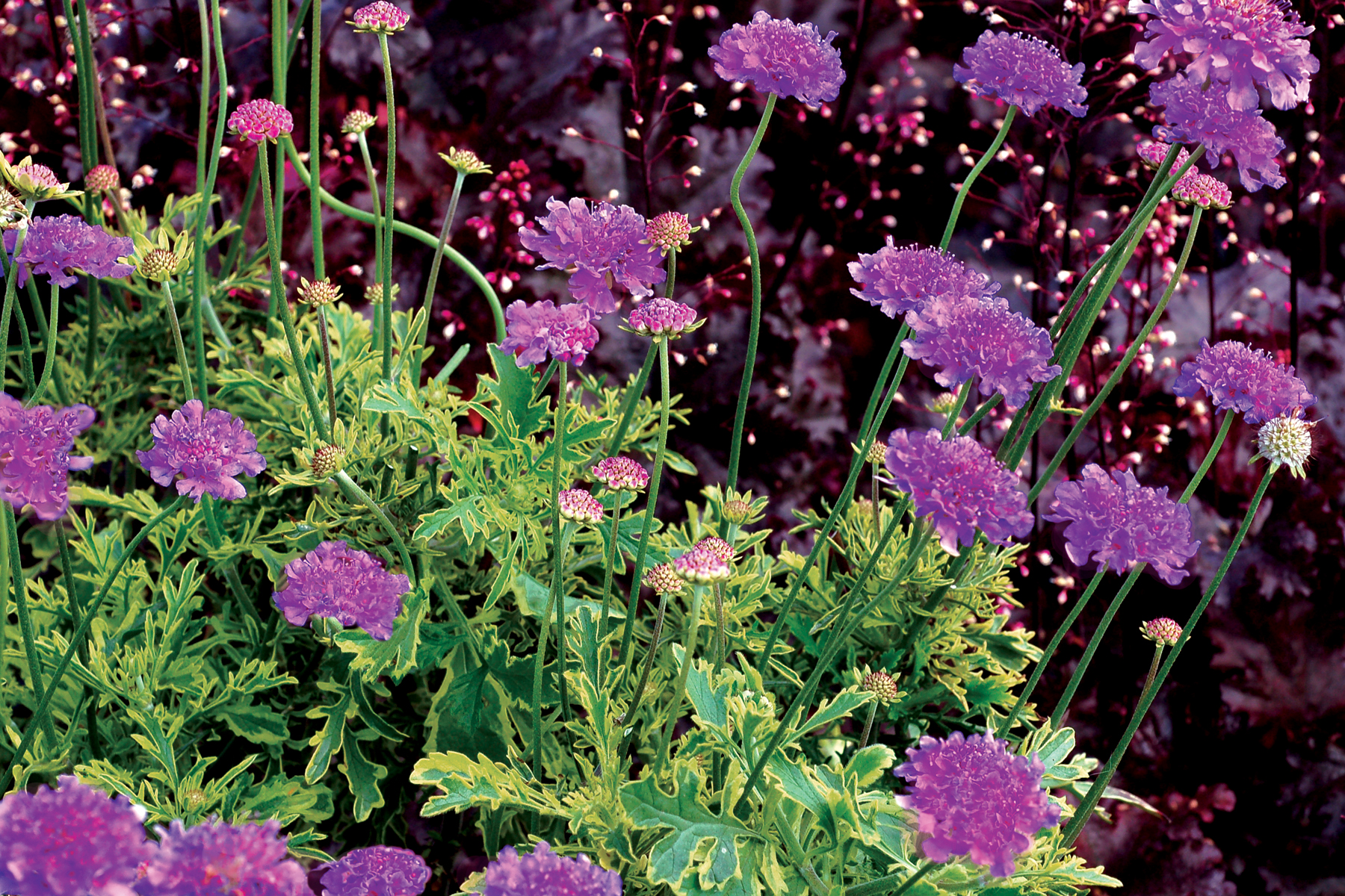 Spark your imagination with the fantastic frilly foliage on this variegated Scabiosa! This splendid, lime-edged sport of 'Vivid Violet' delivers the same flower-power and mildew-resistance as the original, but not quite the same hardiness. The foliage makes a great texture as a component in a container and the plant carries blooms all summer!