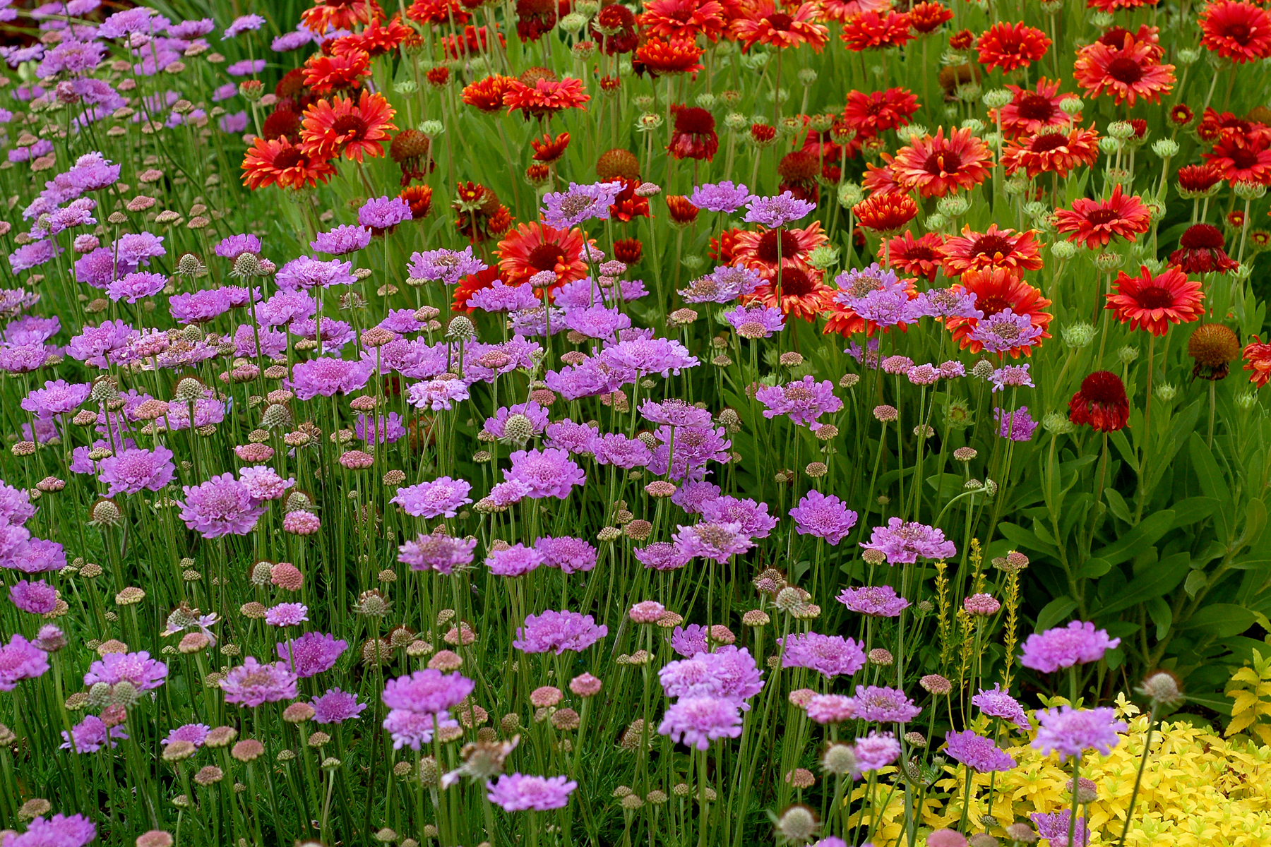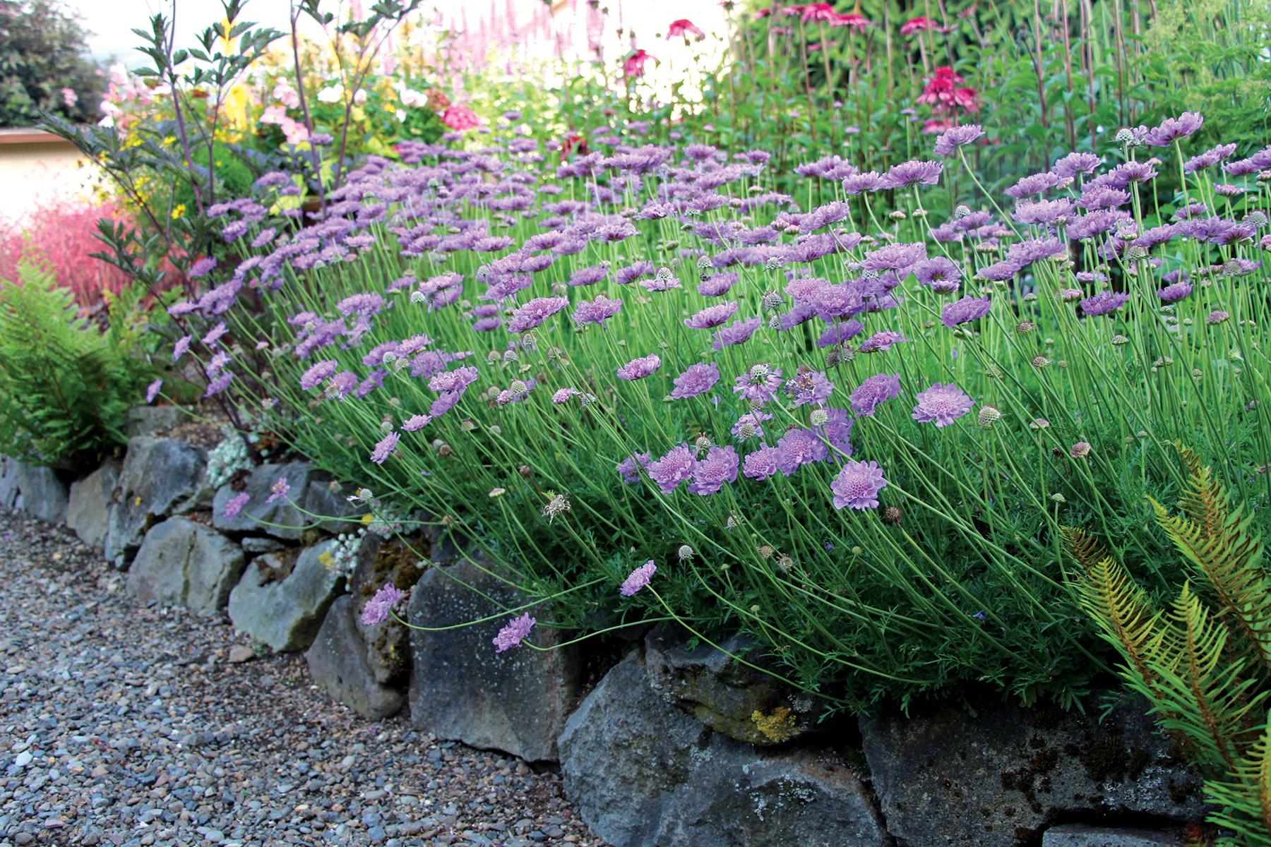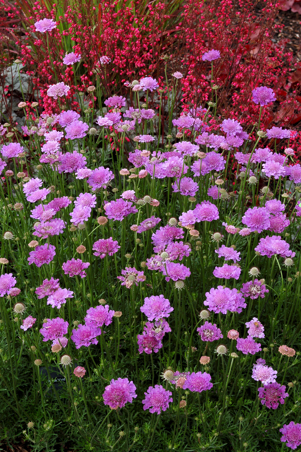 Large, vivid-violet pincushion flowers set atop low mounds of mildew-resistant, frilly foliage. Very heavy flowering and will bloom continuously from late spring to frost. Vigorous grower! Nice.