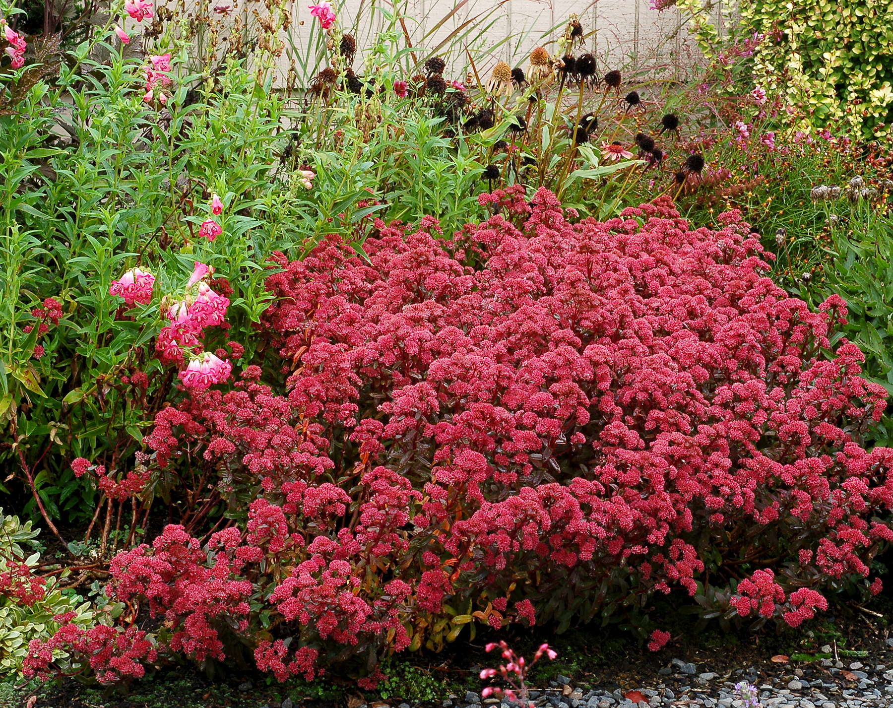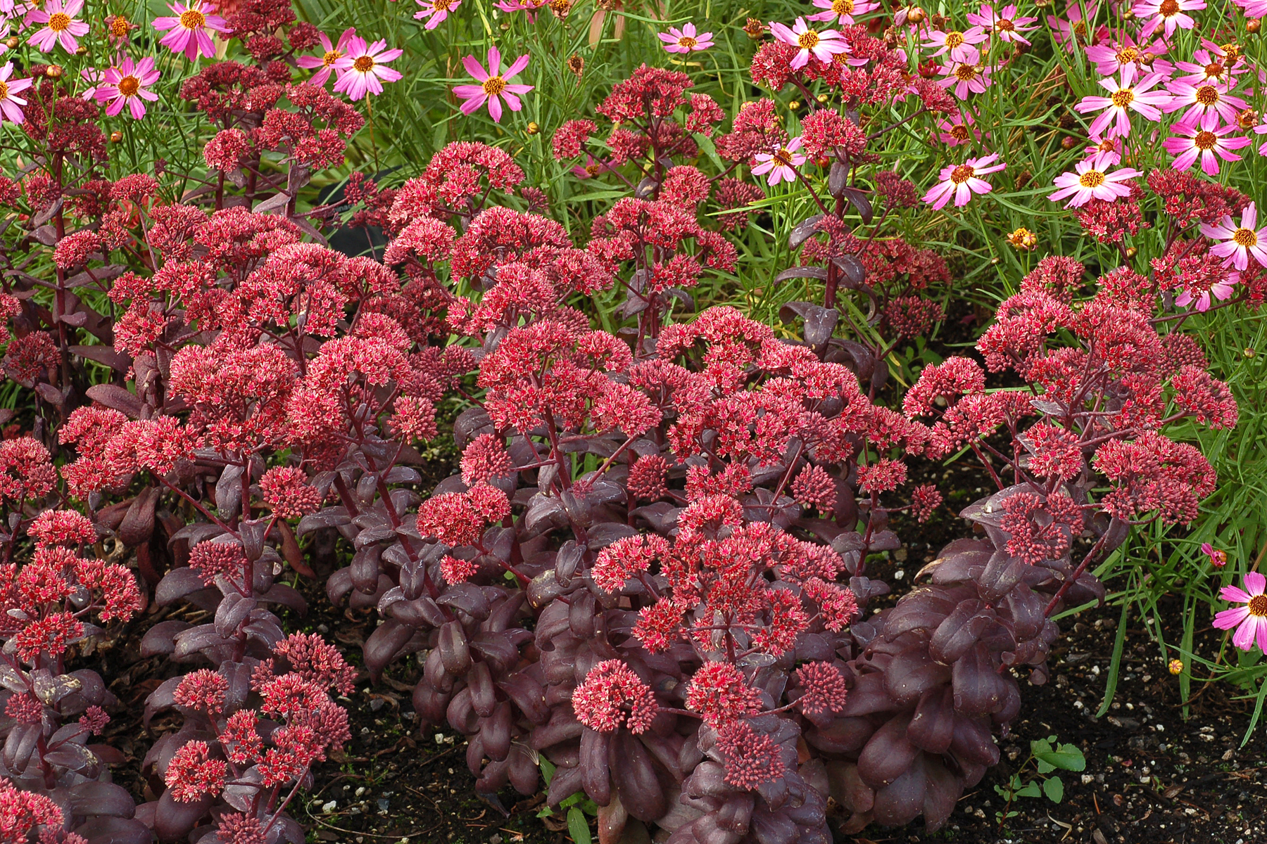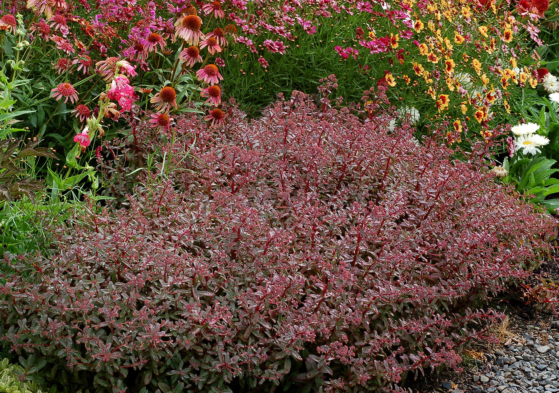 Flat, spreading habit with small blue-green leaves that darken in high light. A completely different look. Deep rose pink flowers in late summer mature to amazing shiny red seed heads. These seed heads extend the showy season for months.