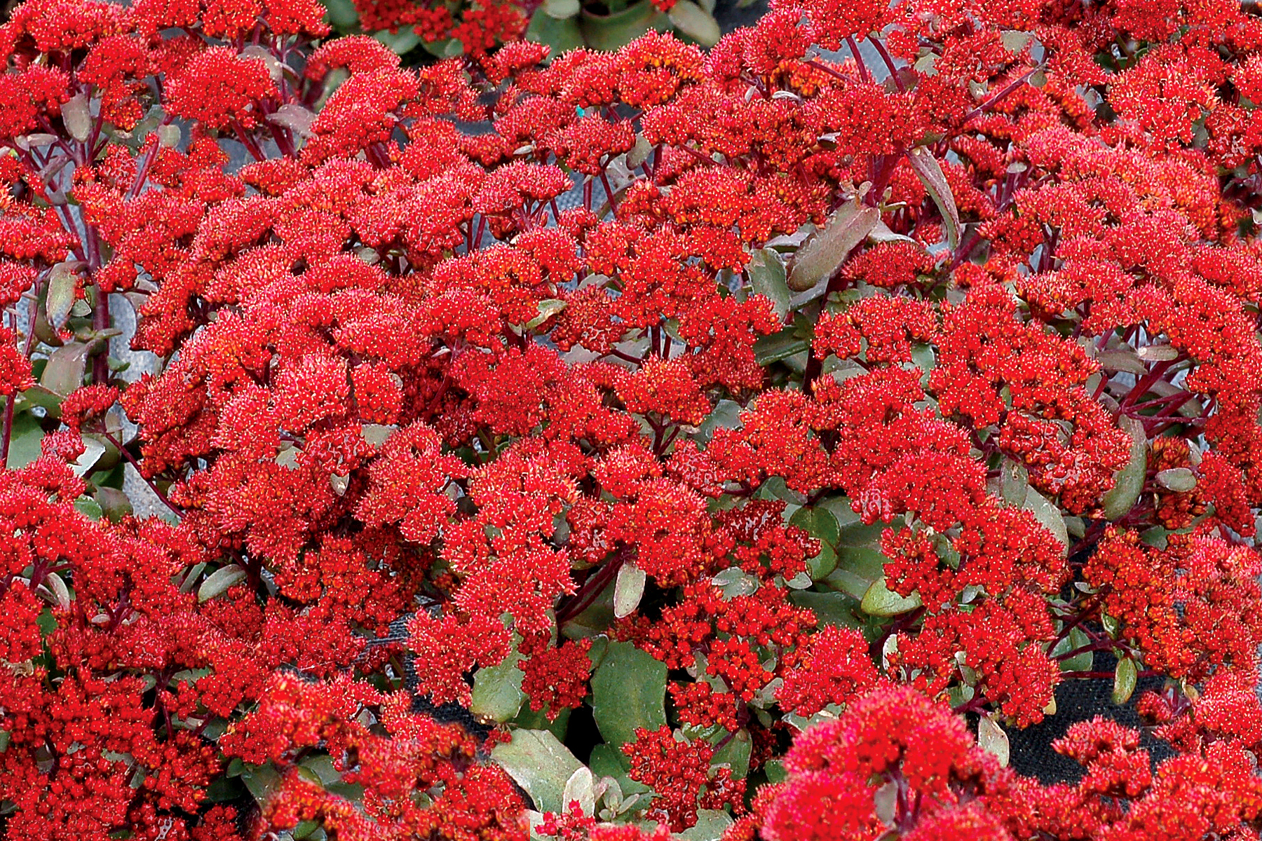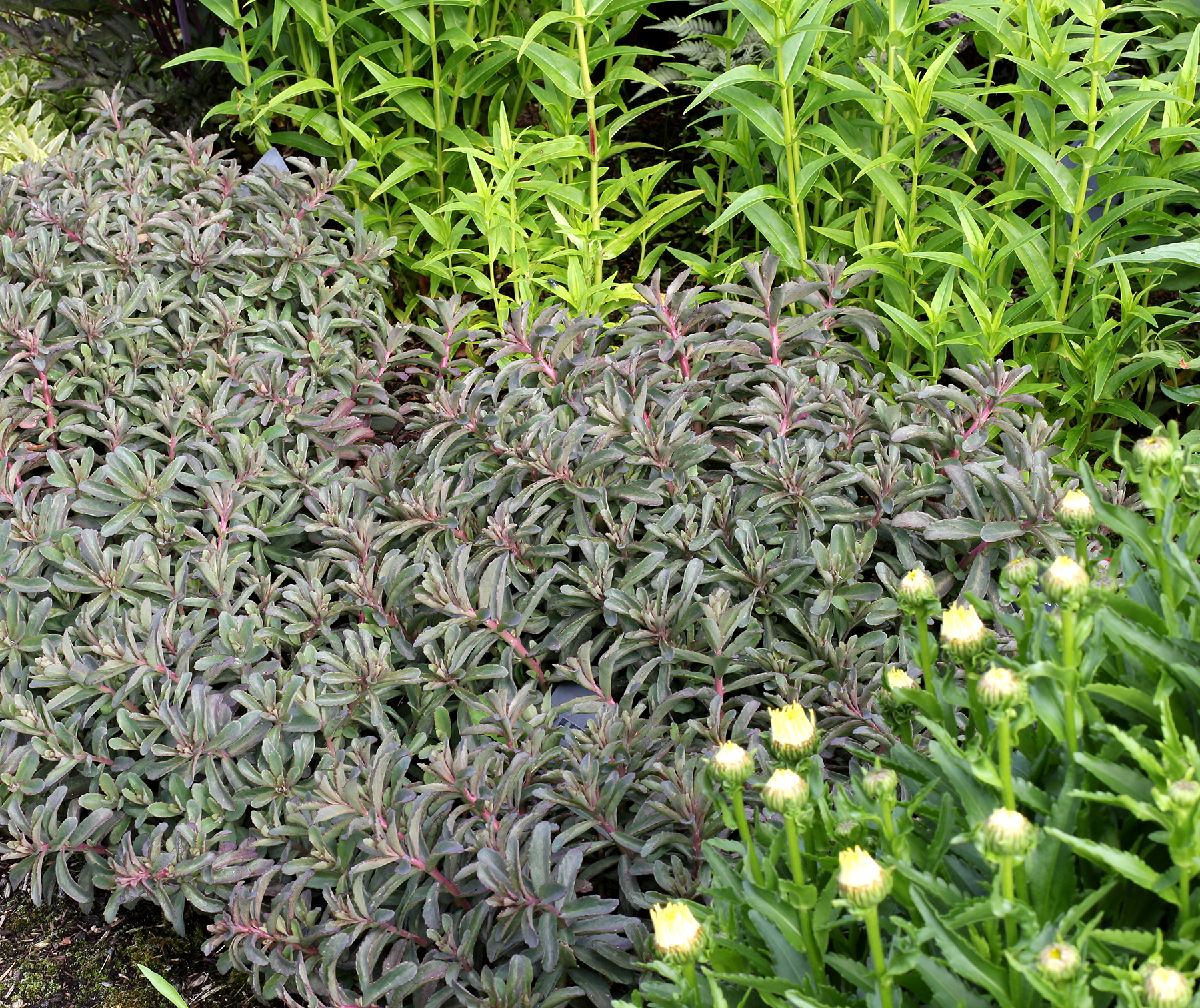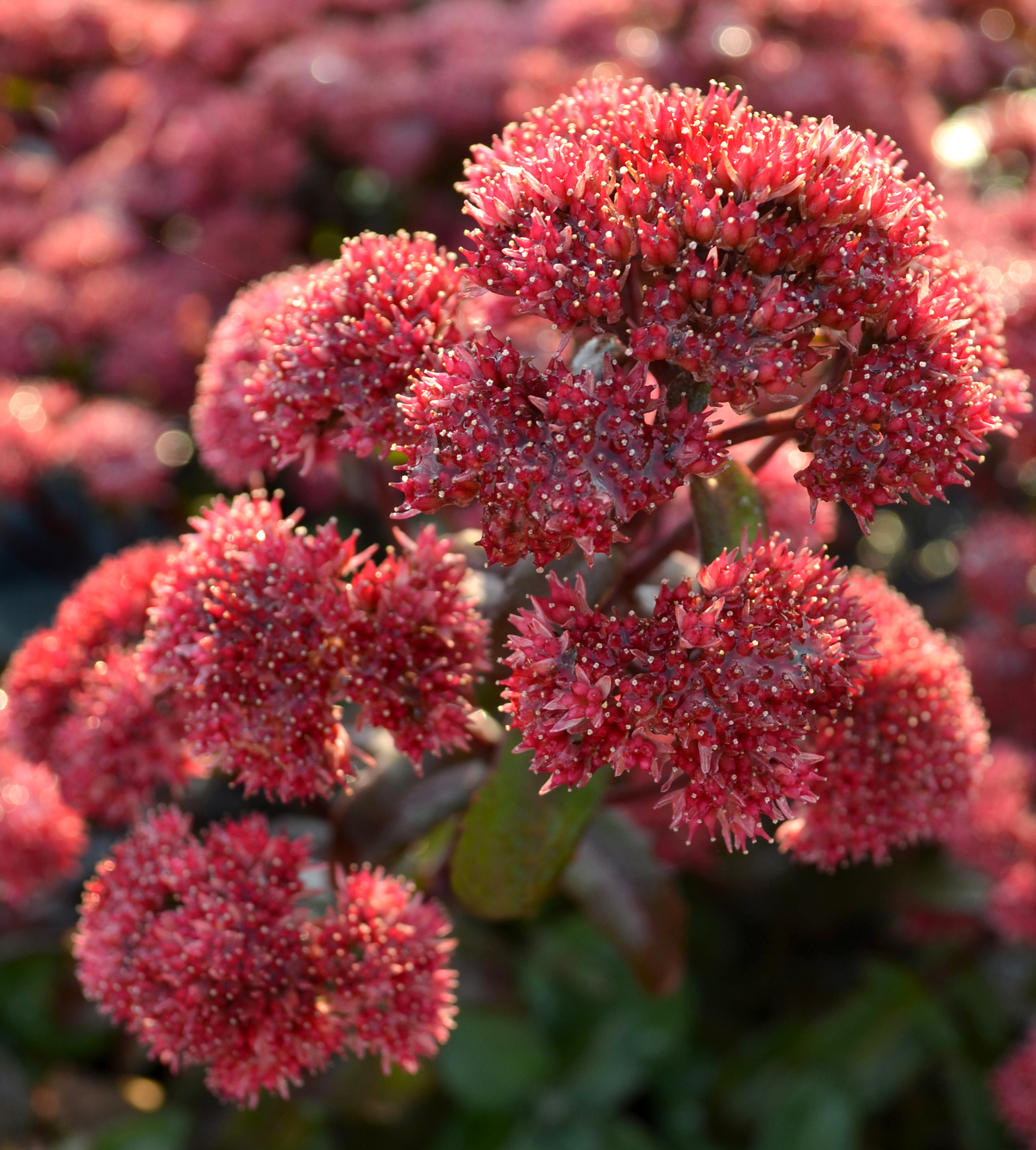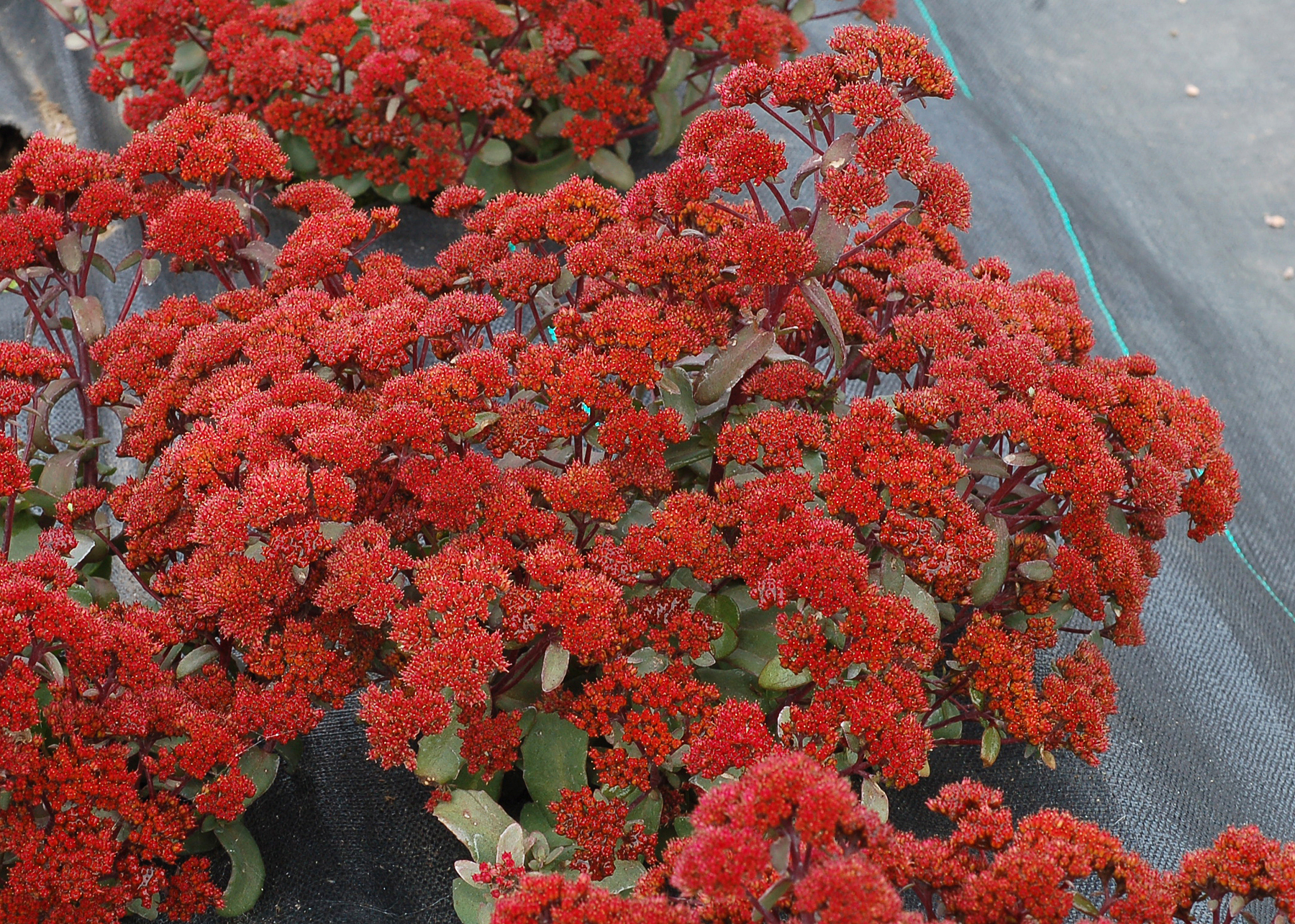 Flat, spreading habit with small blue-green leaves that darken in high light. A completely different look. Deep rose pink flowers in late summer mature to amazing shiny red seed heads. These seed heads extend the showy season for months.