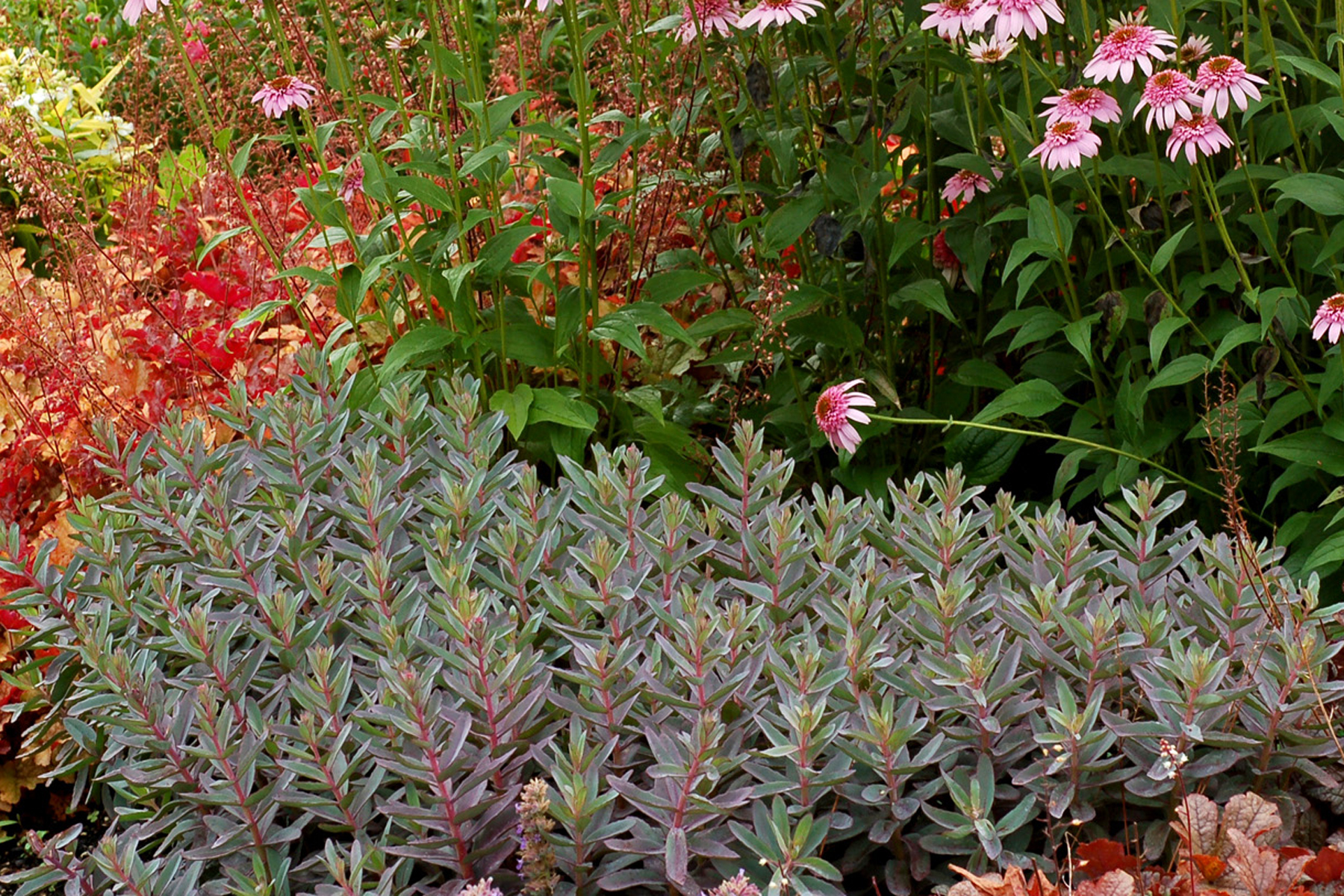 | How Different? | Forms a low spreading mound with blue gray leaves (tinted purple in summer) and pink buds to rose pink flowers. |