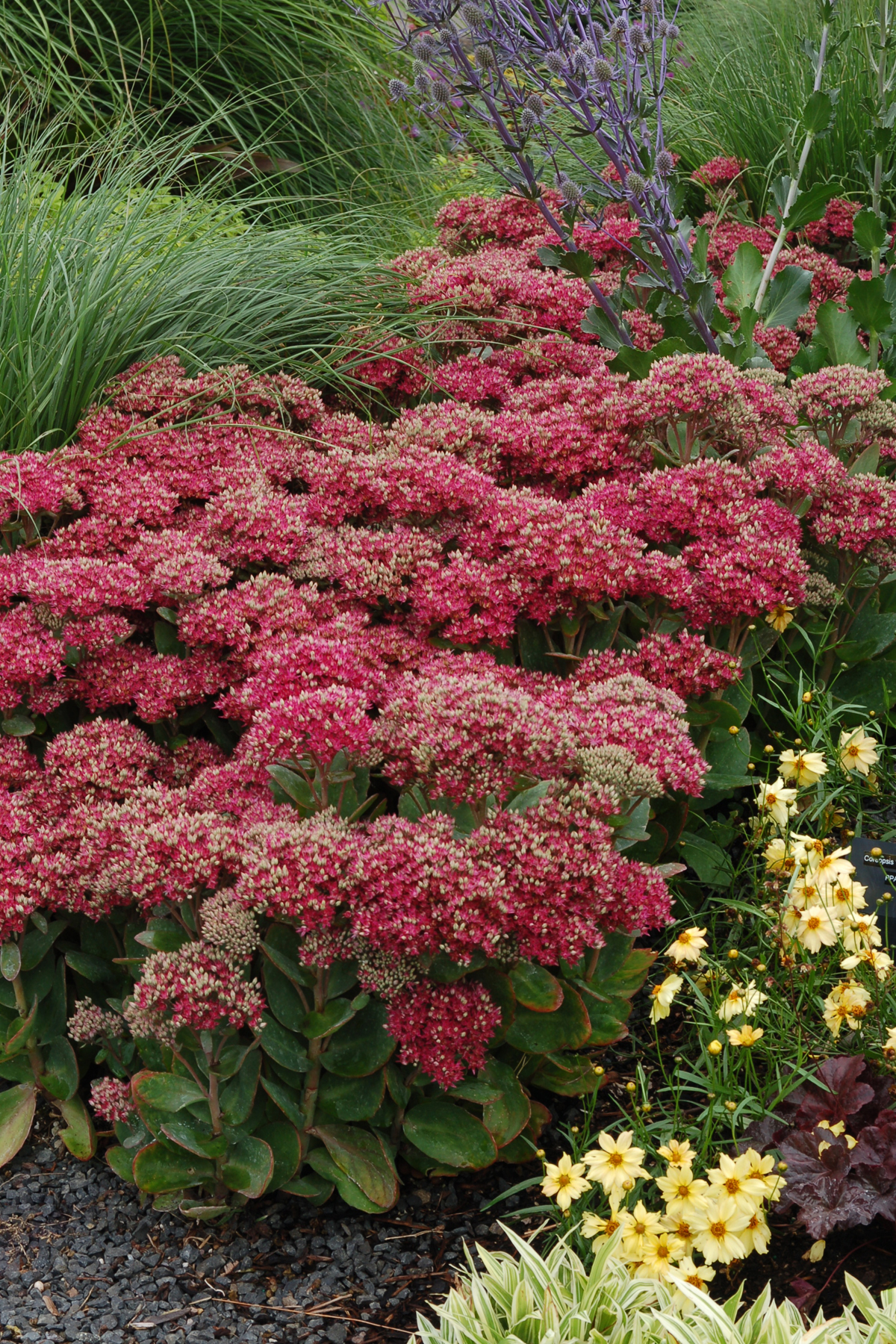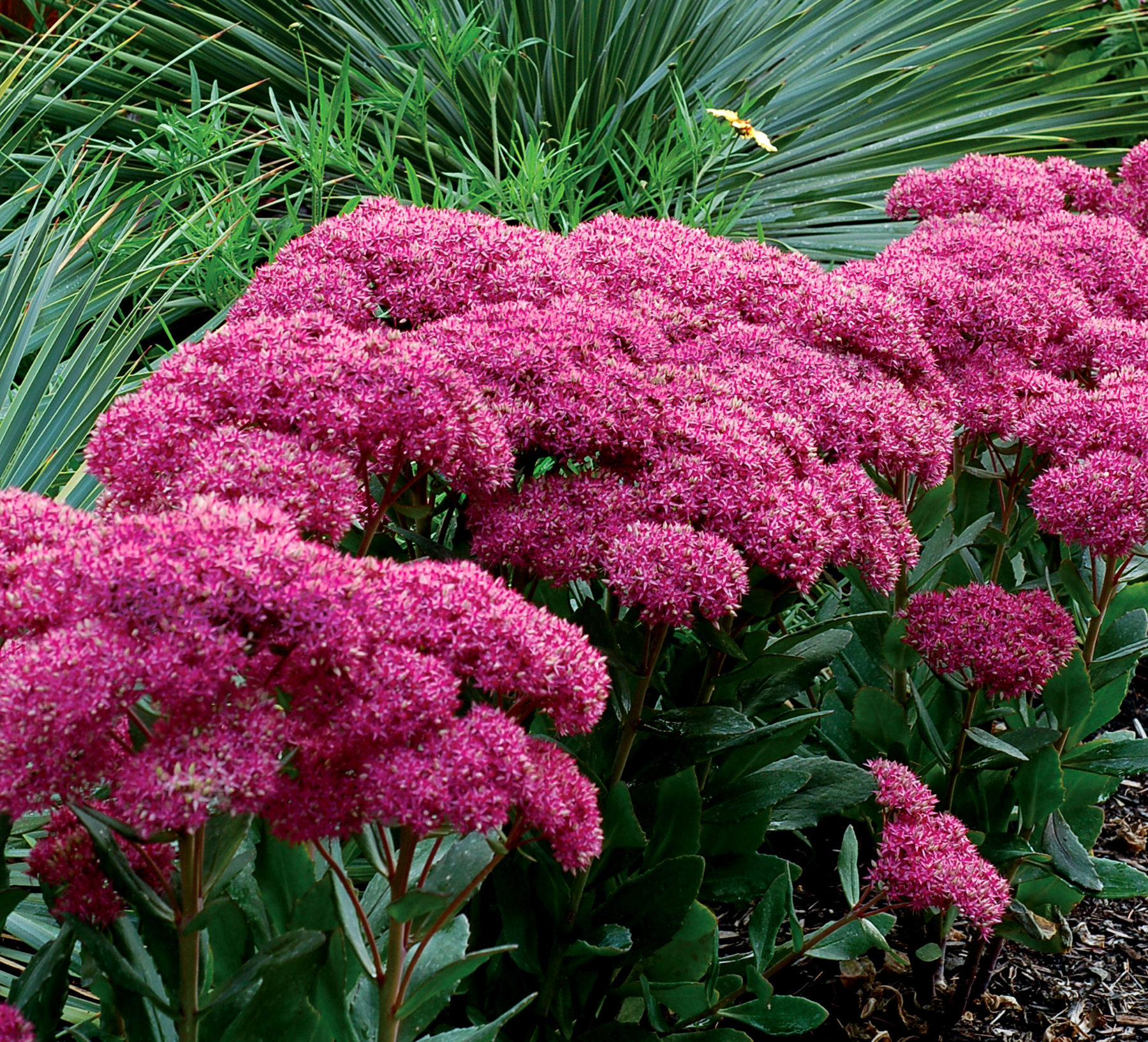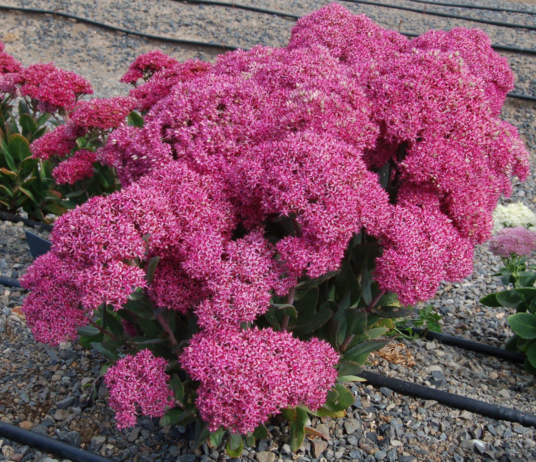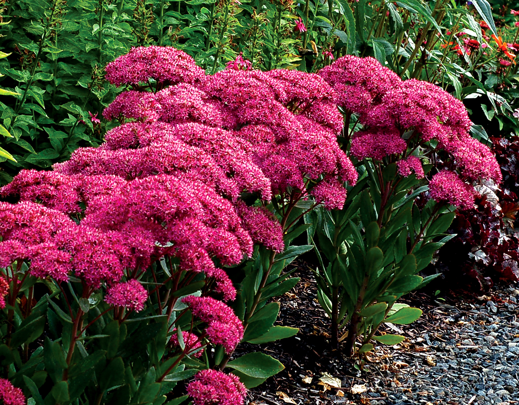 This dusky S. spectabile hybrid has tight foliage and strongly contrasting colors between its light buds and dark mauve flowers. Richer tones and better foliage than S. 'Brilliant'. Upright habit and short stature. Won an Award of Garden Merit from the RHS in 2006.
