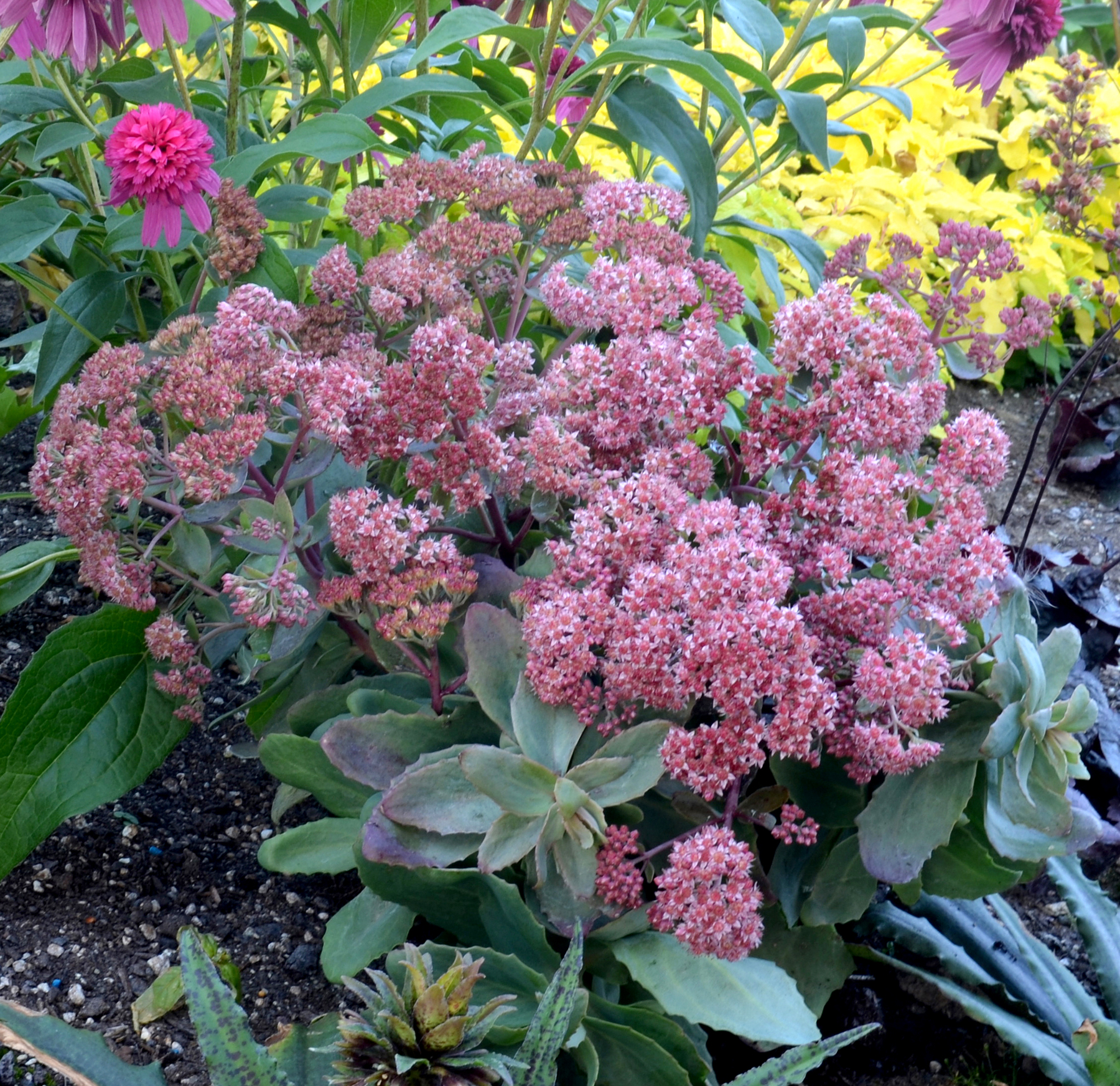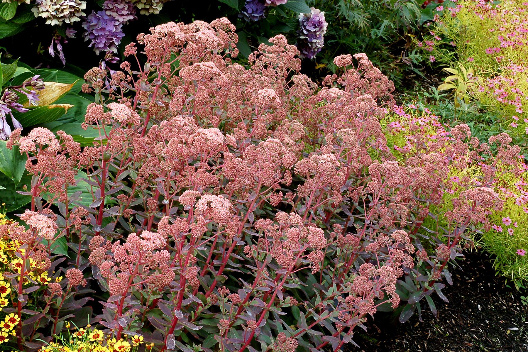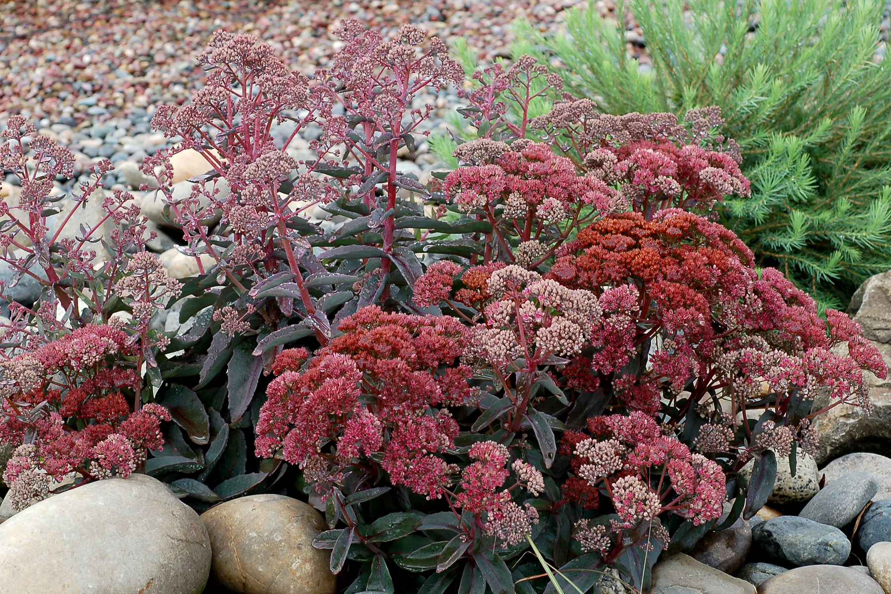 Vigorous, multicrown, low habit that fills a container quickly. It has blue-green leaves in the spring that tint red-brown on the edges in the summer, matching its red stems. It has very large clusters of lovely pink flowers in late summer.