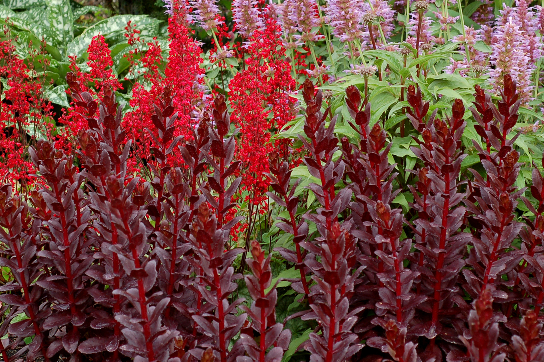 | How Different? | Unique leaf color that holds all season. Low multi-crown habit + glossy purple brown leaves + dark rose flowers. |