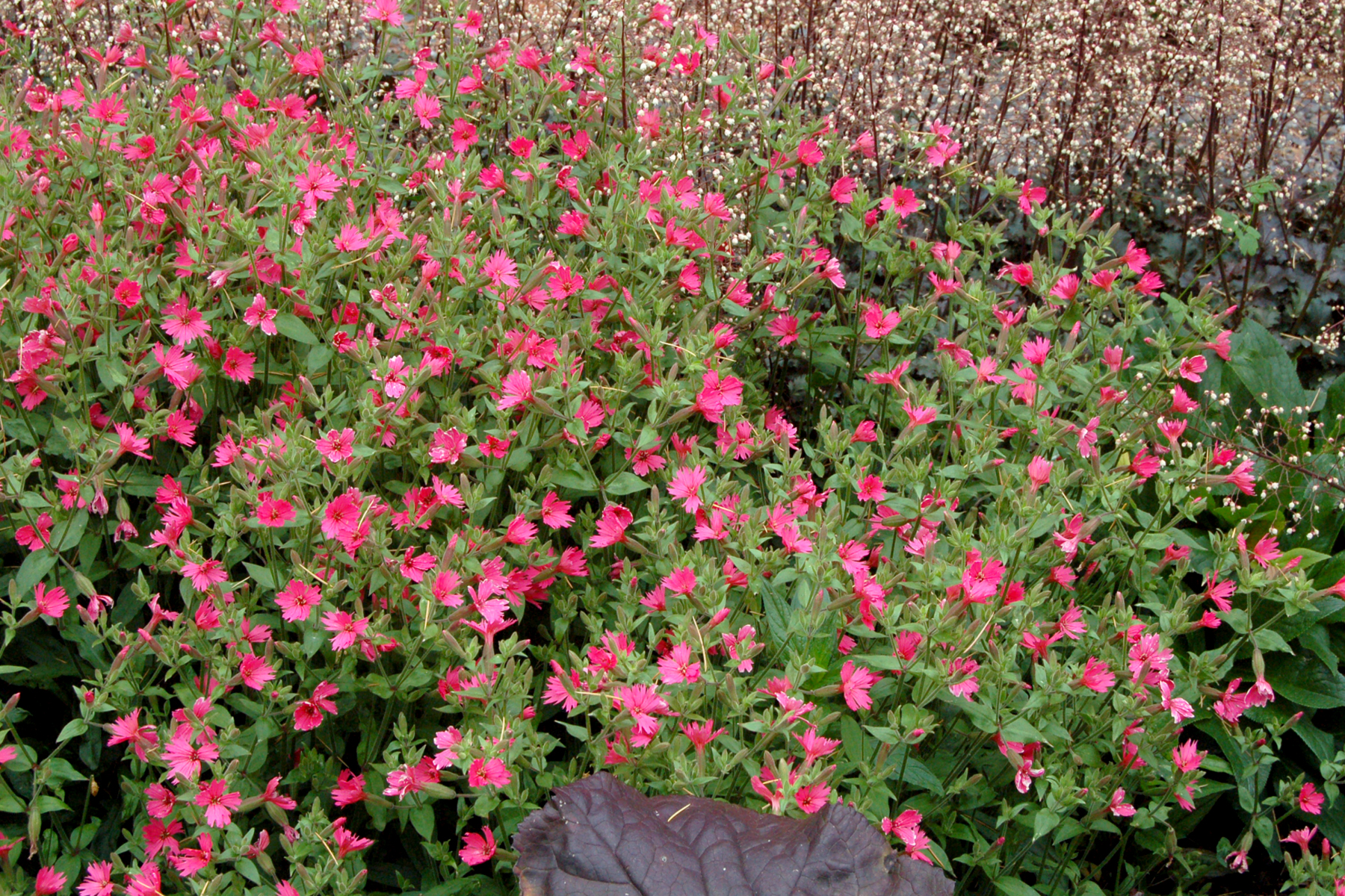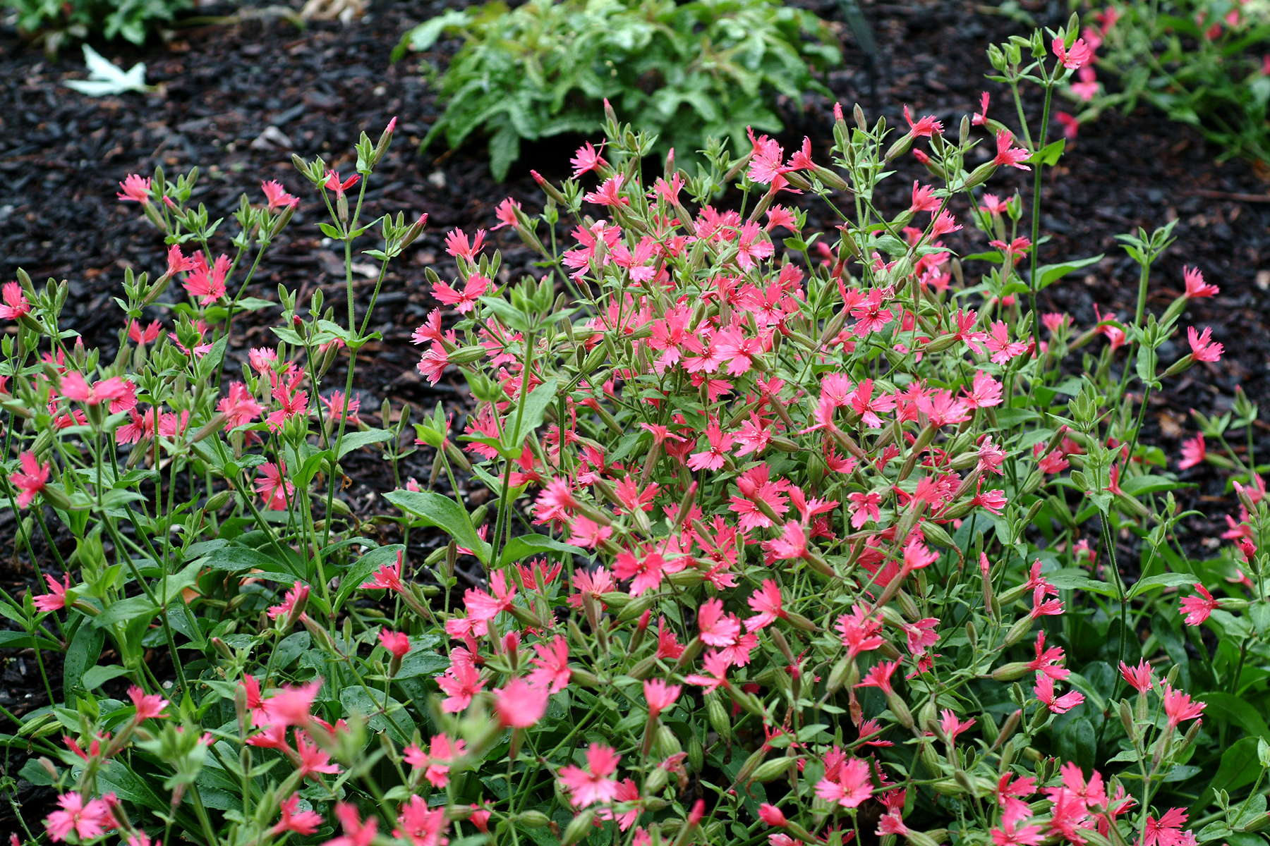 Here's an amazing hybrid of Silene regia (the wake robin, one of the Southeast's favorite wildflowers). Totally hardy and sterile. The beautiful coral and cut flower petals lie close to the compact foliage and being sterile, the flowers seem to come out continually! Thrives in heat and humidity. Try in containers. Needs good drainage. Blooms all summer if cut back periodically.