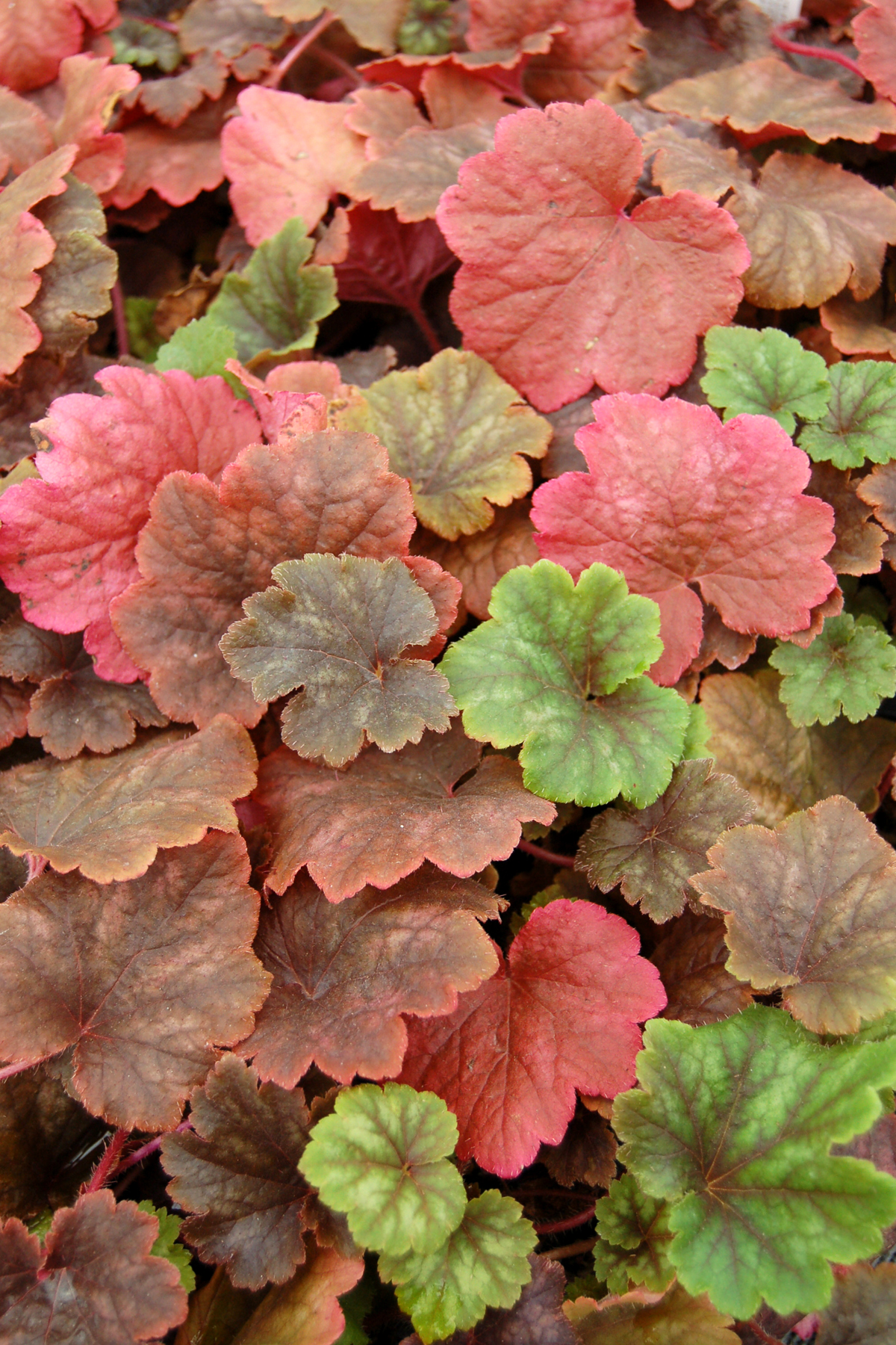 These Tellima are especially impressive in the fall and winter with their bronzy, quilted foliage. Spring brings fringed, chartreuse flowers, which fade to pink. Leaves are green with a silver overlay in summer.