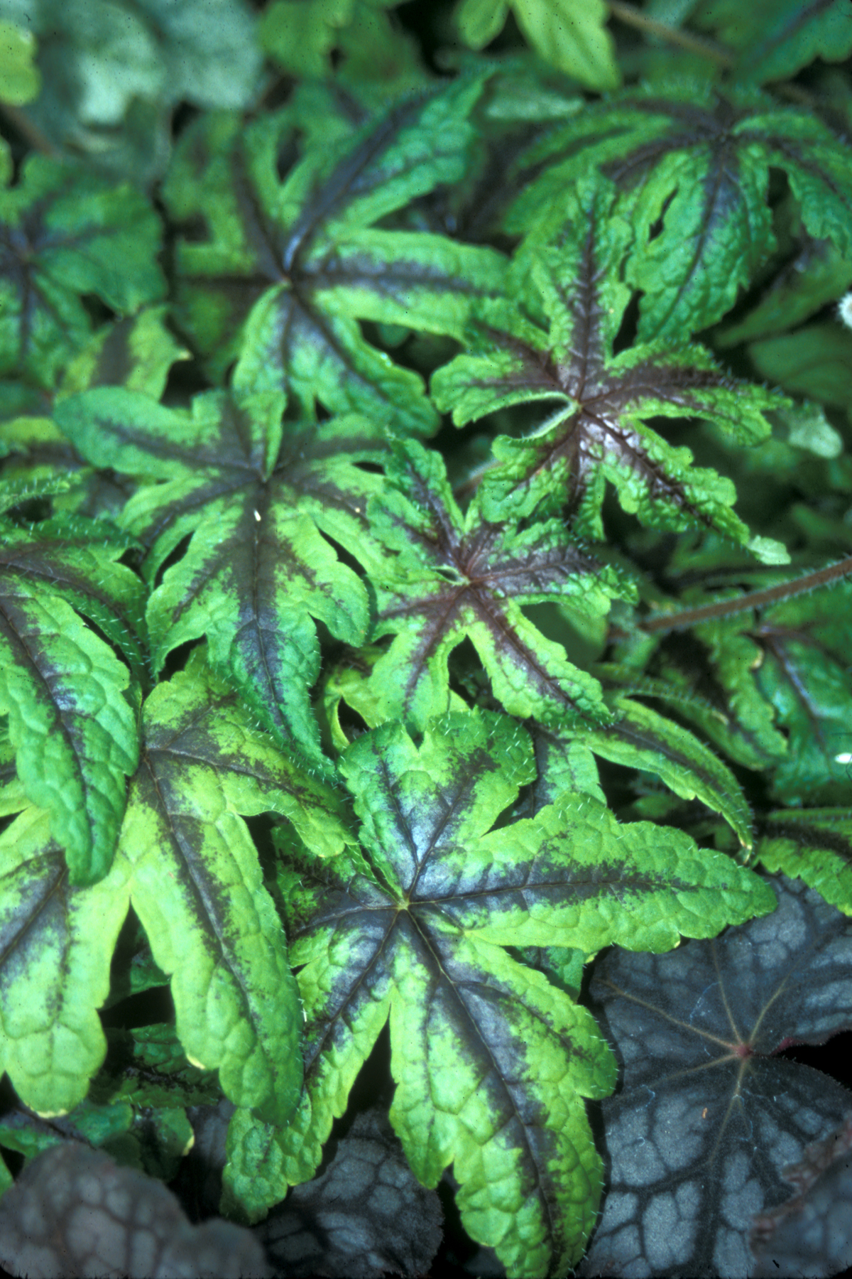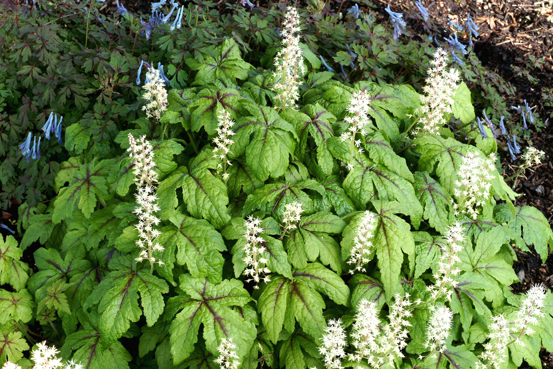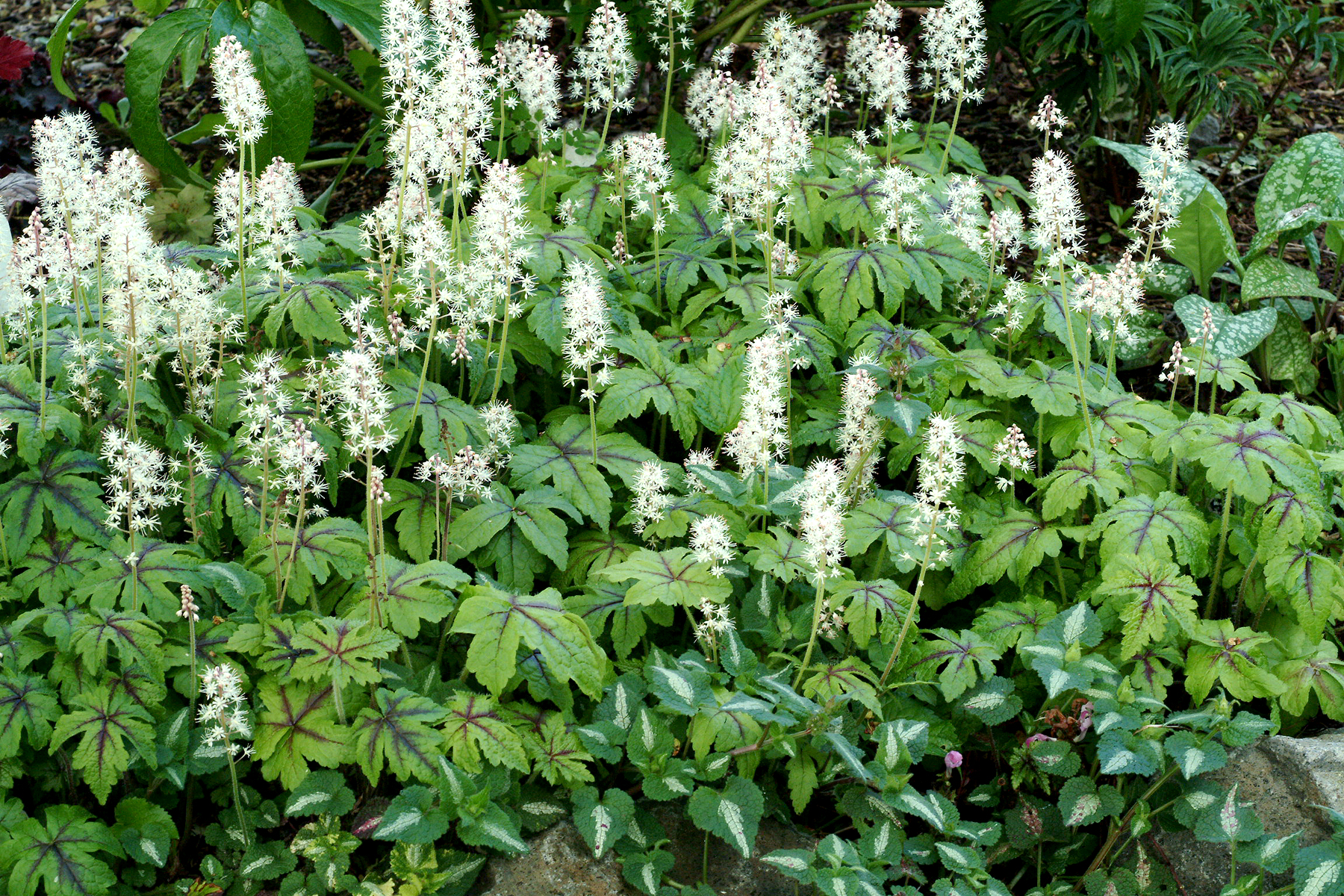 Bold, well-marked foliage, a creeping (not running) habit and large white flowers. If you don't want your trailing Tiarella to run too far this one is for you. It keeps some green all winter in Oregon rather than getting dark for excellent winter interest. Excellent vigor.