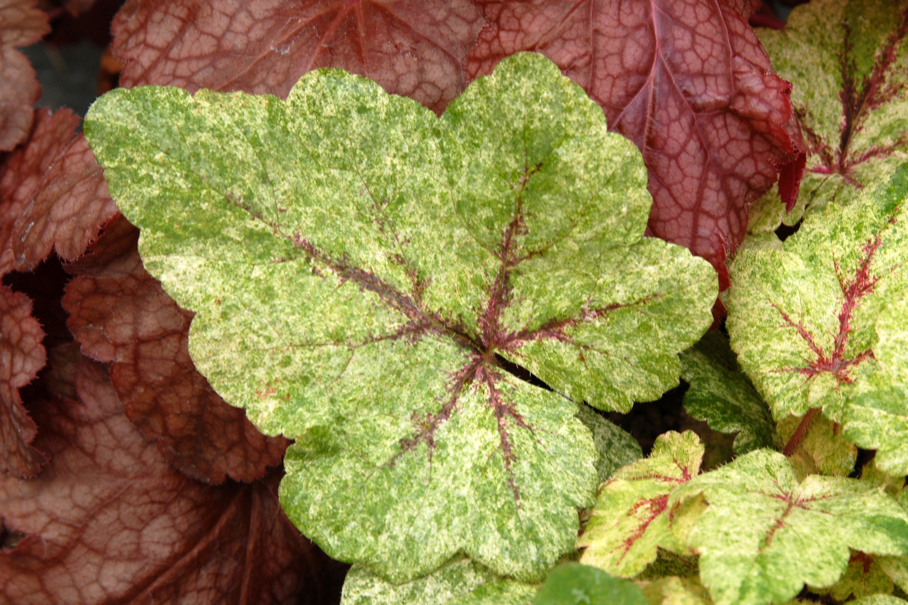 Bred for vigor, this beautiful Tiarella is variegated and colorful. 'Mystic Mist' has bright green leaves with white speckled variegation and prominent red veins all year. Spring blooms are white and foamy. Fall color has striking pink tones. Fast growing clumping habit. Needs good drainage.