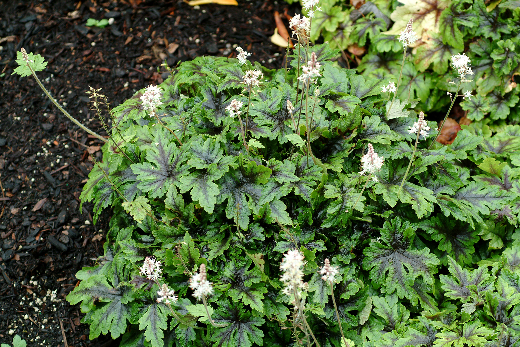 The best, black centered, palmate-cut leaves are edged with contrasting neon-green in spring and topped with large white flowers. This huge leaved cultivar glowed in our trials and has earned respect at the retail front.