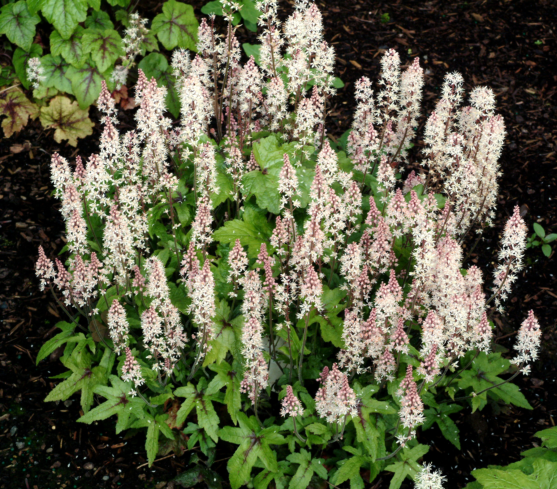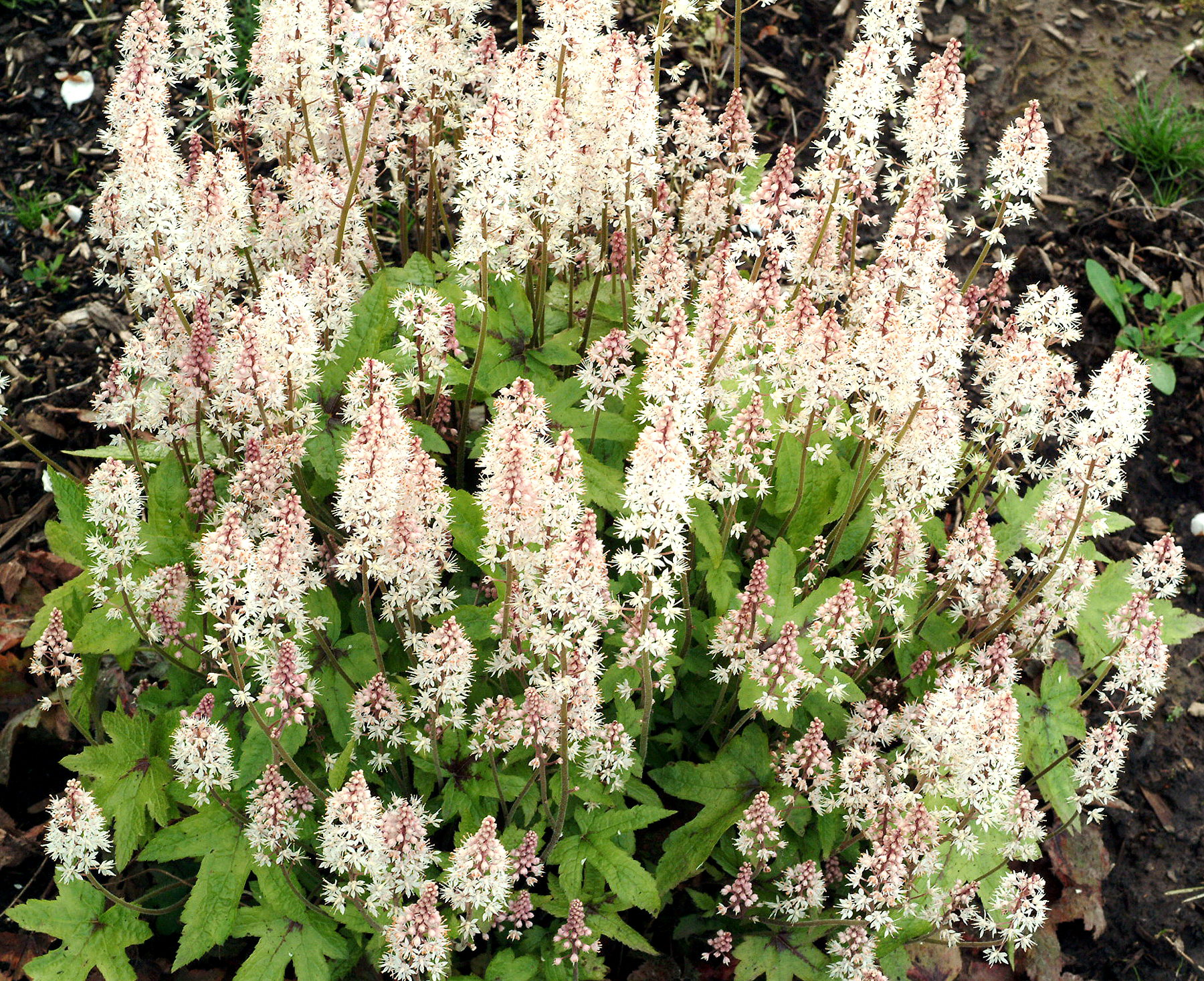 This plant is a champion for flower color, form, fragrance and spike density. From internet: ” 'Pink Bouquet' forms a restrained compact foot-tall mound of maple-like leaves with a maroon heart. In March it sends up its stems with tiny pink buds that burst open, for April or May, into sprays of pink & white flowers forming little upright pyramids. Rebloom occurs right up to August. The leaves are semi-evergreen through winter, though very beaten up by January or February when a good trim-back to make room for new leaves is advisable even if not necessary.”