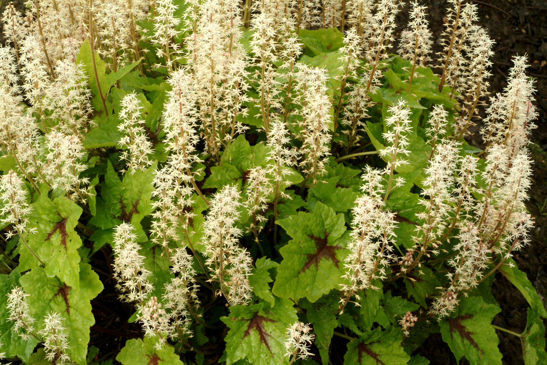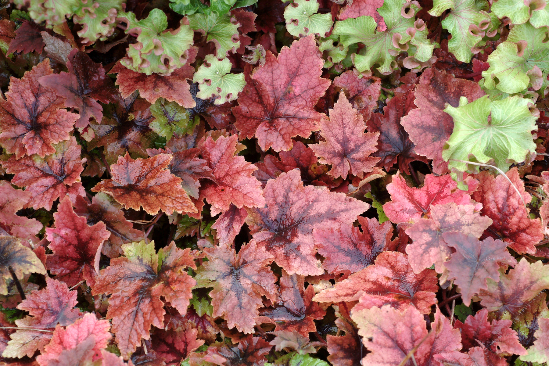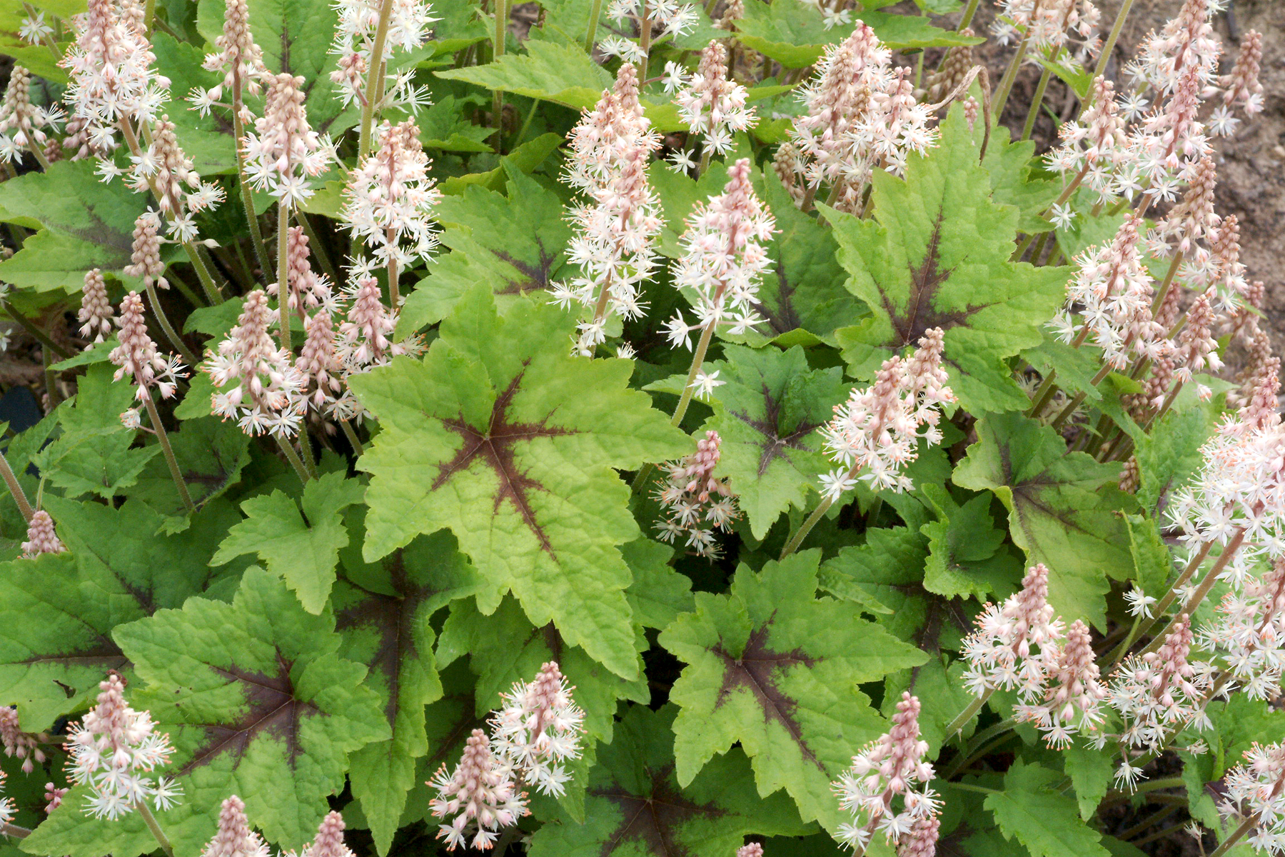 Broad, uncut leaves with a patch as dark as a pirate's heart. It forms a low dense mound with over 250 flower spikes on a mature plant. Good bronze fall color.