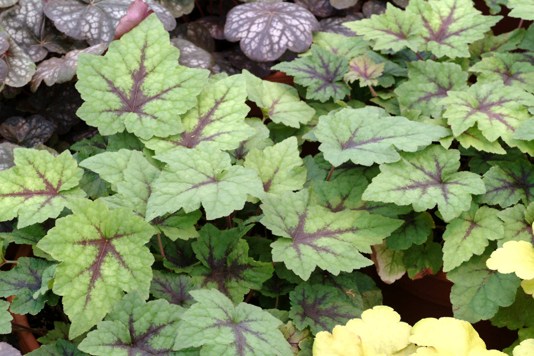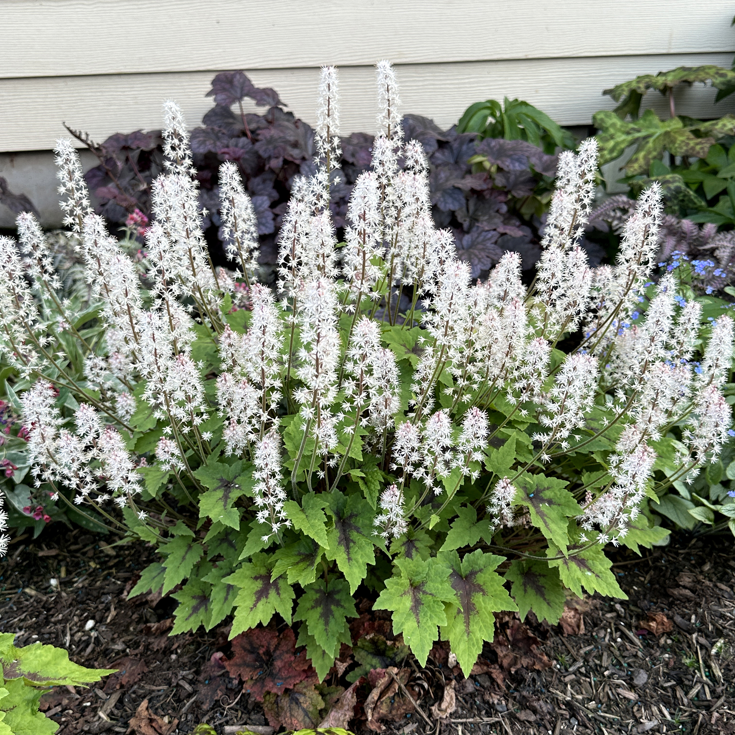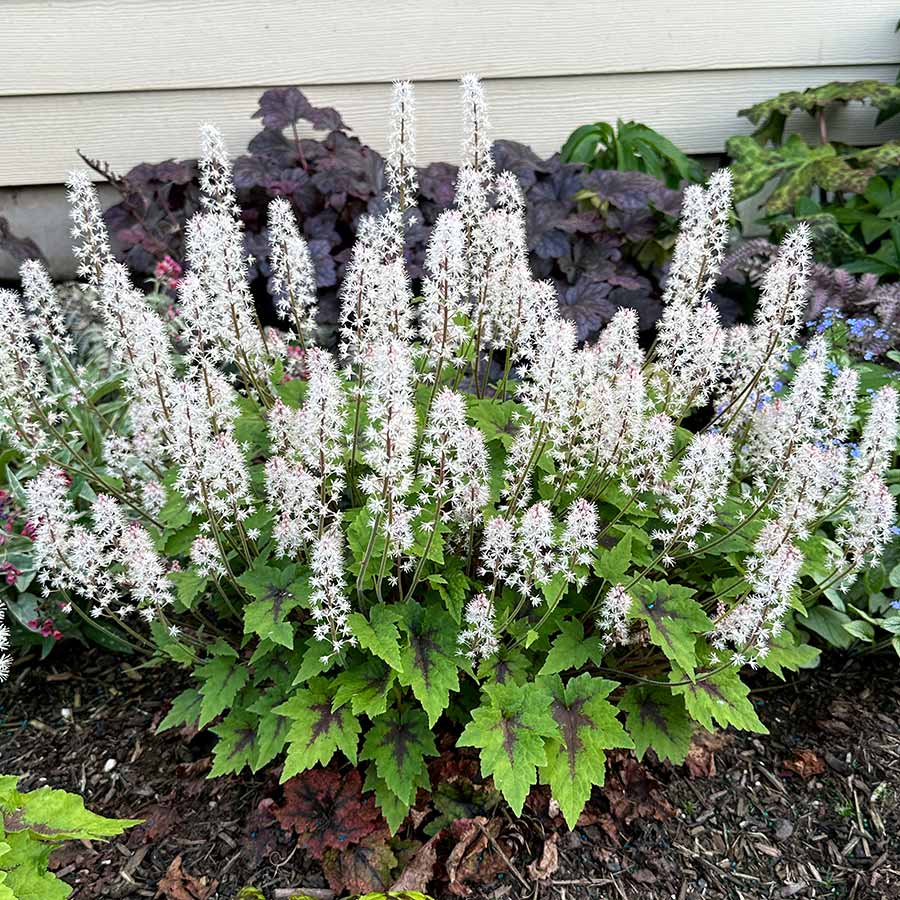 Broad, uncut leaves with a patch as dark as a pirate's heart. It forms a low dense mound with over 250 flower spikes on a mature plant. Good bronze fall color.