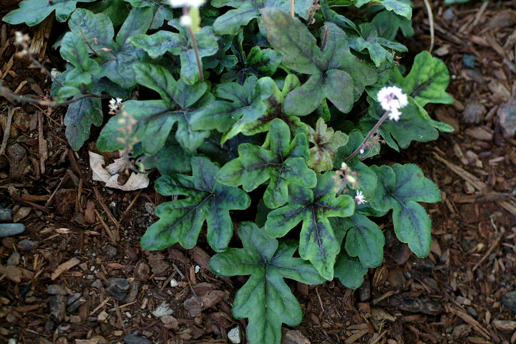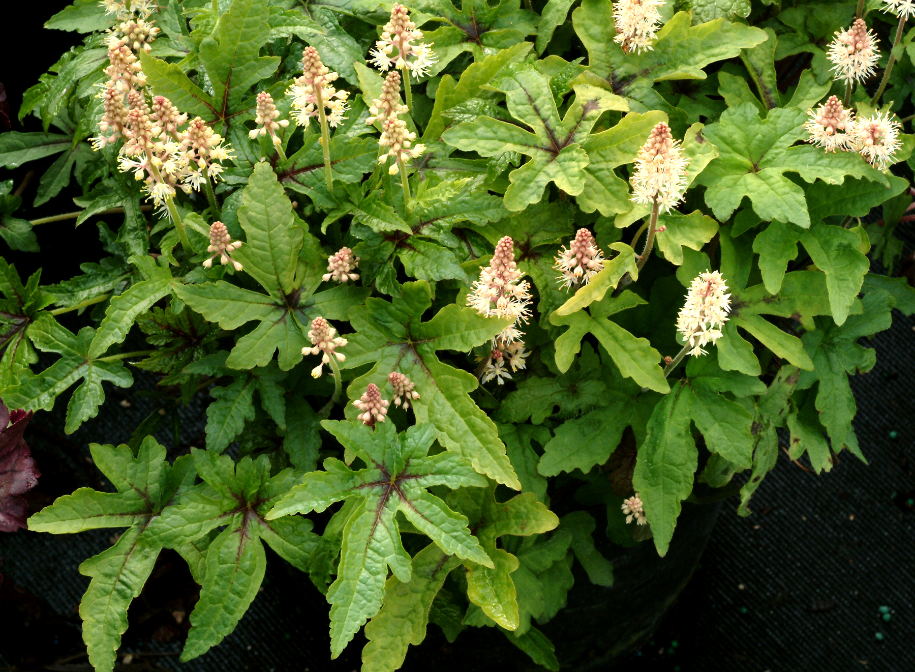 This plant has starfish shaped leaves of green and black, superior winter bronzing, and good re-blooming cream flowers (from pink buds). A compact habit.