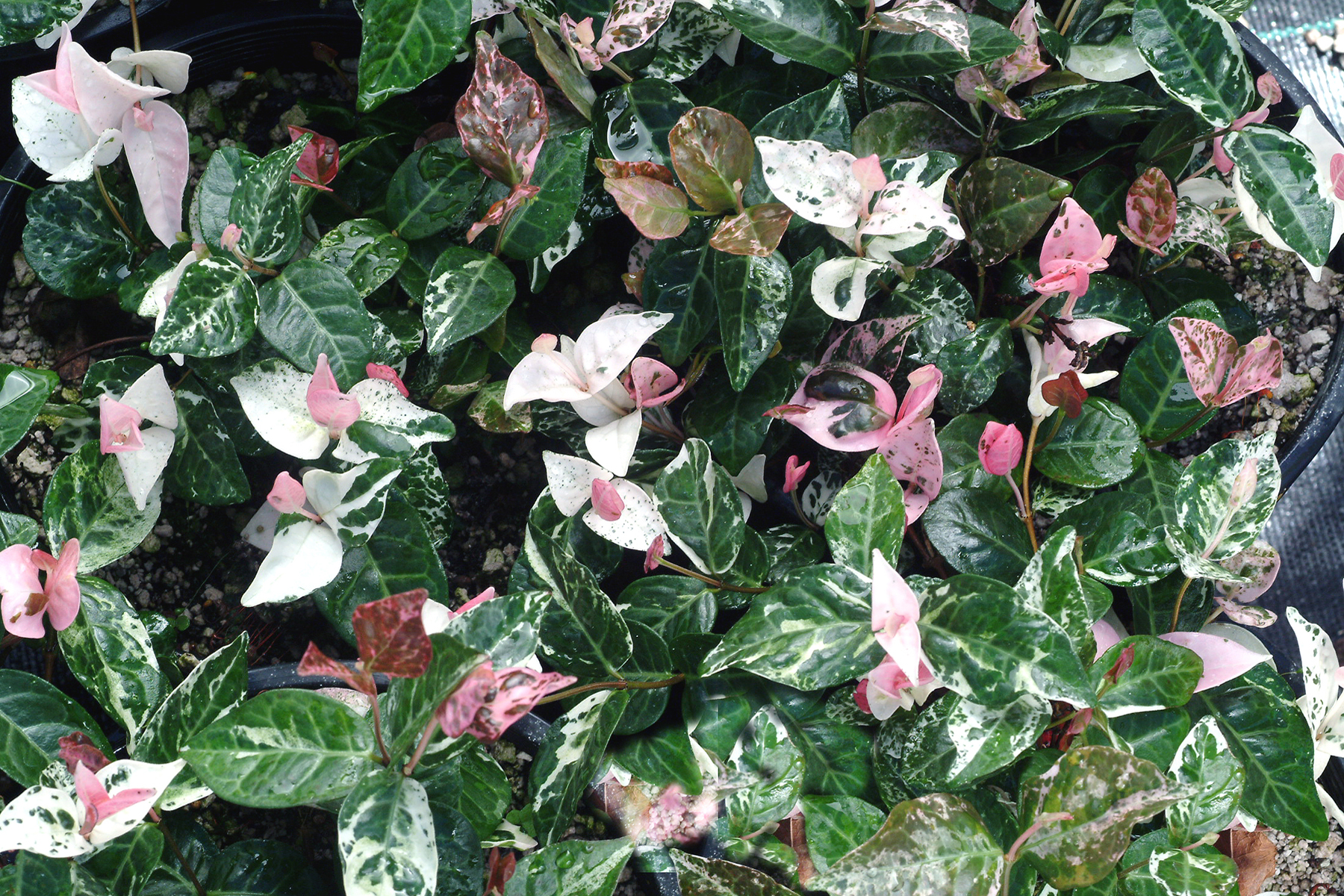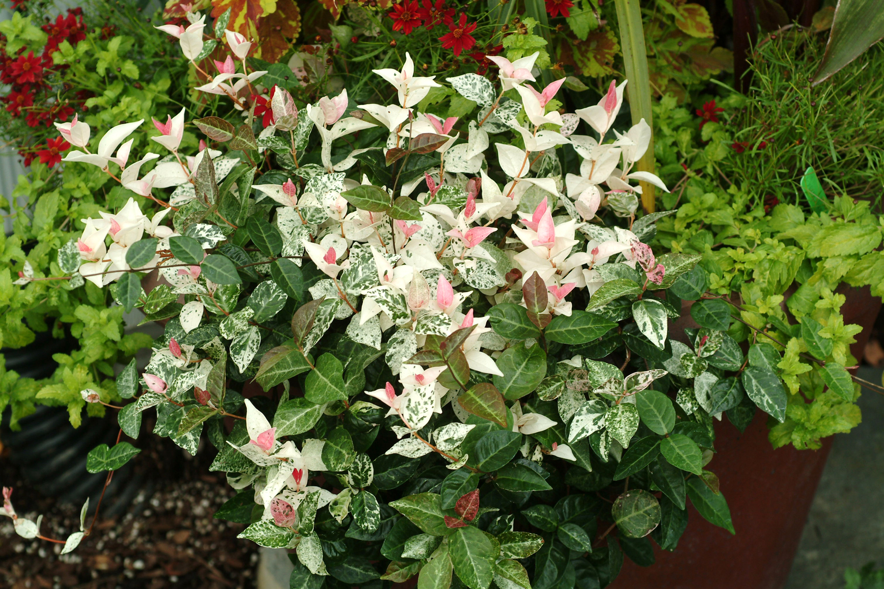 Twining groundcover with fabulous pink new growth which later turns to cream and green spotting. Drought tolerant, loves full sun and a hot head. Fragrant white flowers.