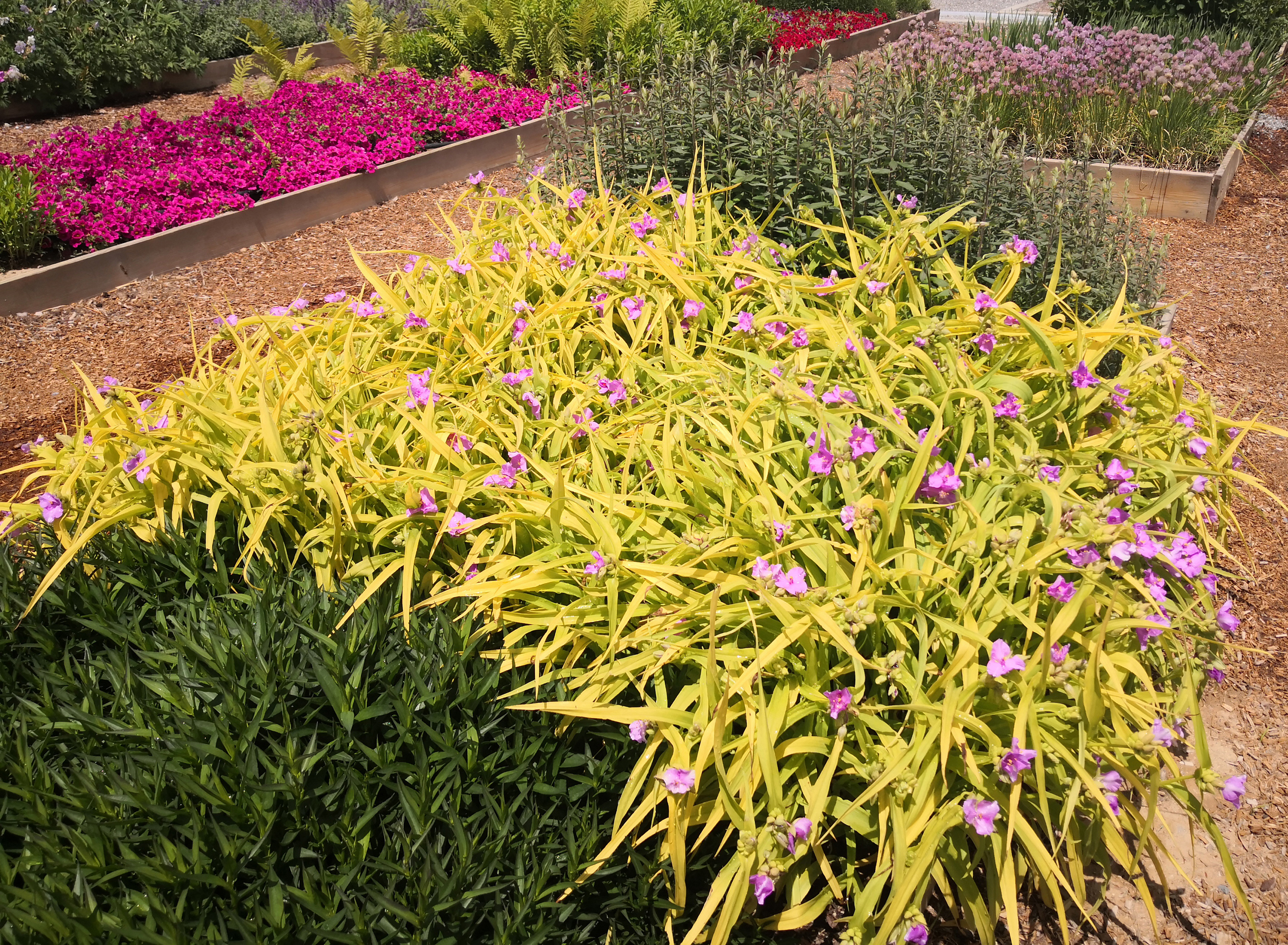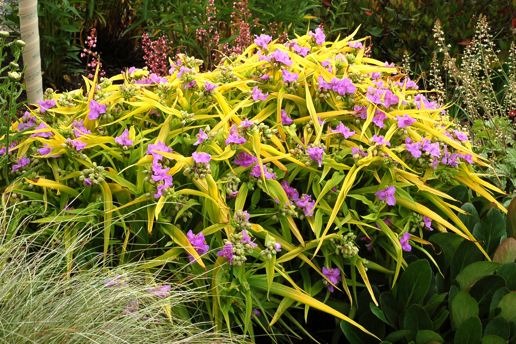 Add a little sunshine to your garden with this spider-wort! Glowing gold foliage creates a lovely foil for the lavender-pink flowers. This vigorous grower is very long blooming and easy to grow. More floriferous and compact than 'Blue and Gold' ('Sweet Kate'). Holds gold color and does not burn in the sun. Place in areas of half to full sun and it will absolutely charm you!