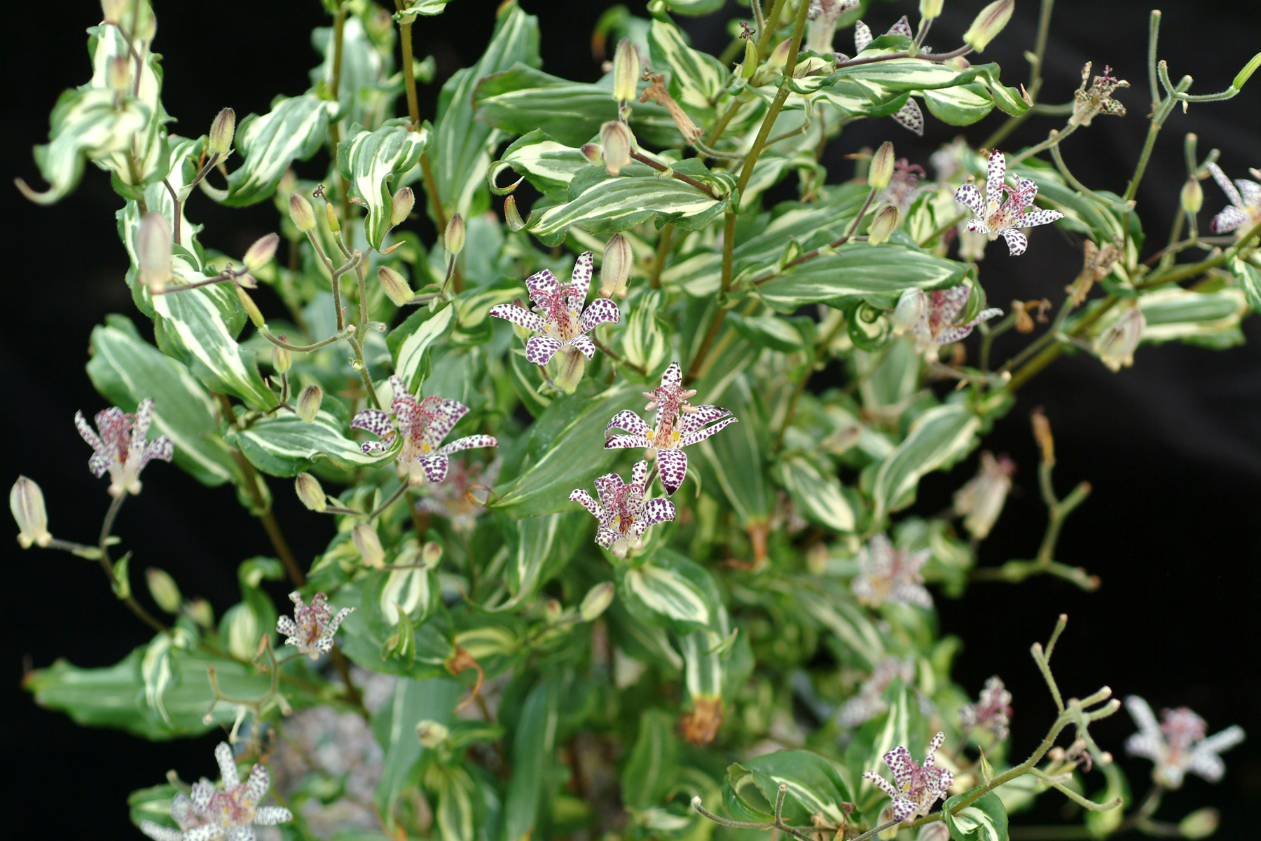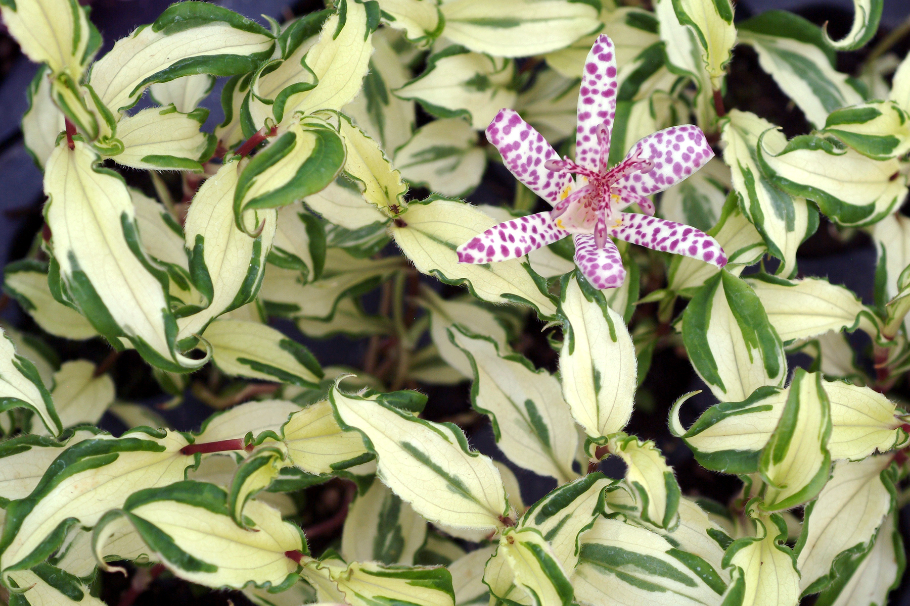 A very elegant sport of T. 'Empress' with cream and deep green variegated leaves and dark stems. The orchid-like flowers are heavily purple spotted over a white base. Flowers from August through September atop a compact plant. Prefers moist, woodland conditions. The Japanese will hold this one high! The roots need to be warm for the leaves to express the variegation.