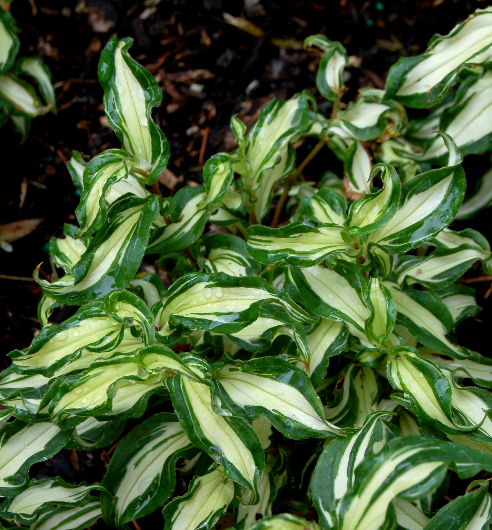 This toad lily is one that we found hiding amongst our stock of Tricyrtis 'Imperial Banner'. While similar to its parent, T. 'White Waves' has none of the green streaking in the middle of the creamy central part of the leaf. This results in a more dramatic leaf variegation but slightly less vigor. For us, the 15″ tall clumps are topped in early October with attractive purple-spotted flowers… very stunning! ” (from Plant Delights Catalog 2008)