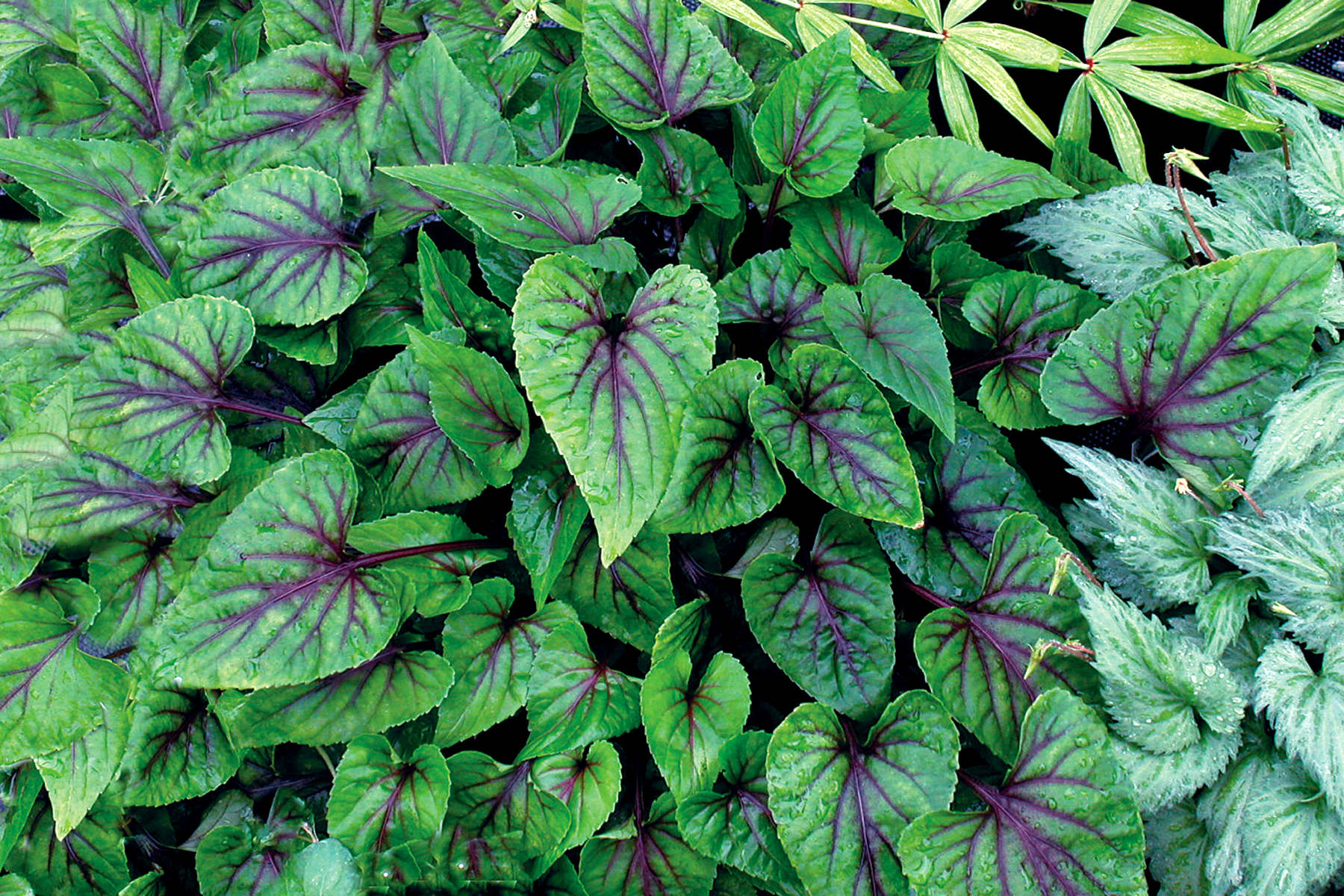 This plant has wonderful large leaves with dark purple centers that extend out into the veins. Lavender flowers are produced in mid-spring. Does not seed about.